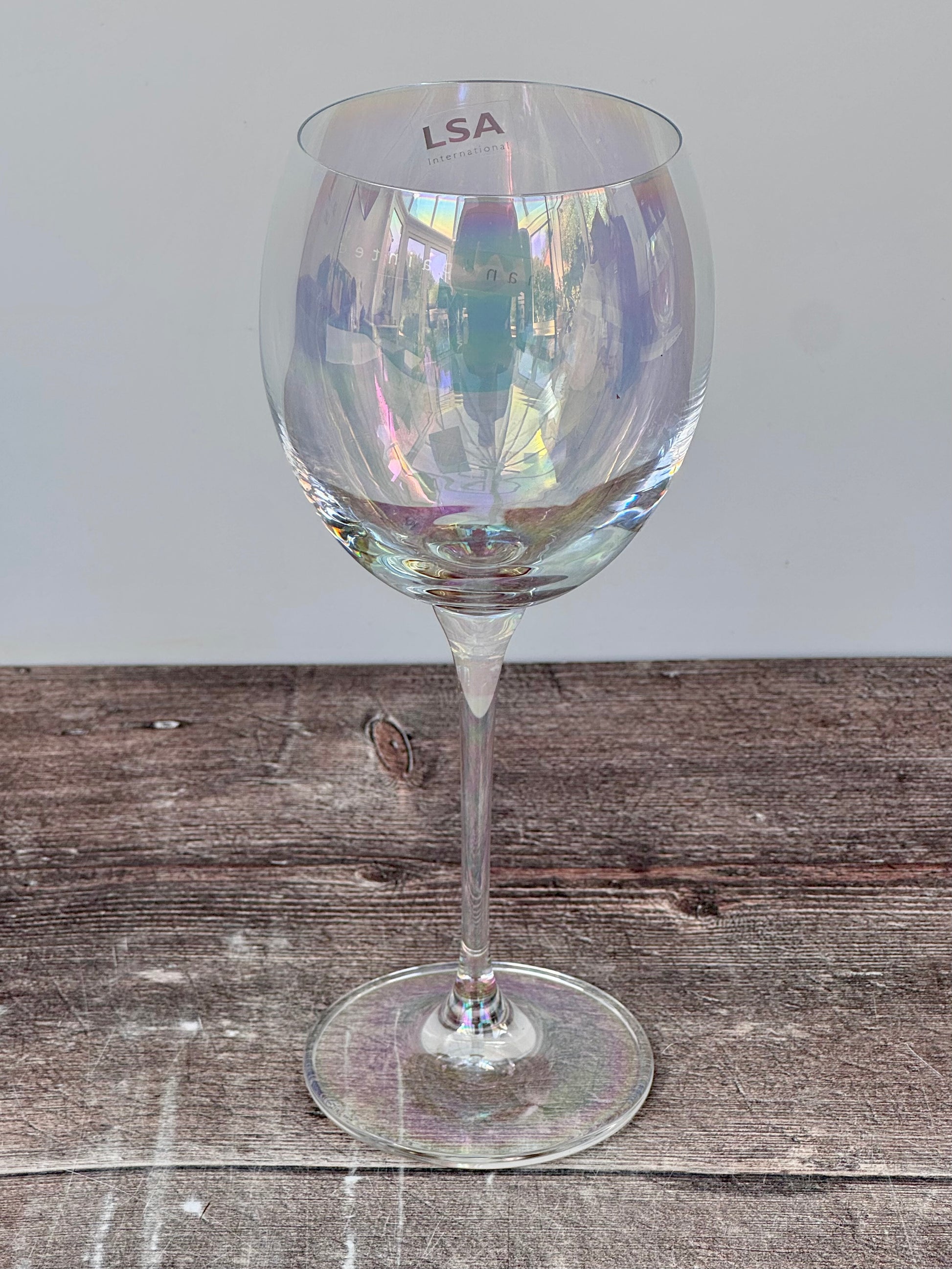 This set of two polka wine glasses are handpainted with a pearlescent lustre. The simple curved bowl of the glass is enhanced by the iridescent finish.