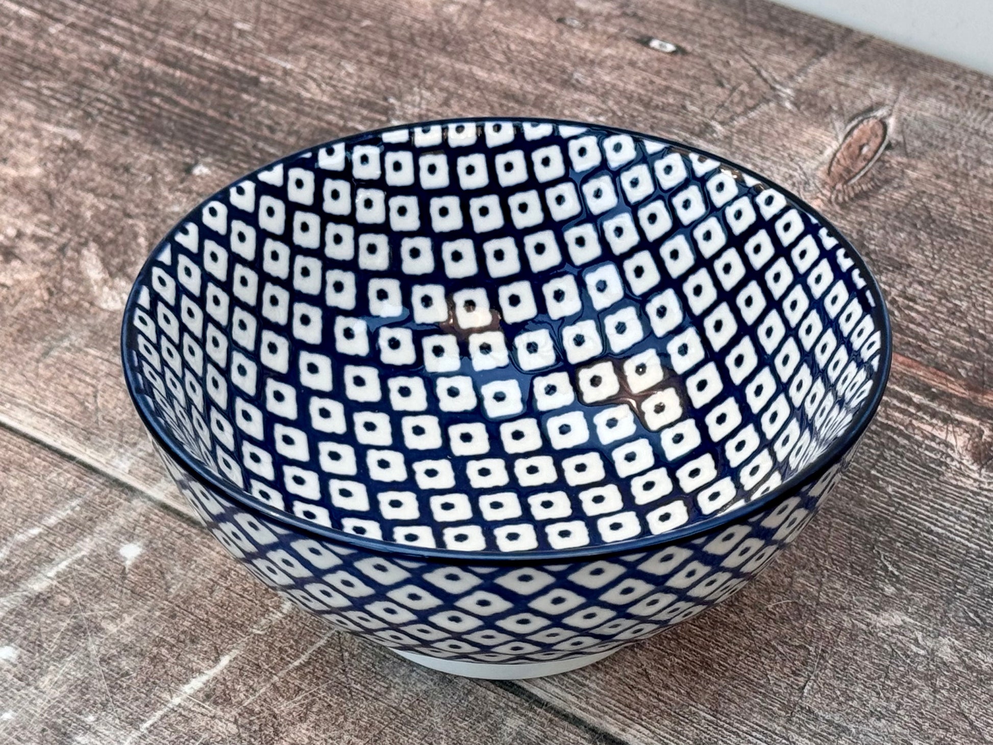 With a blue and white square and spot design, these bowls make a stunning addition to any table.