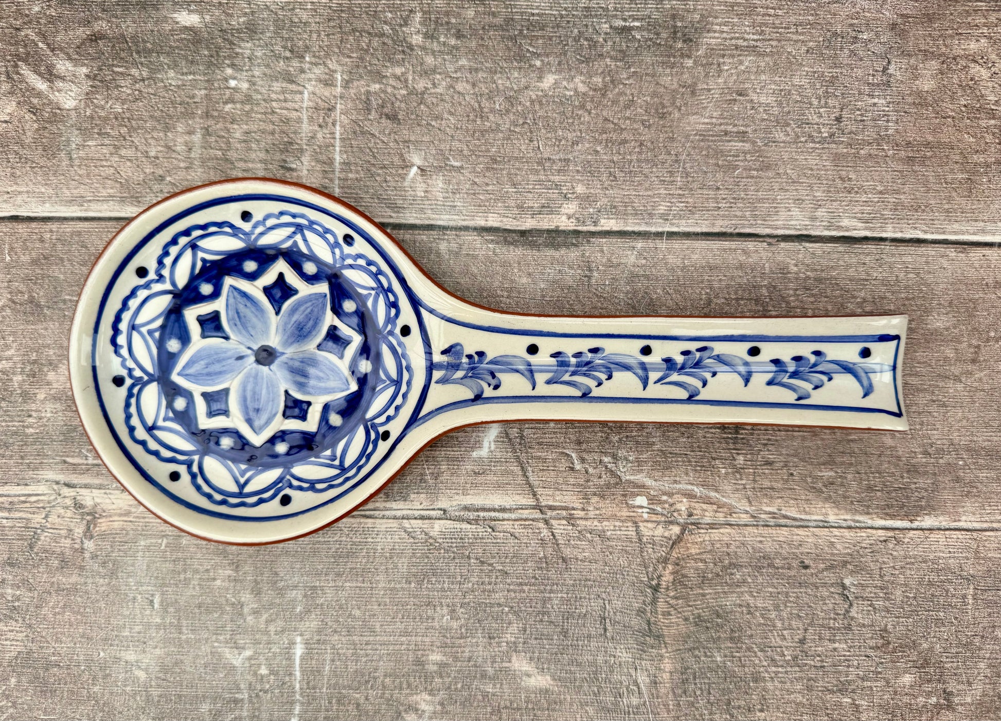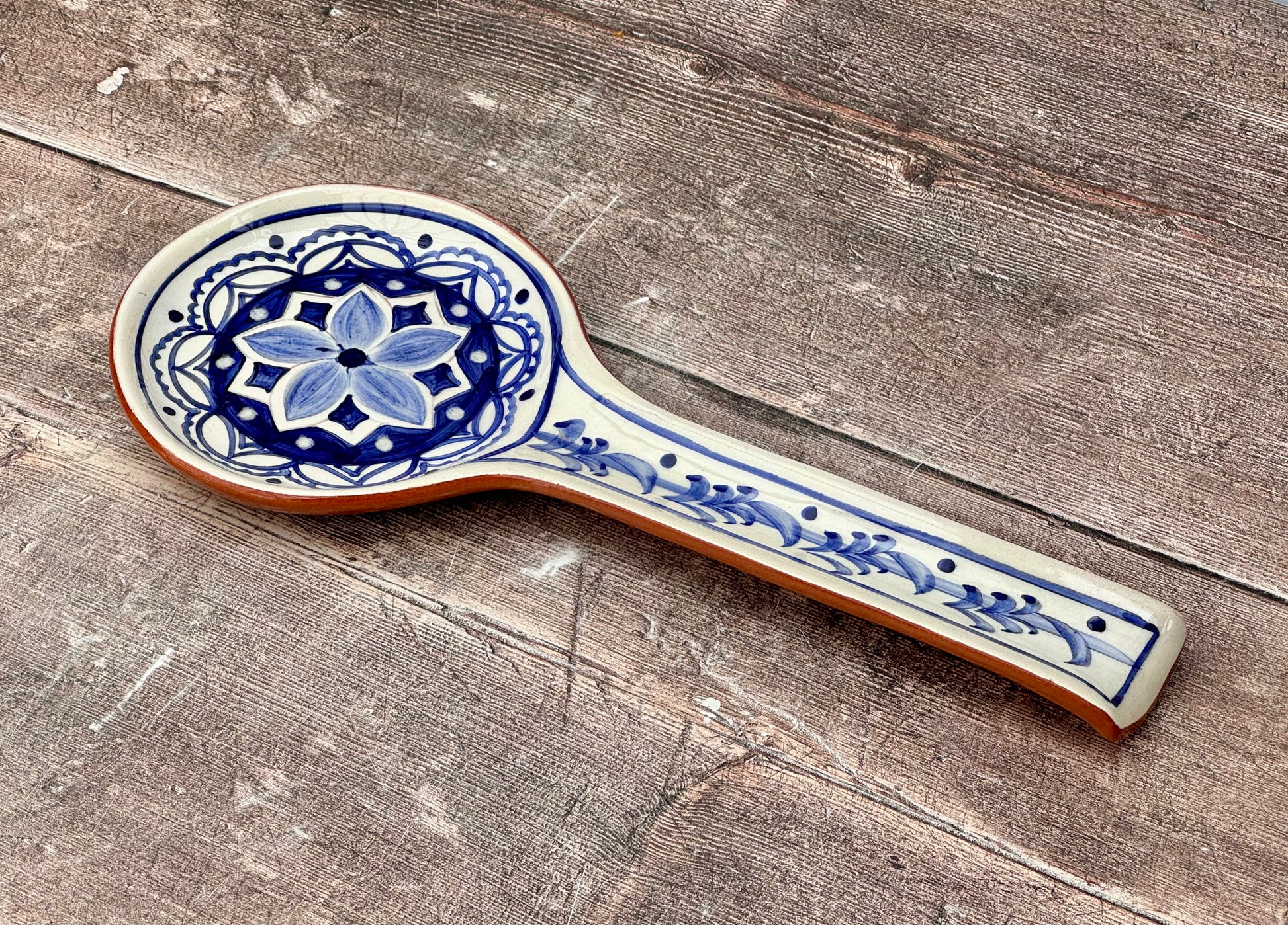 This spoon rest has a blue and white pattern. Add a touch of style to your kitchen with this spoon rest.