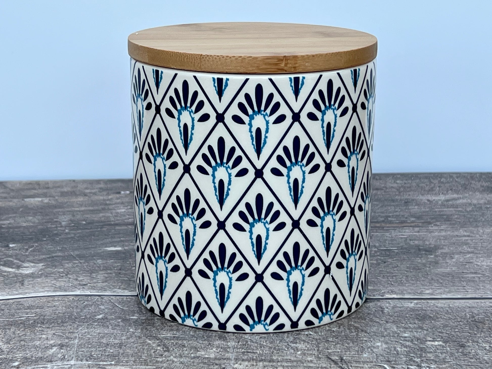 A ceramic storage container, with a blue and white patterned design and wooden lid.