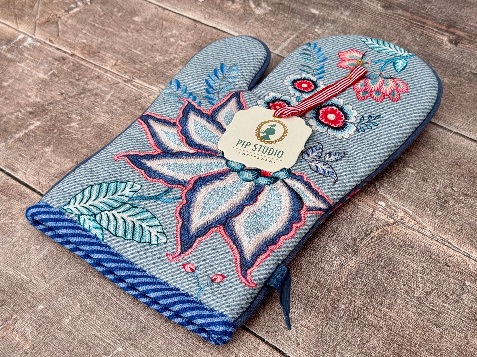 In blue, this flower patterned oven glove is both beautiful and practical.