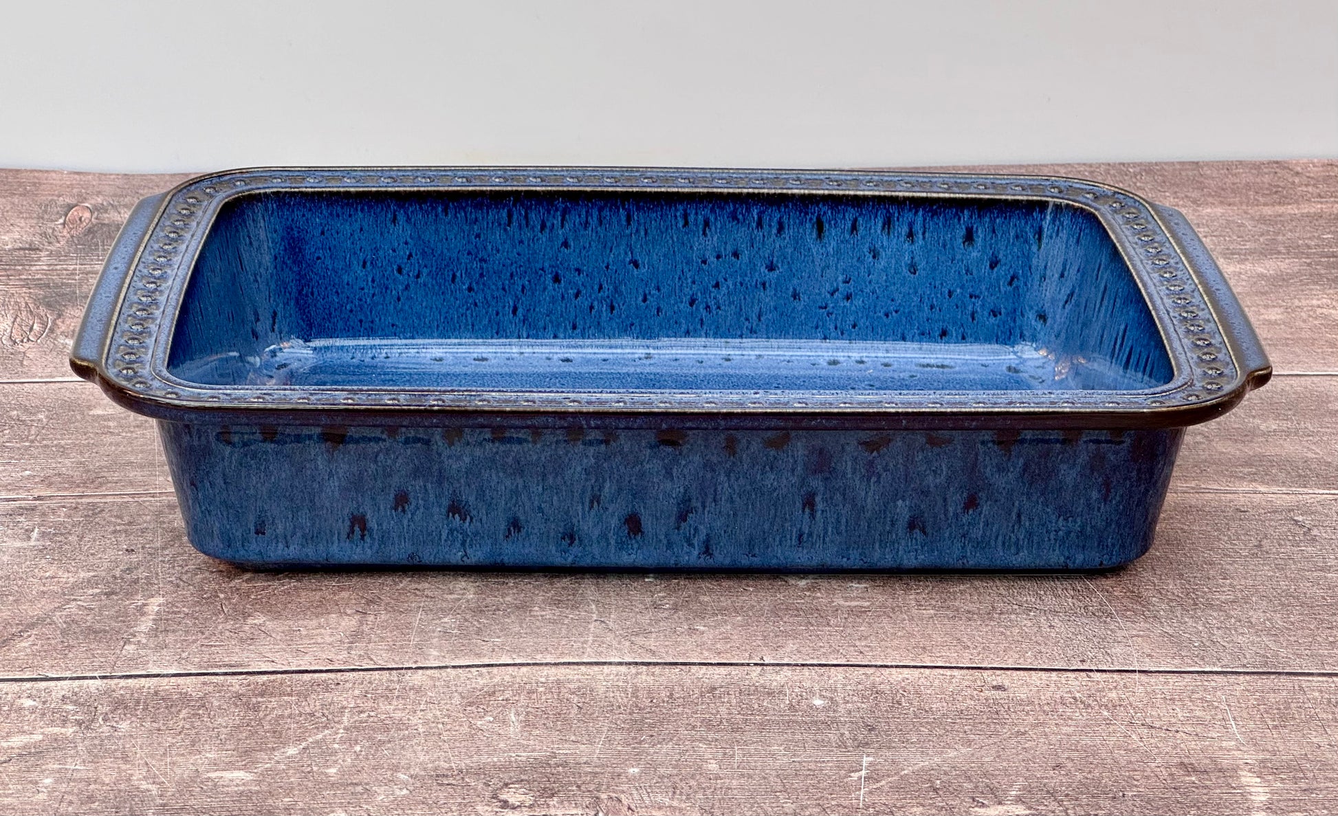 This blue rectangular baking dish has a spot design on the outer edge, making it great to go from oven to table.