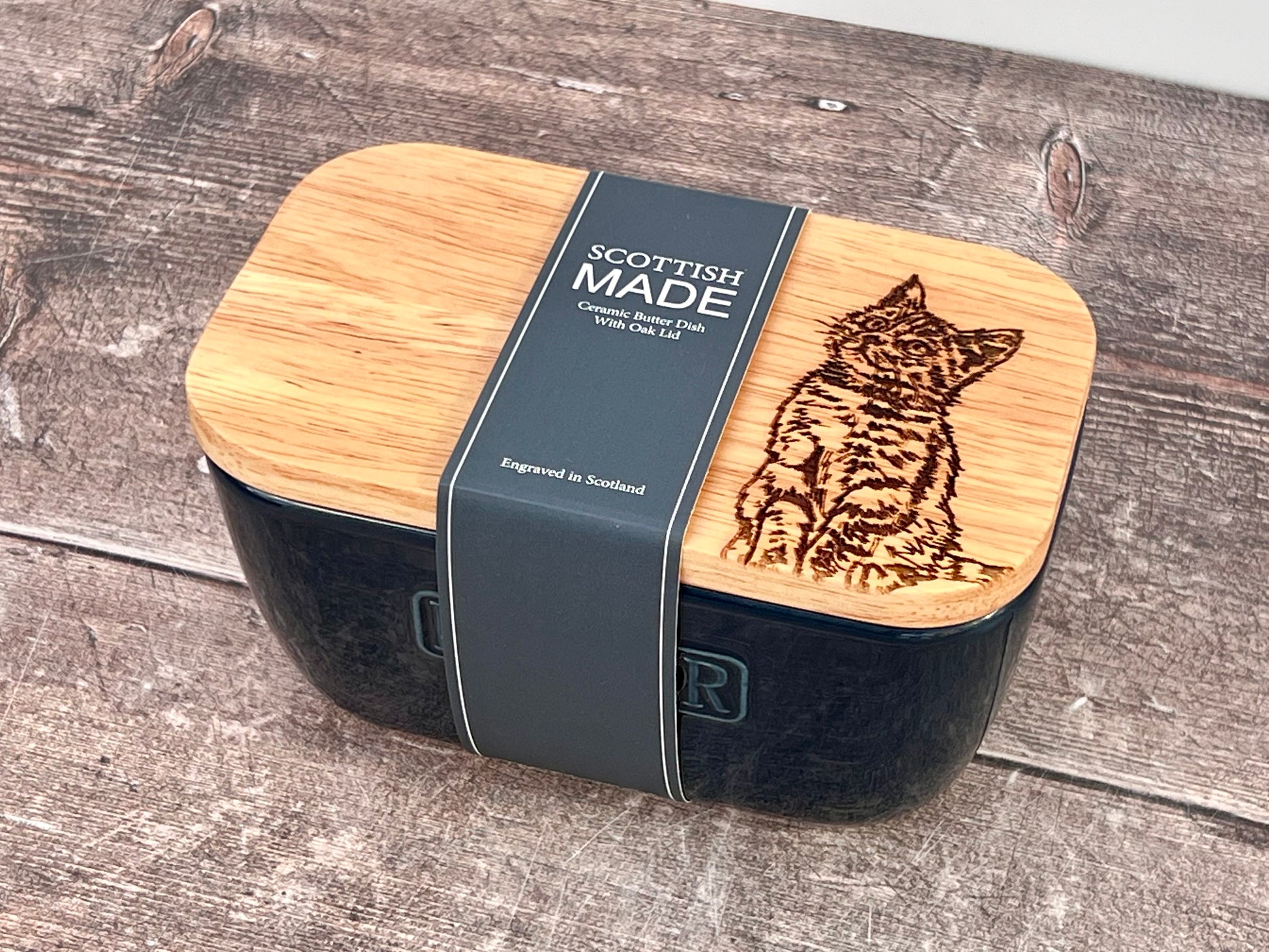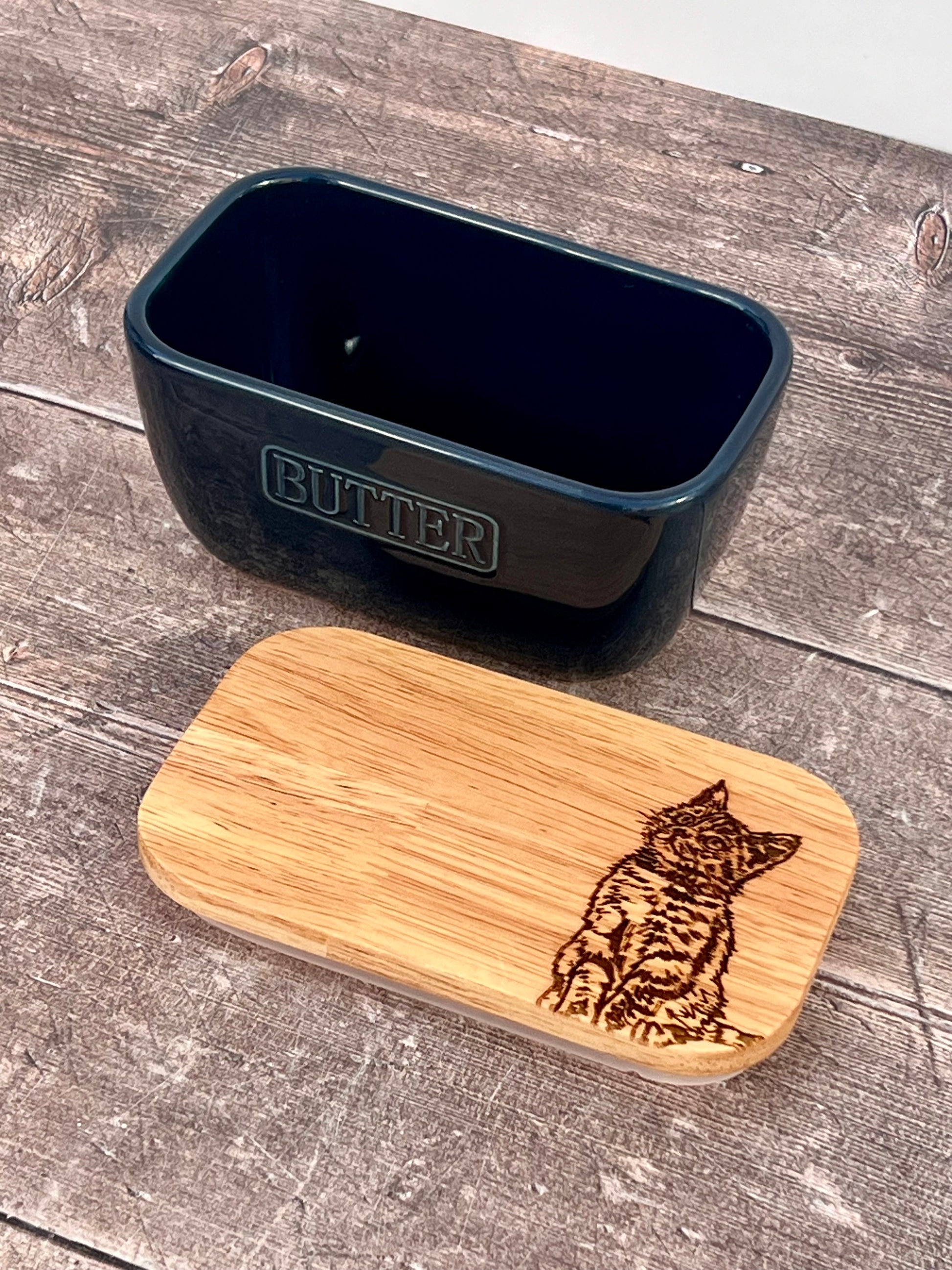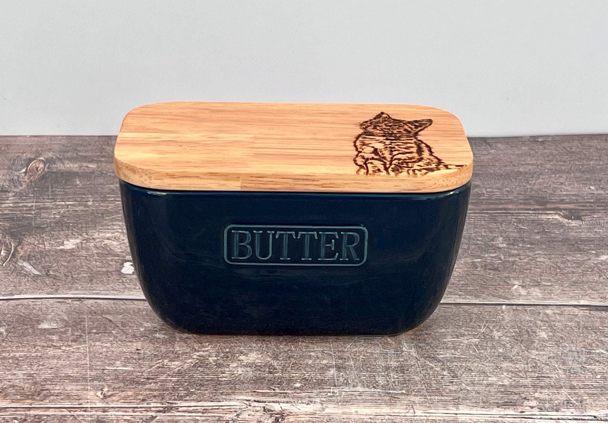 Engraved with a cat, this blue butter dish brings a homely touch to the kitchen.