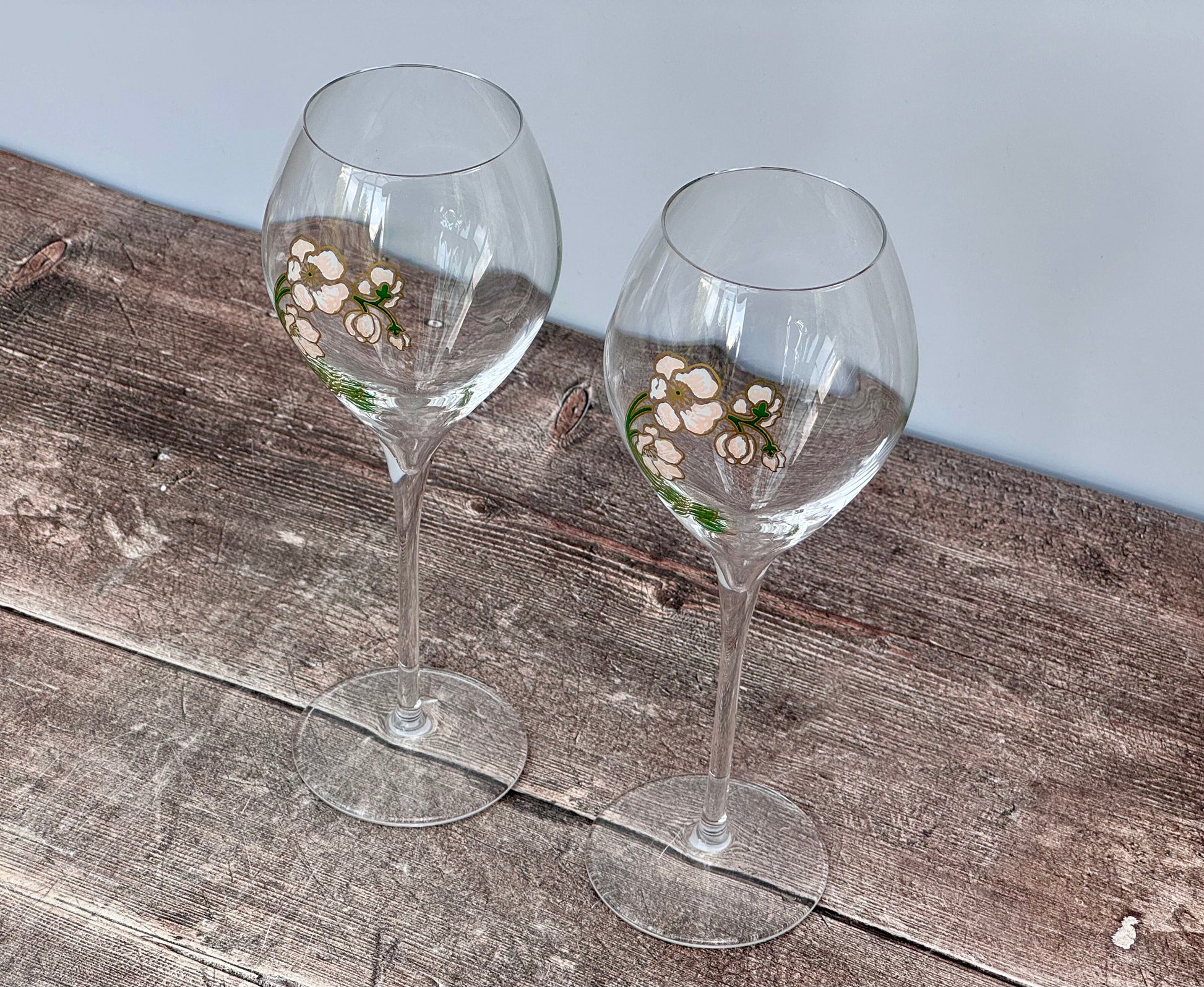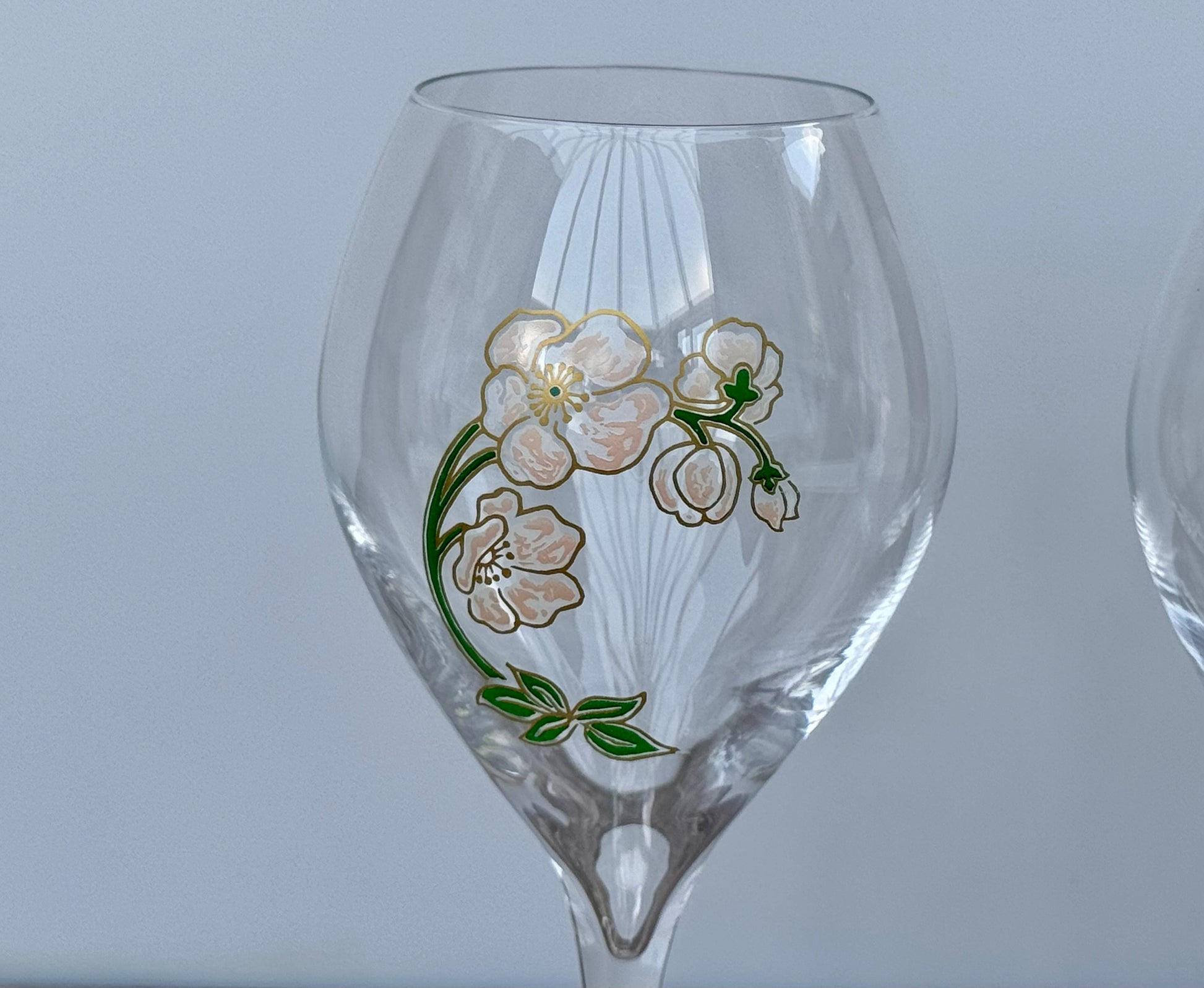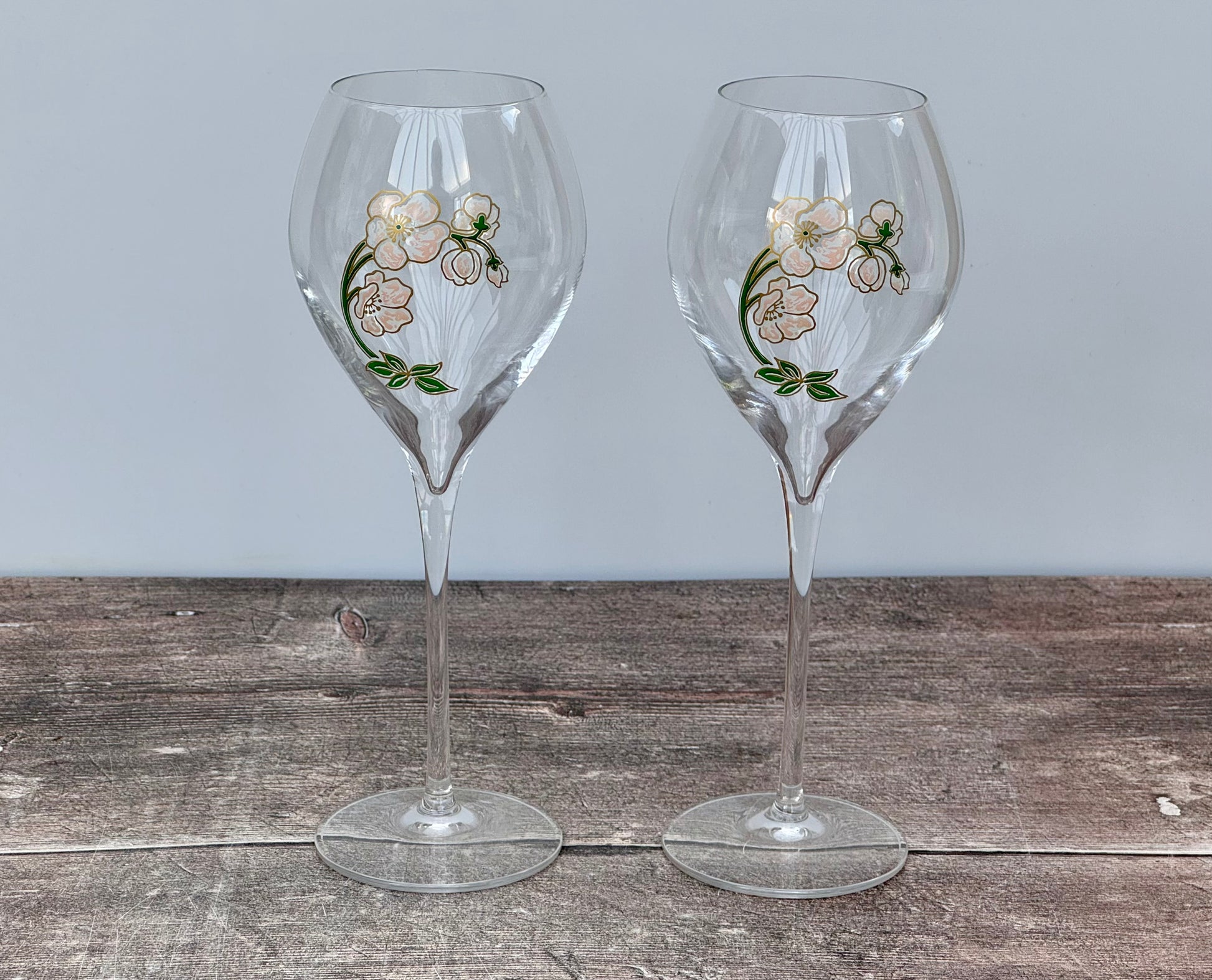 A pair of lead free crystal glasses from Perrier Jouet with the iconic Belle Epoque flower detail