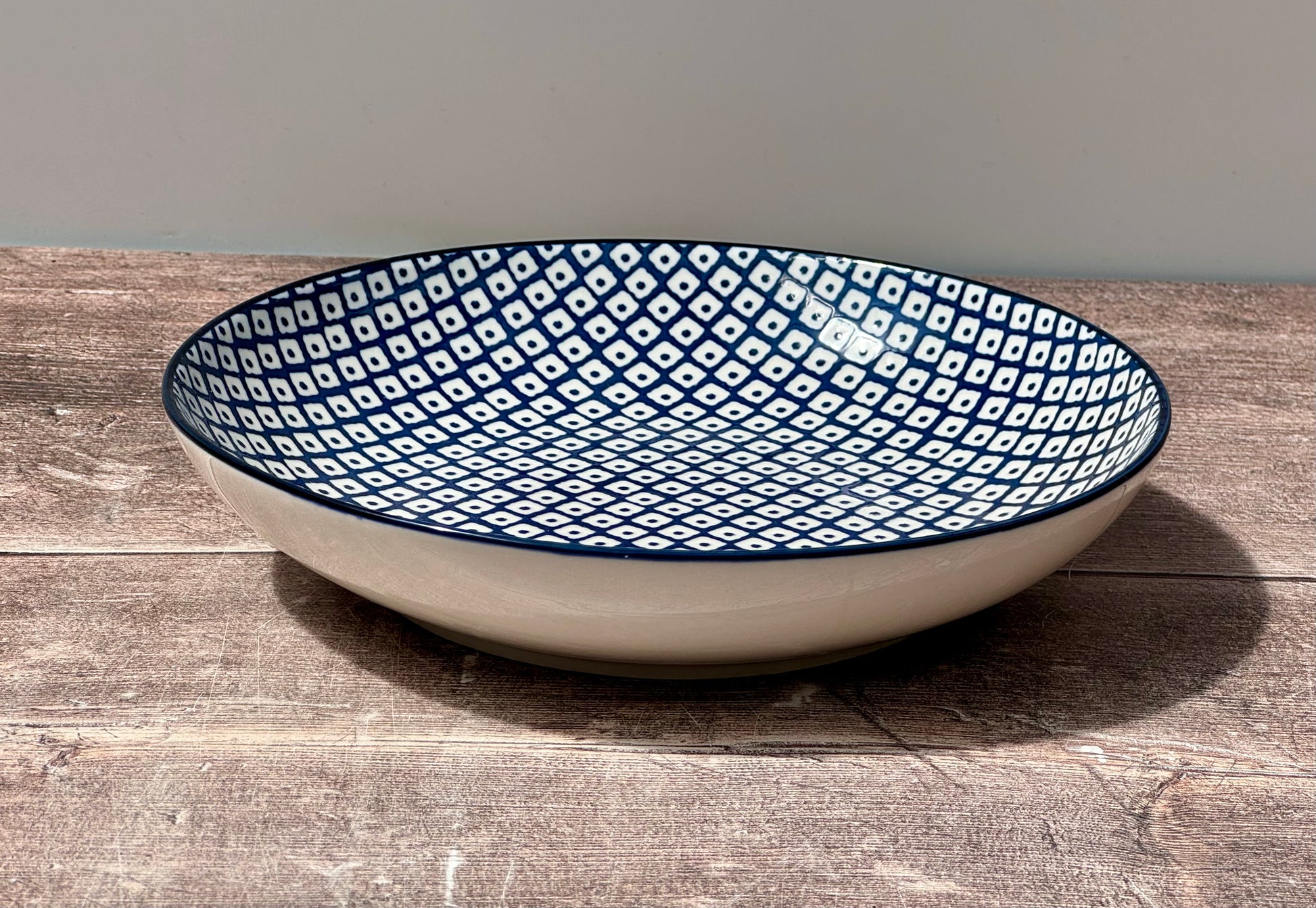 With a blue and white square and spot design, these shallow bowls make a stunning addition to any table.