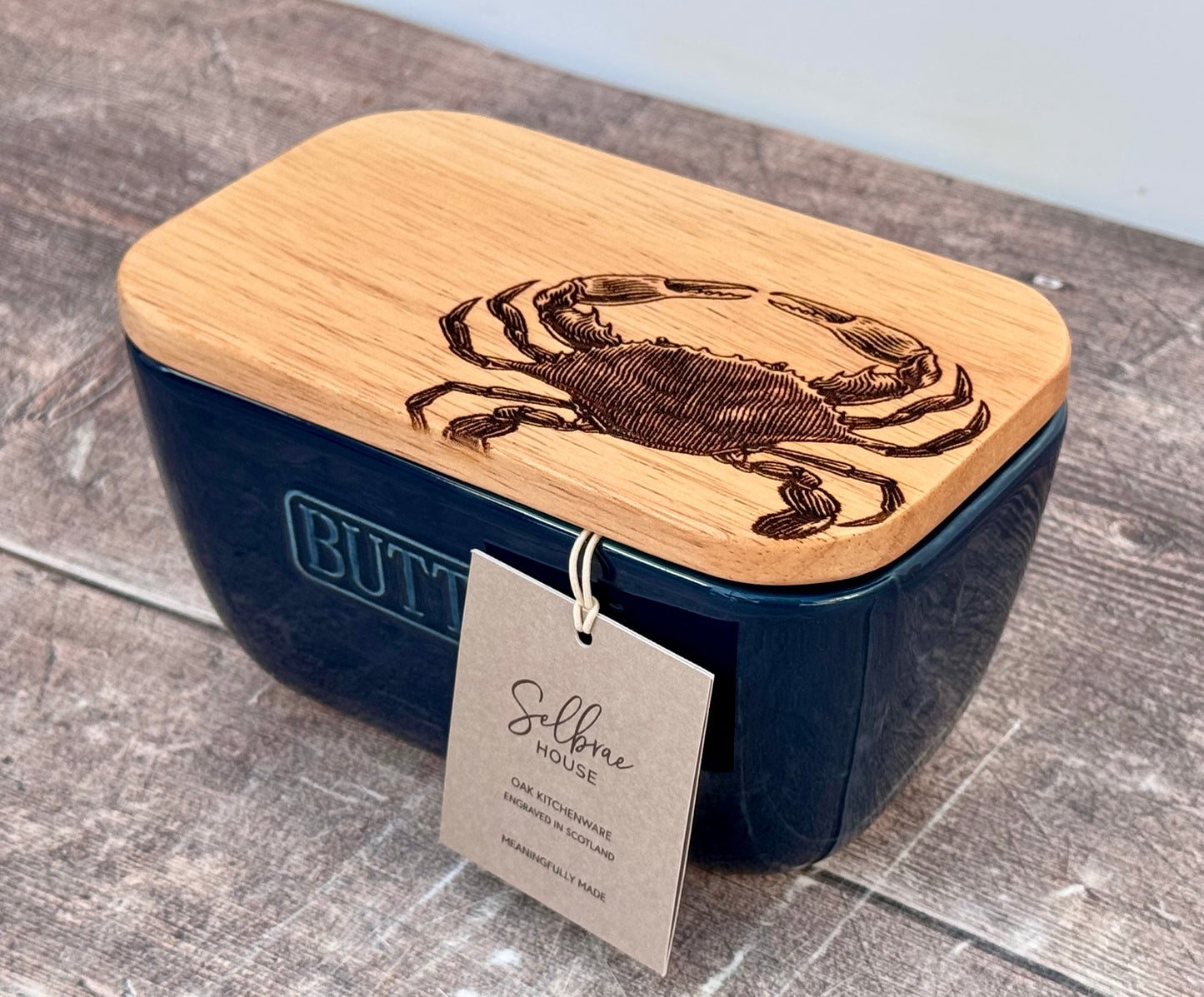 Engraved with a crab design, this blue butter dish brings a homely touch to the kitchen.
