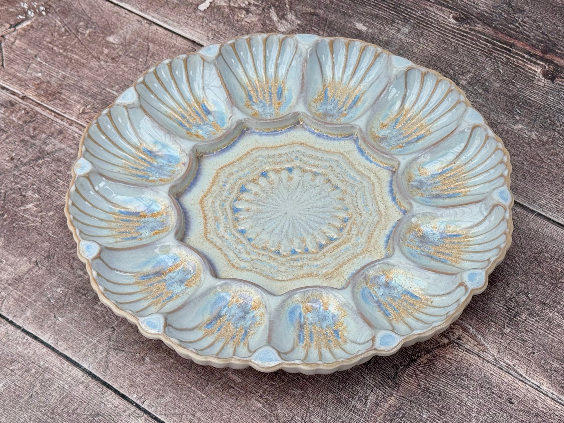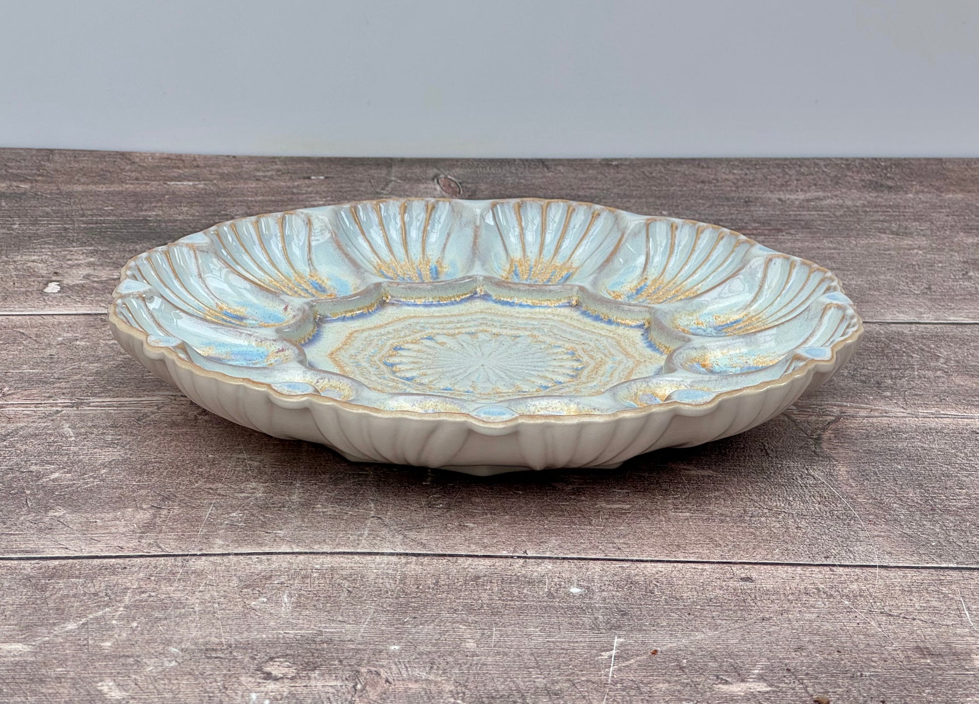 In a beige colour with blue, purple and gold detailing, this is a striking appetiser serving platter.