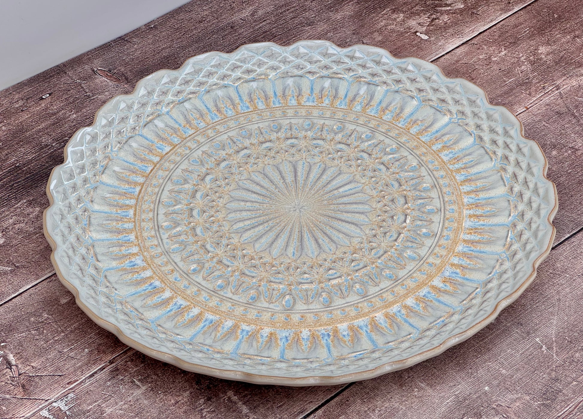 In a beige colour with blue, purple and gold detailing, this is a striking large serving platter.