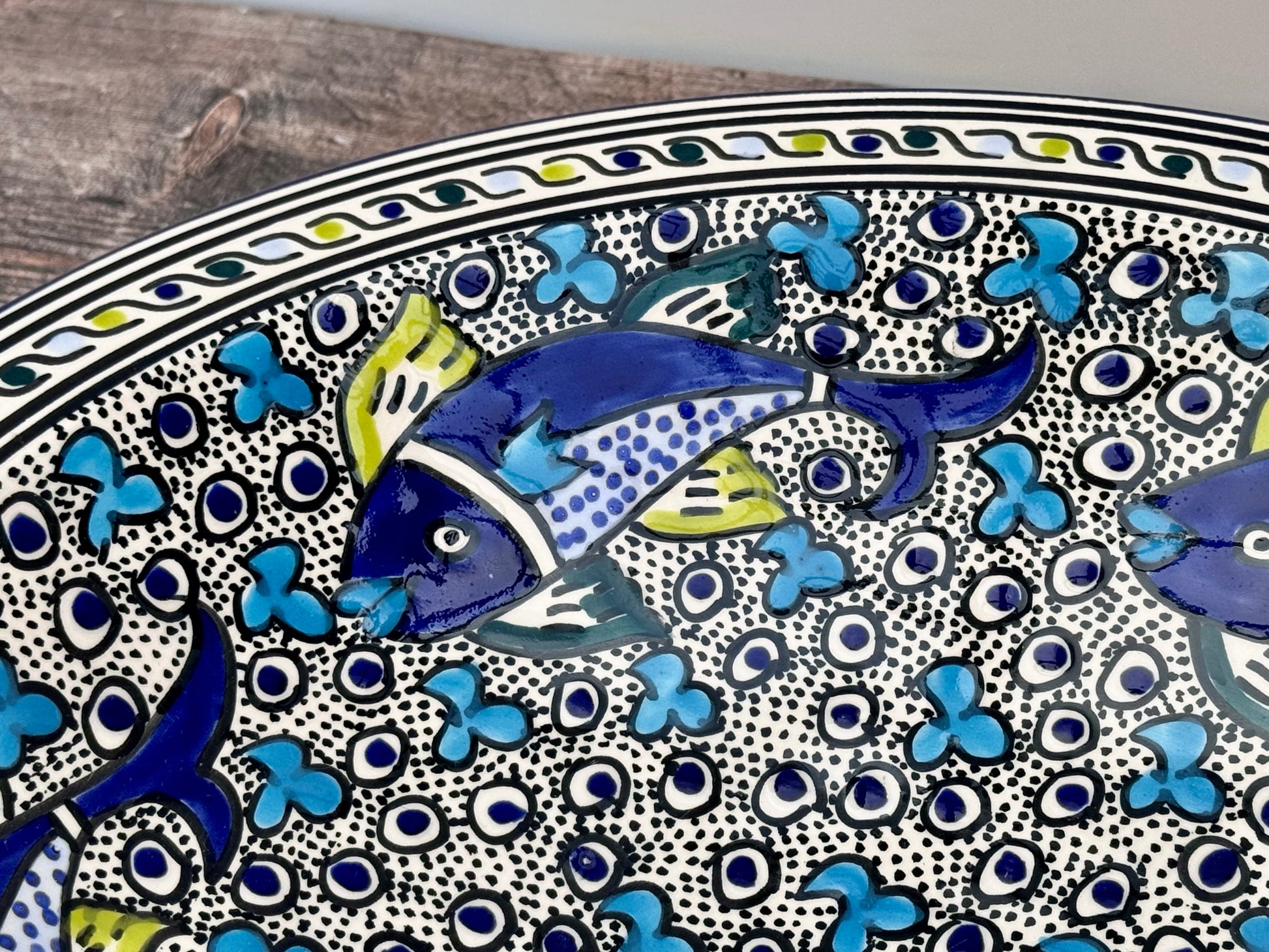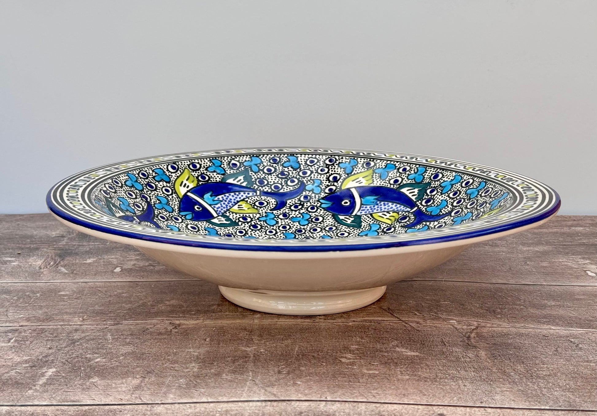 Dark Blue Fish Patterned Bowl with Flat Rim, 38cm