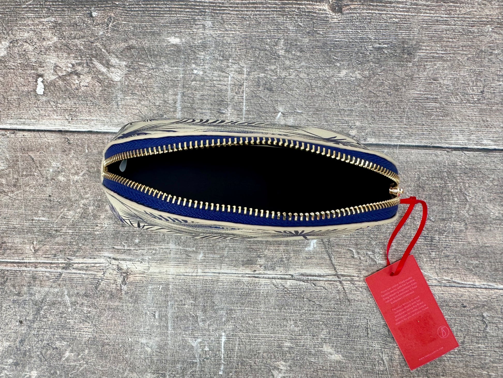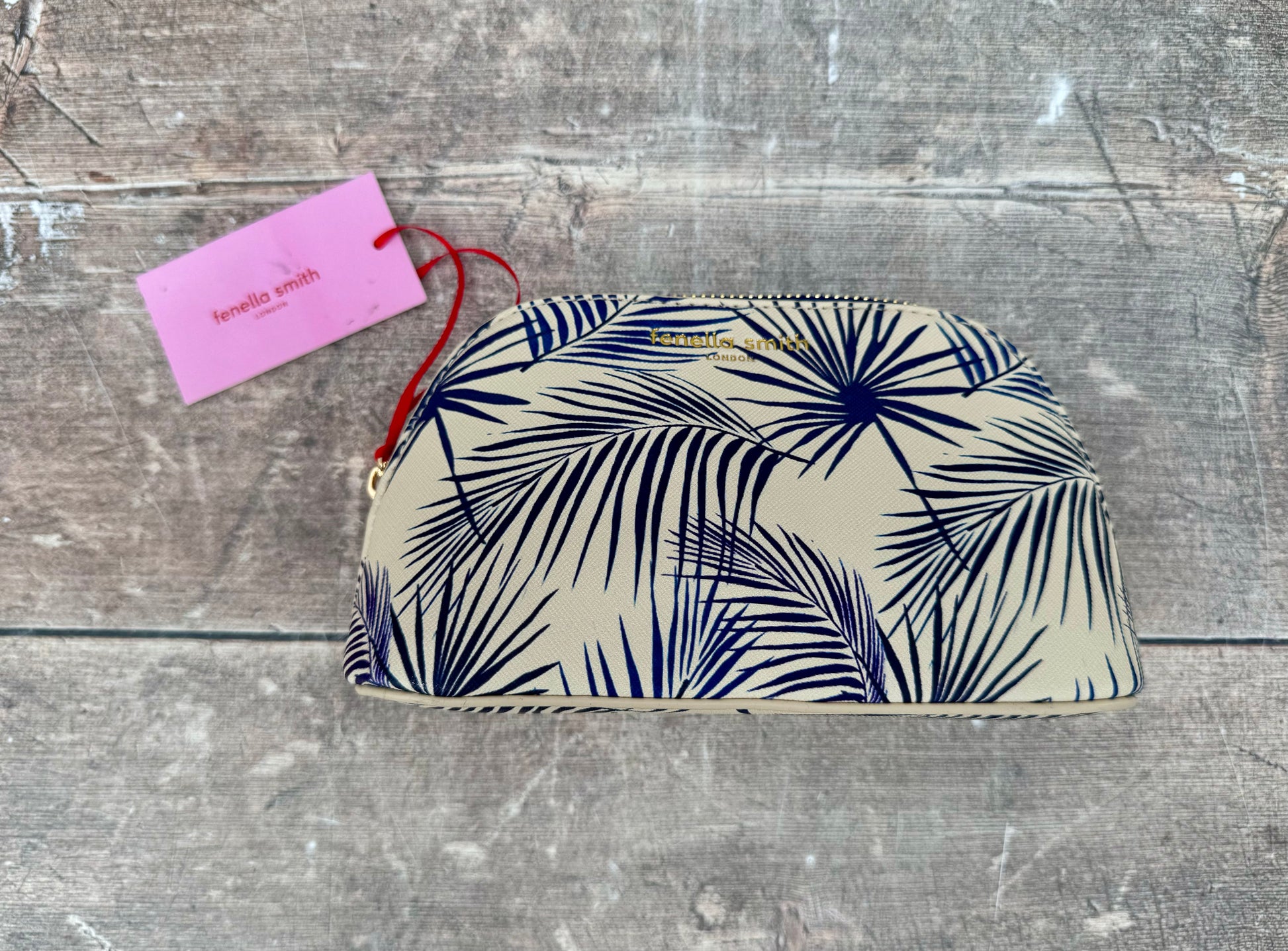 A beautiful make up / cosmetic bag from Fenella Smith with a purple tropical leaf design.
