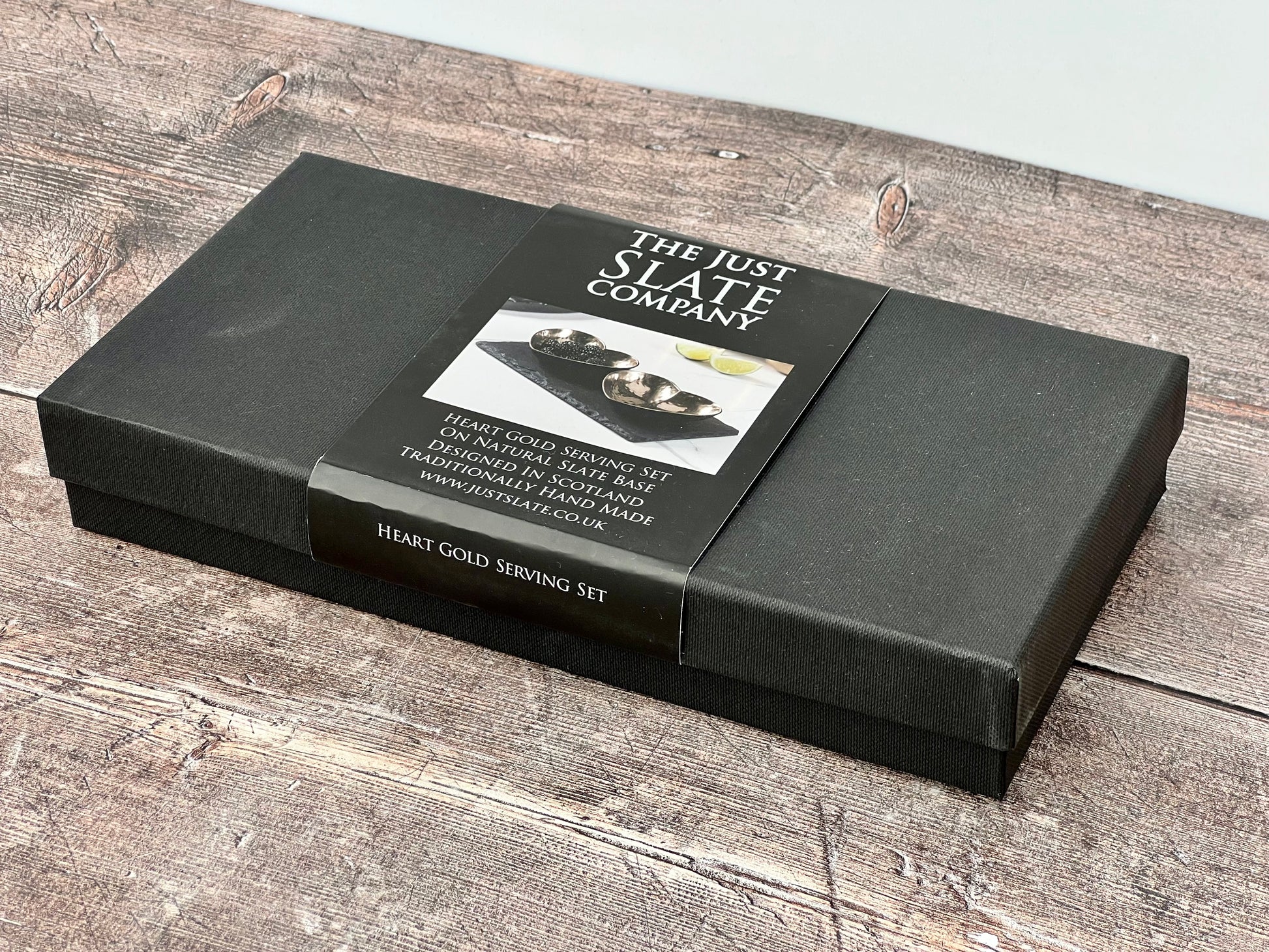 Featuring a slate base and 2 hand hammered, heart-shaped gold interior and black exterior bowls, this set is perfect for serving up a variety of dips or sauces.