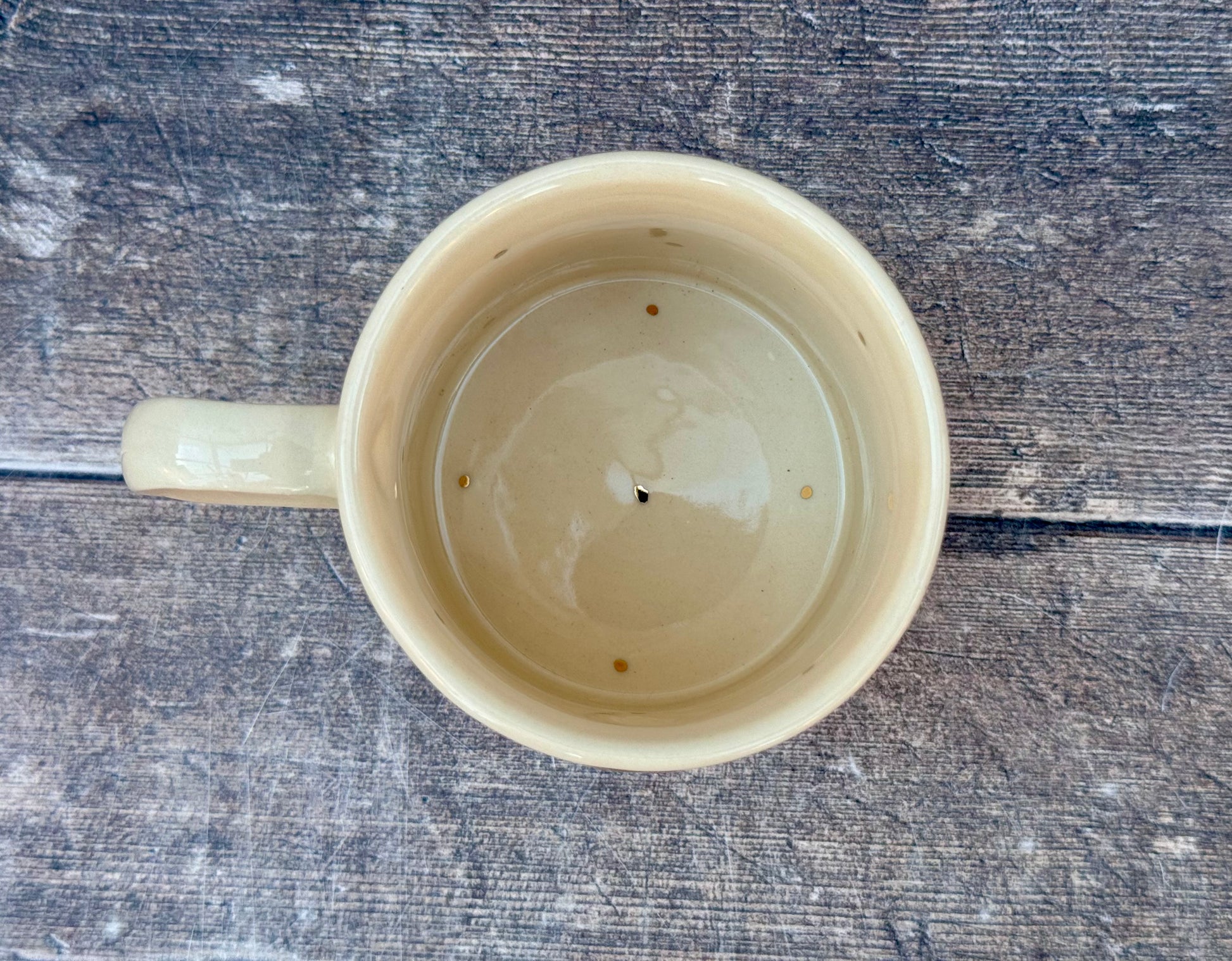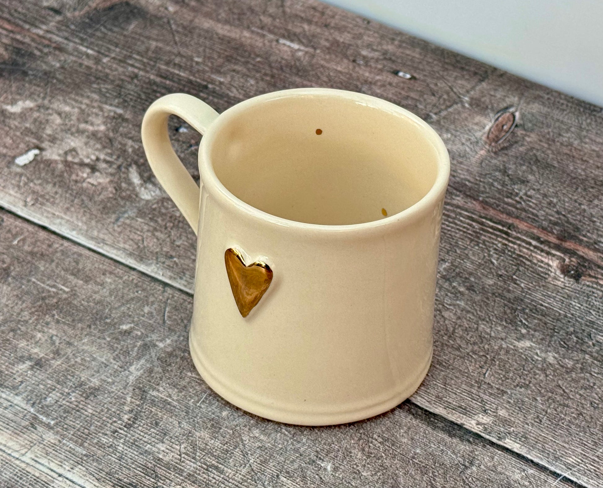 These sweet mugs have a gold heart design on one side and ggold spots on the inside.