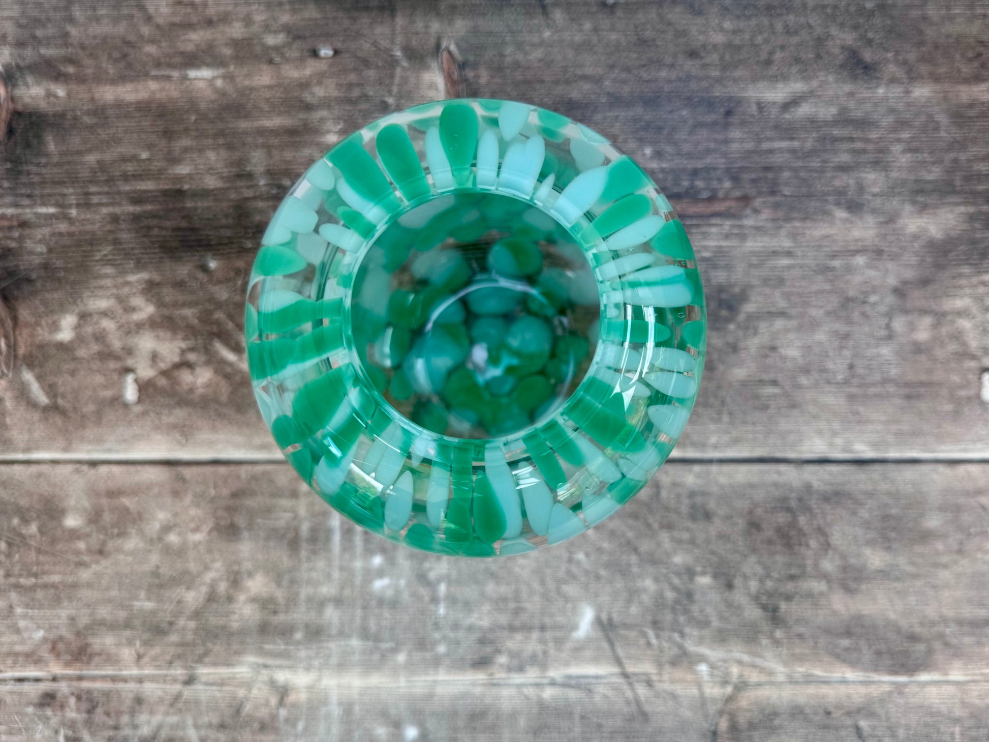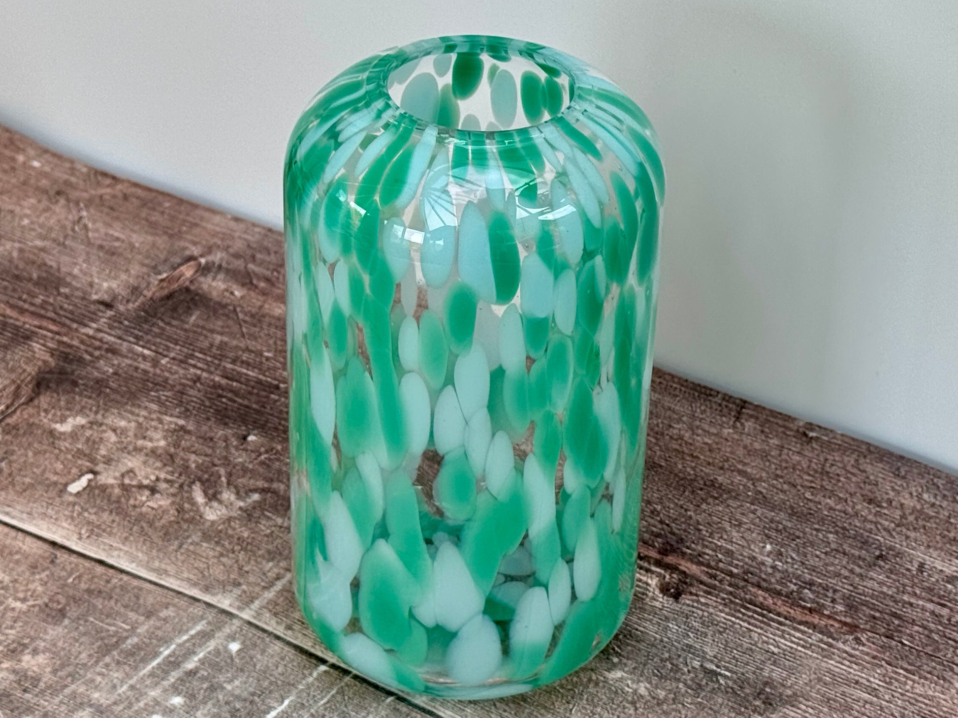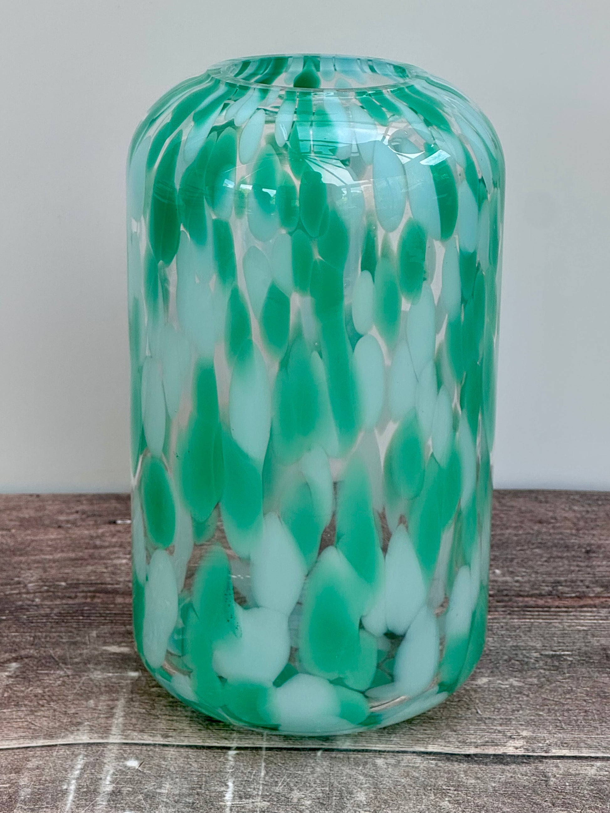 Mouth blown and handmade by skilled craftsmen, this green speckled glass vase will add a striking touch to your table.