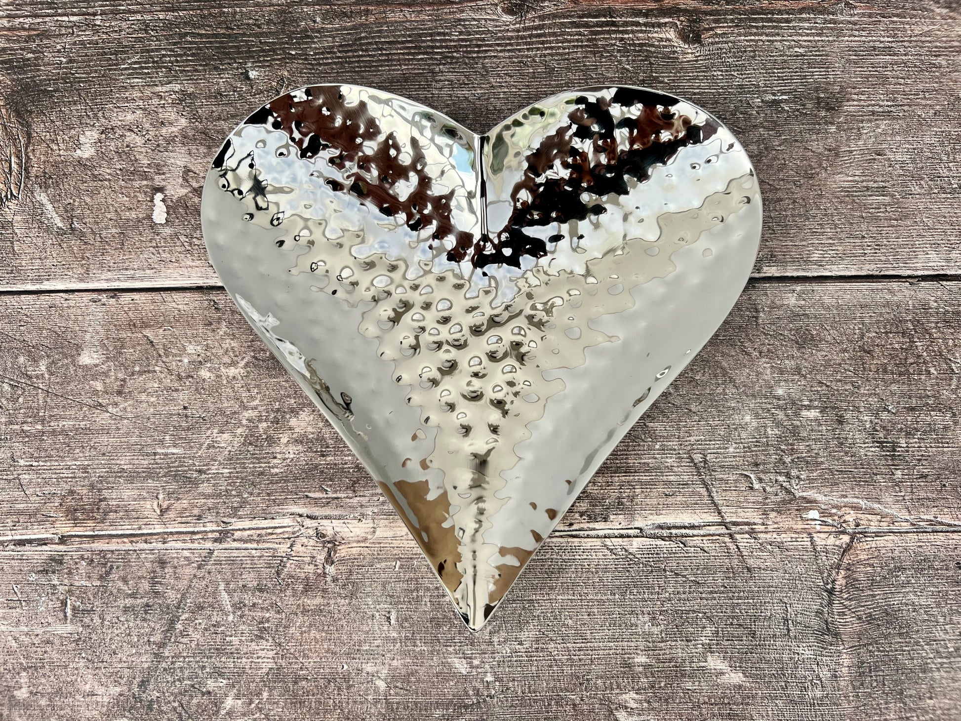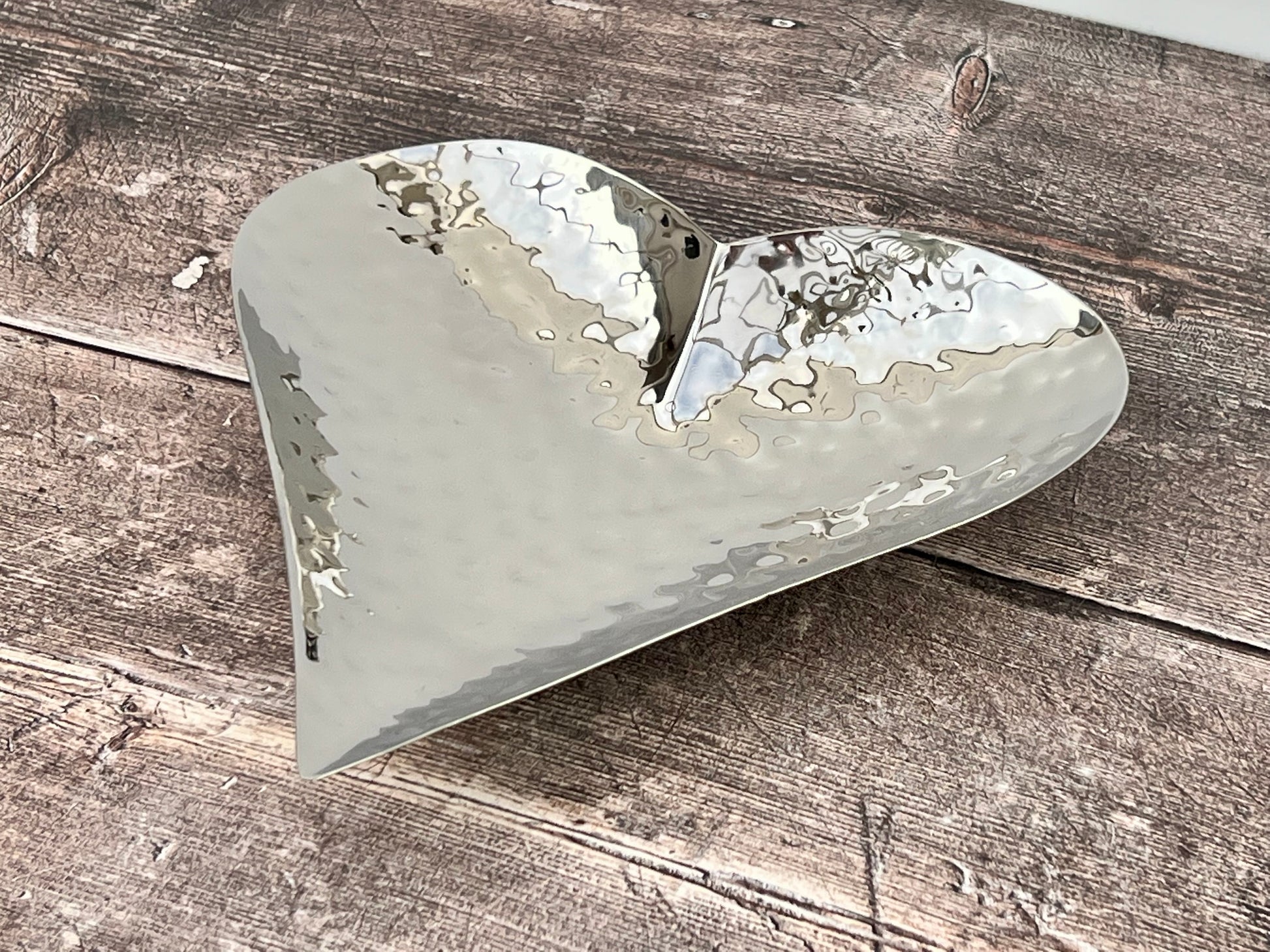 An elegant and beautiful hand-hammered heart shaped dish made from stainless steel. A great display item, trinket dish or serving bowl.