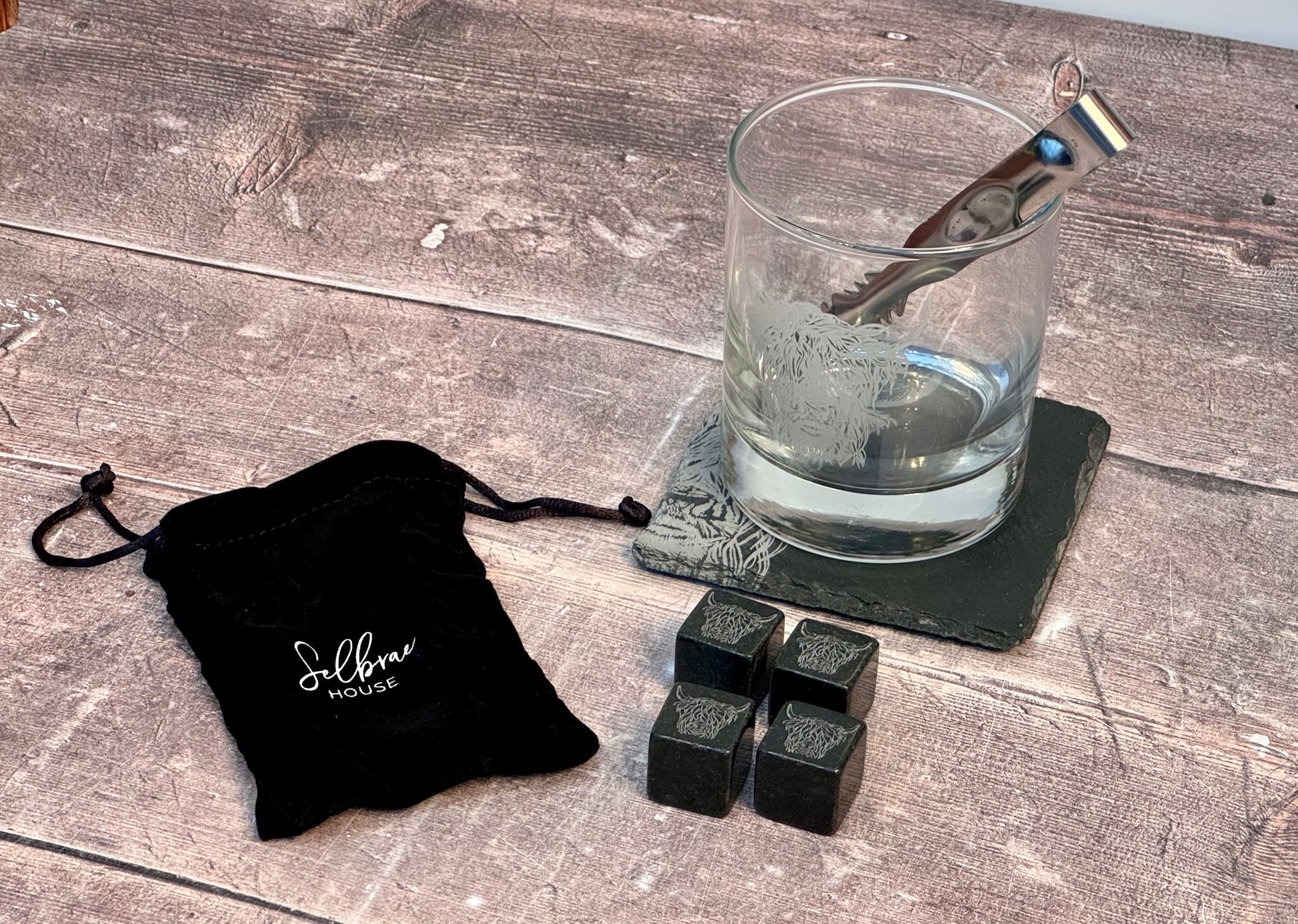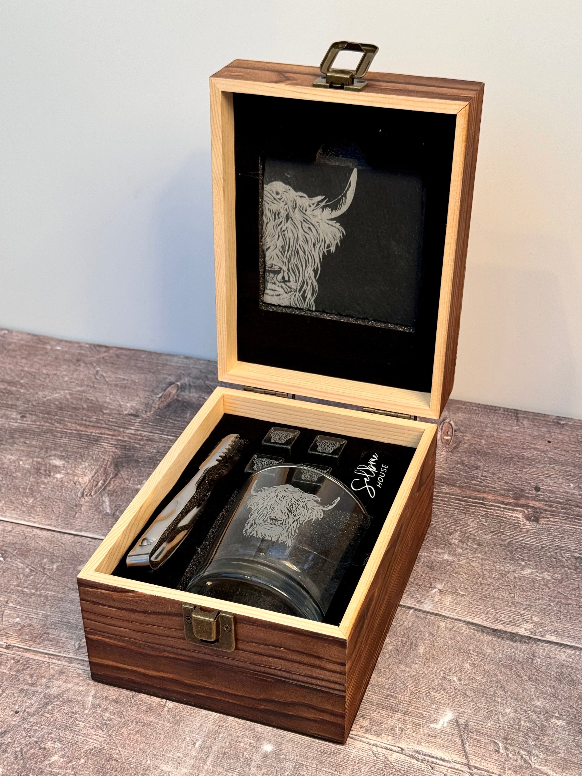 A great gift for any drinks lover. A highland cow patterned set which includes: