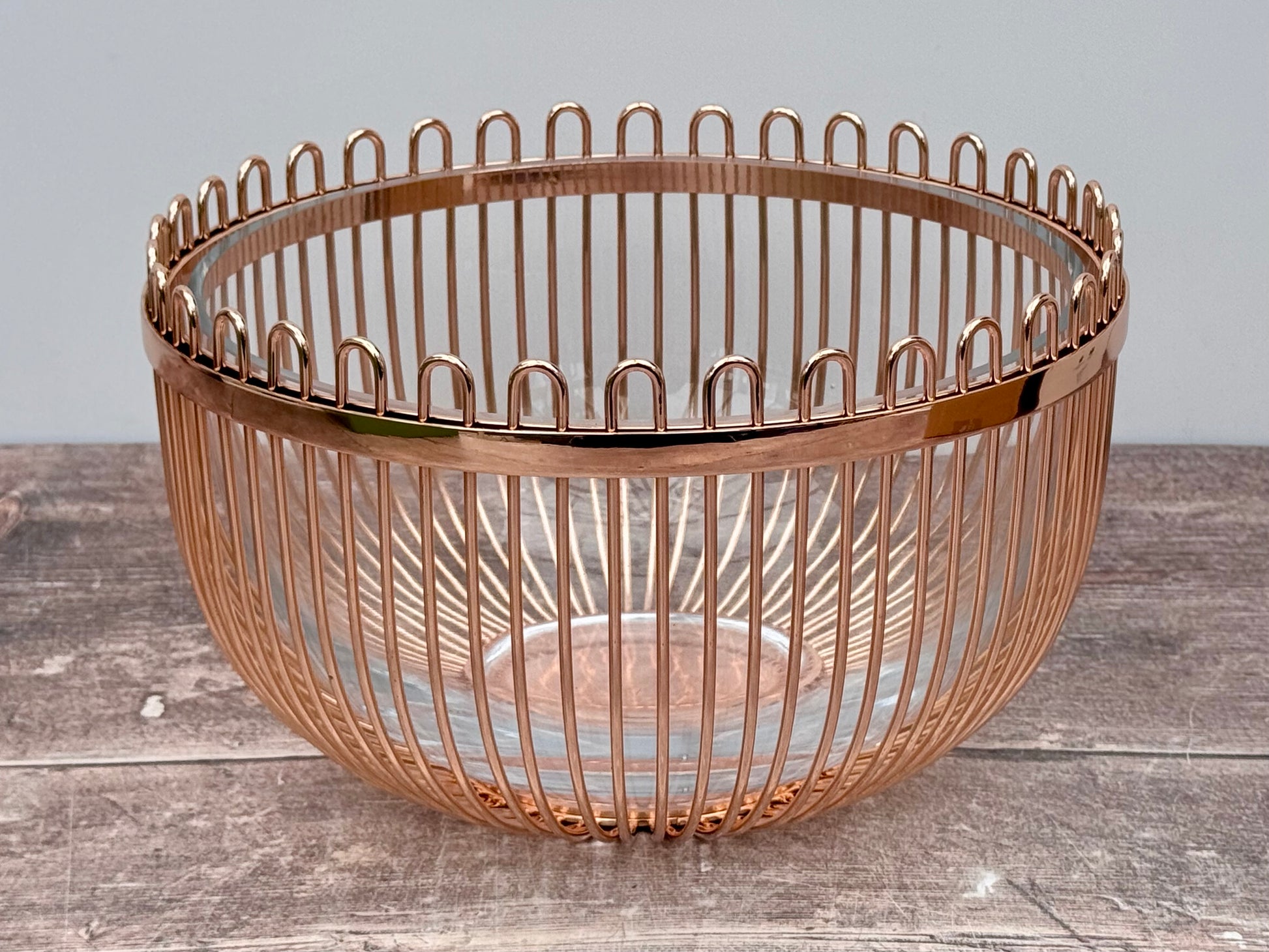 With a gold tone outer decorative metal cover and a glass centre bowl, this bowl makes a striking addition to any table.