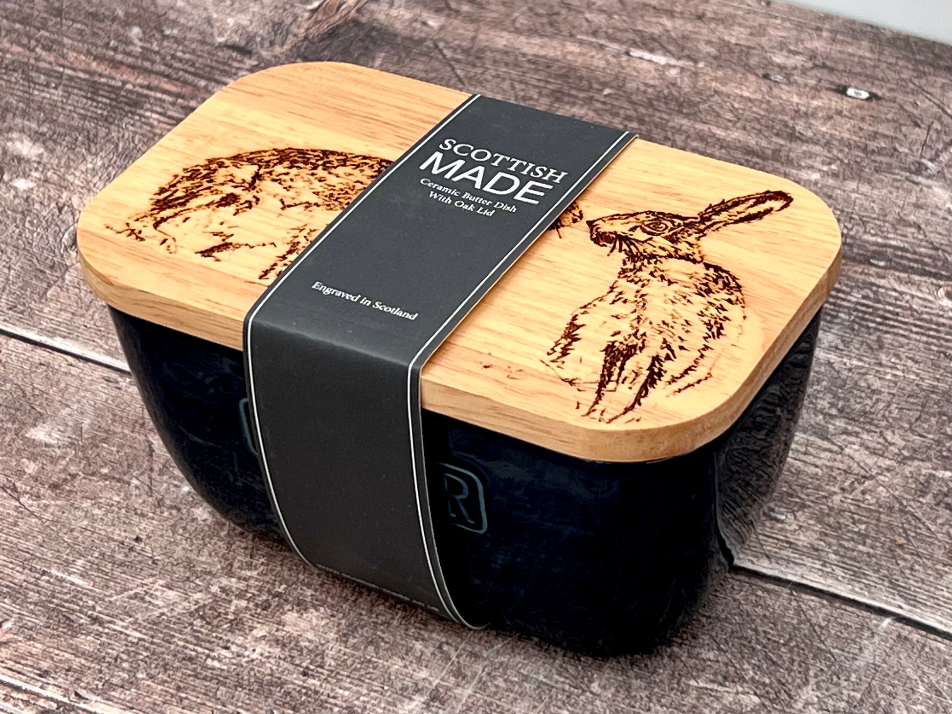 Engraved with kissing hares, this blue butter dish brings a homely touch to the kitchen.