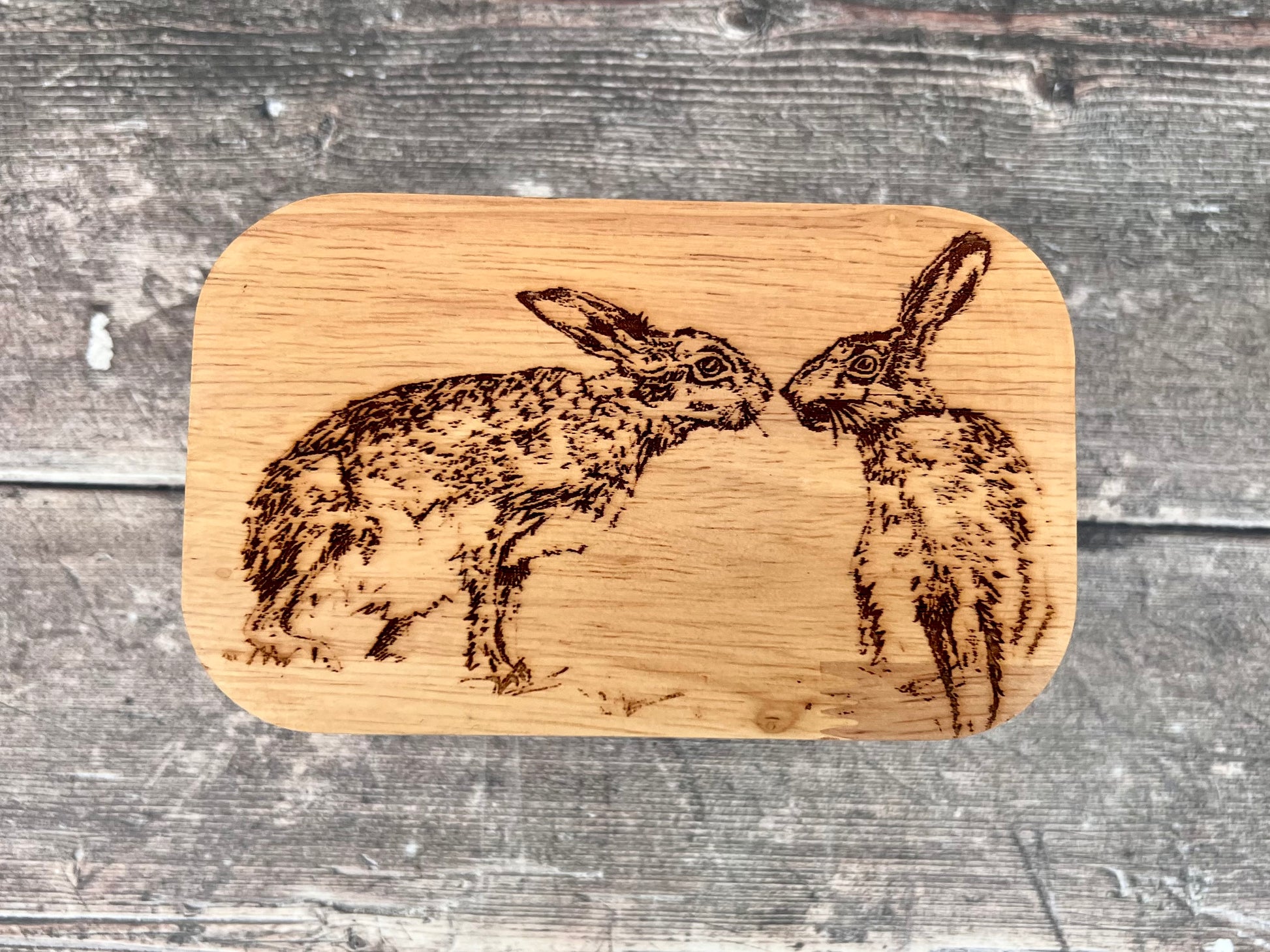 Engraved with kissing hares, this white butter dish brings a homely touch to the kitchen.