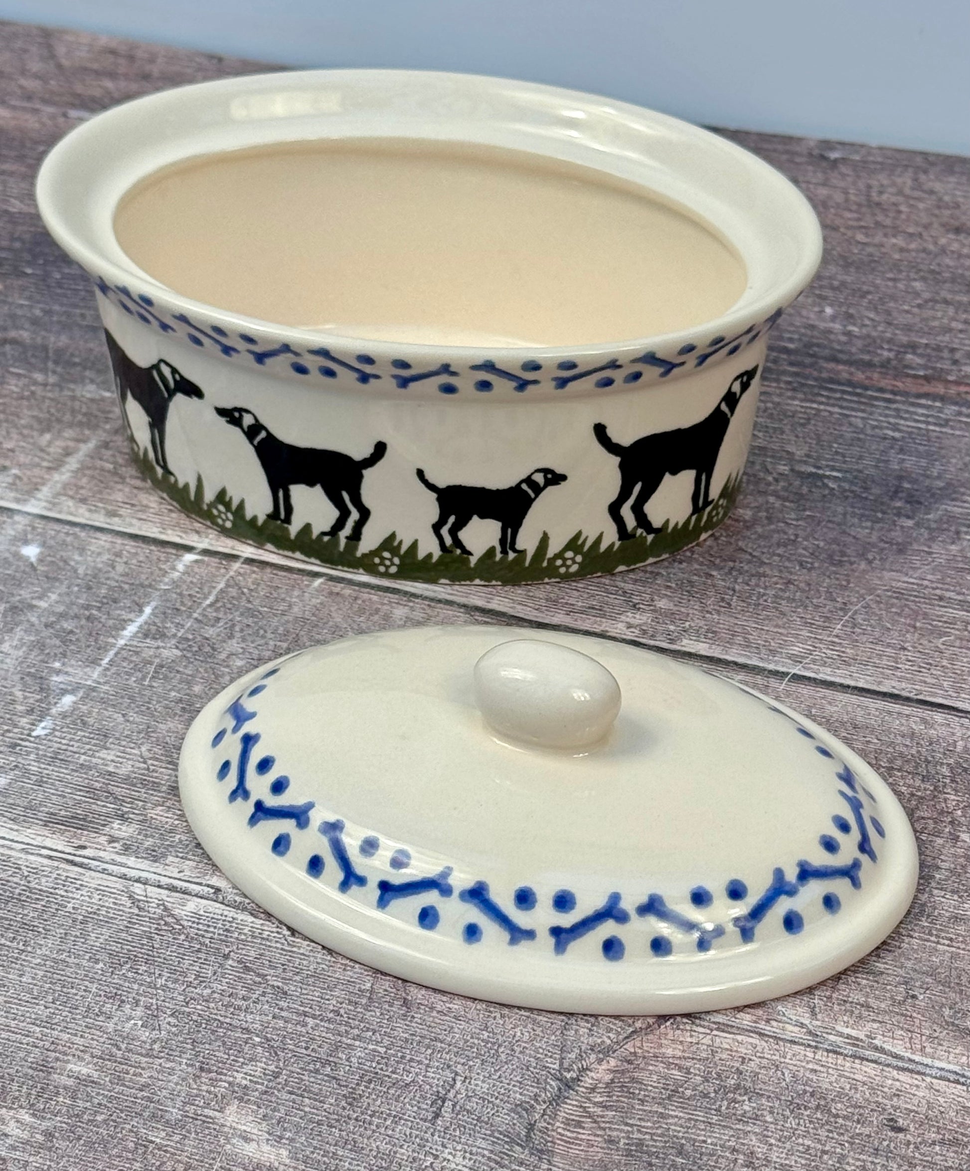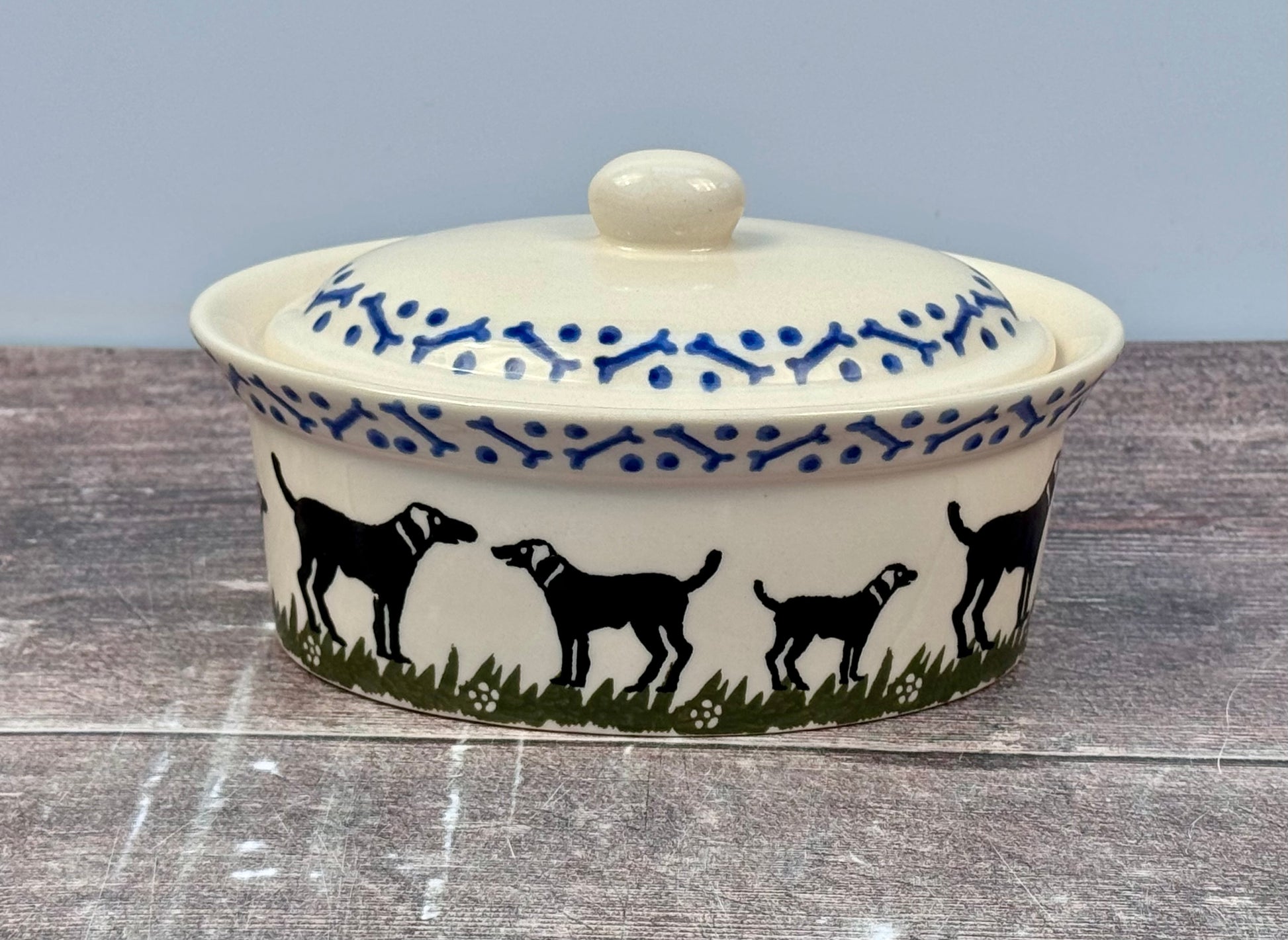 This oval shaped butter dish with delicate design will add a touch of style to any table.