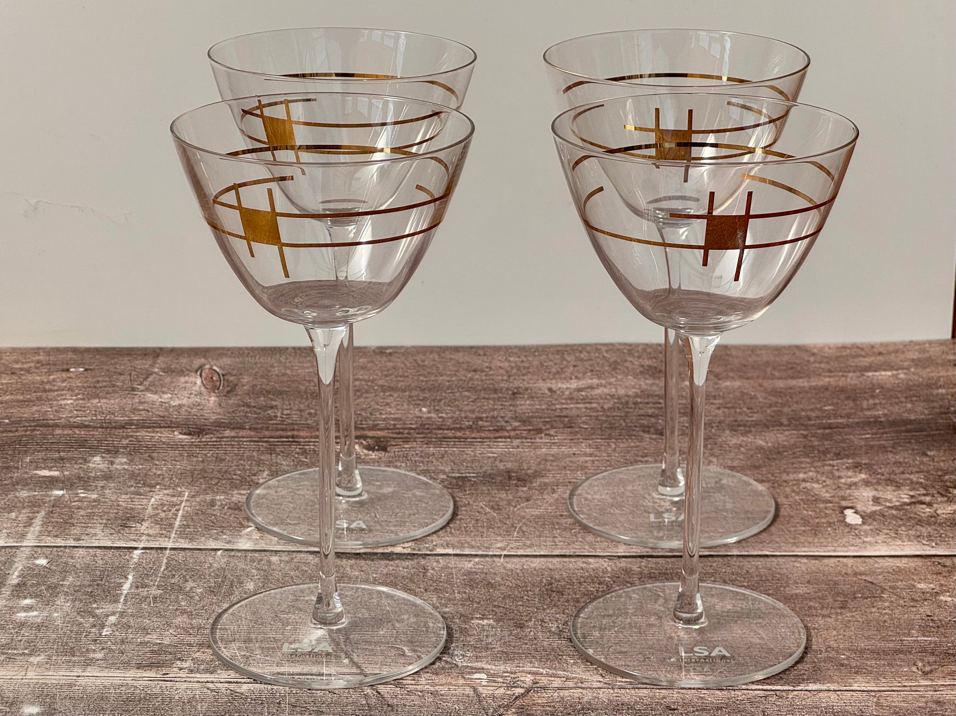 4 LSA martini glasses decorated with a vintage-inspired gold motif.