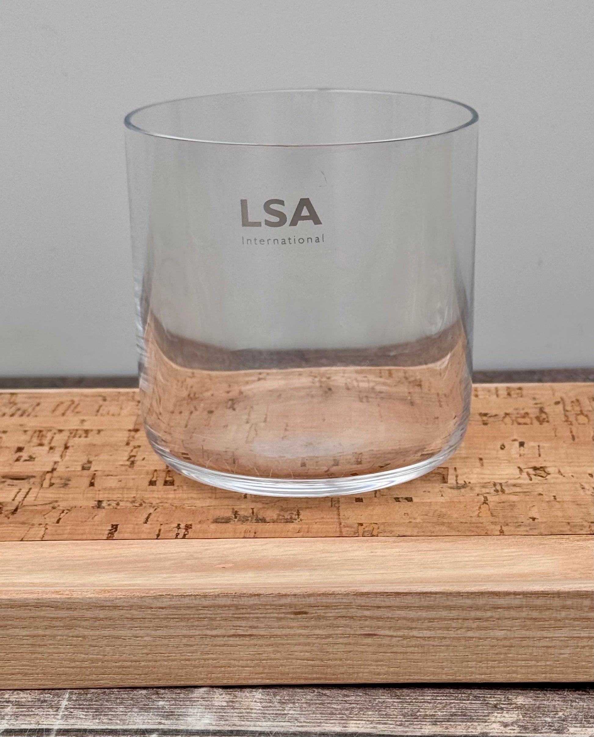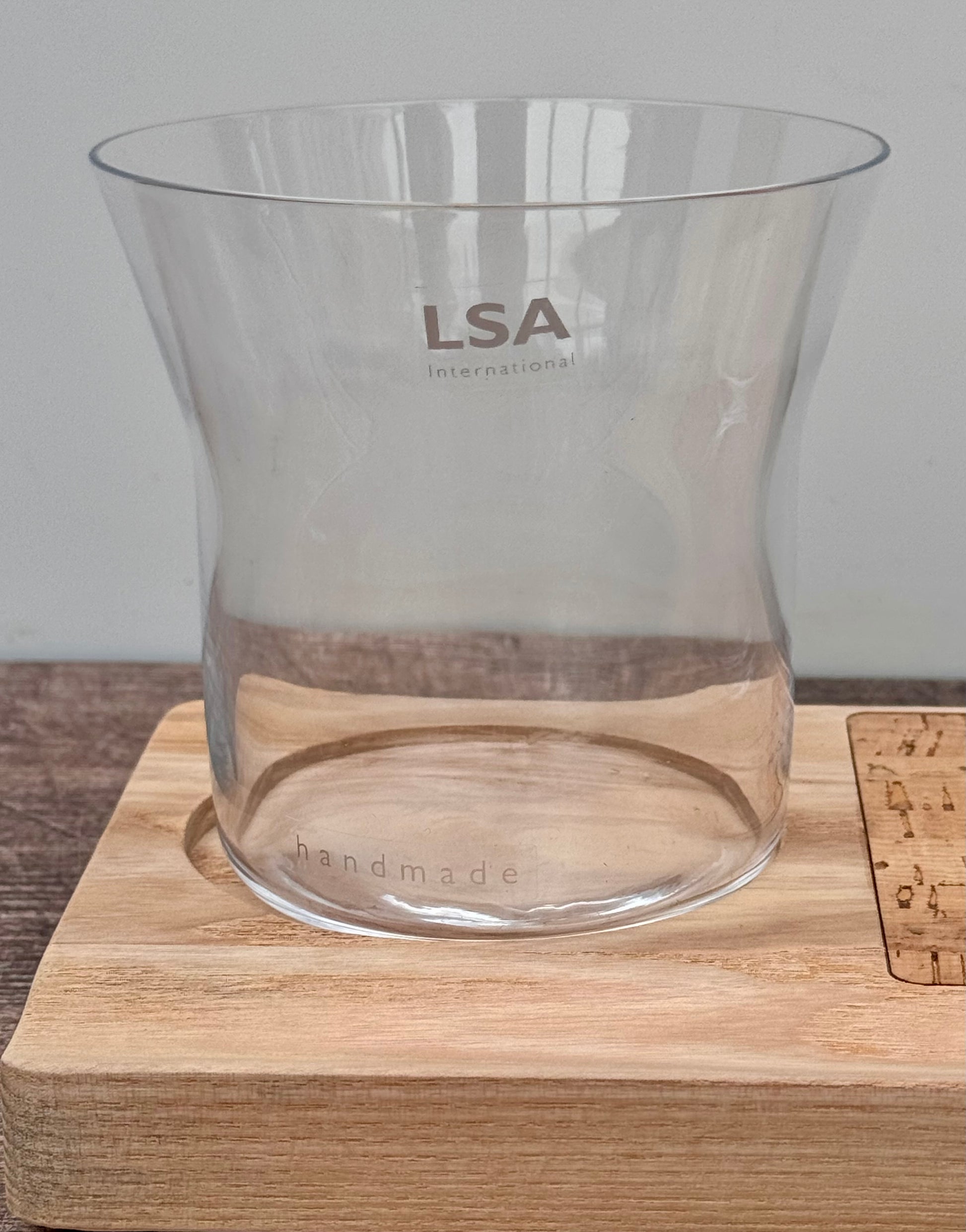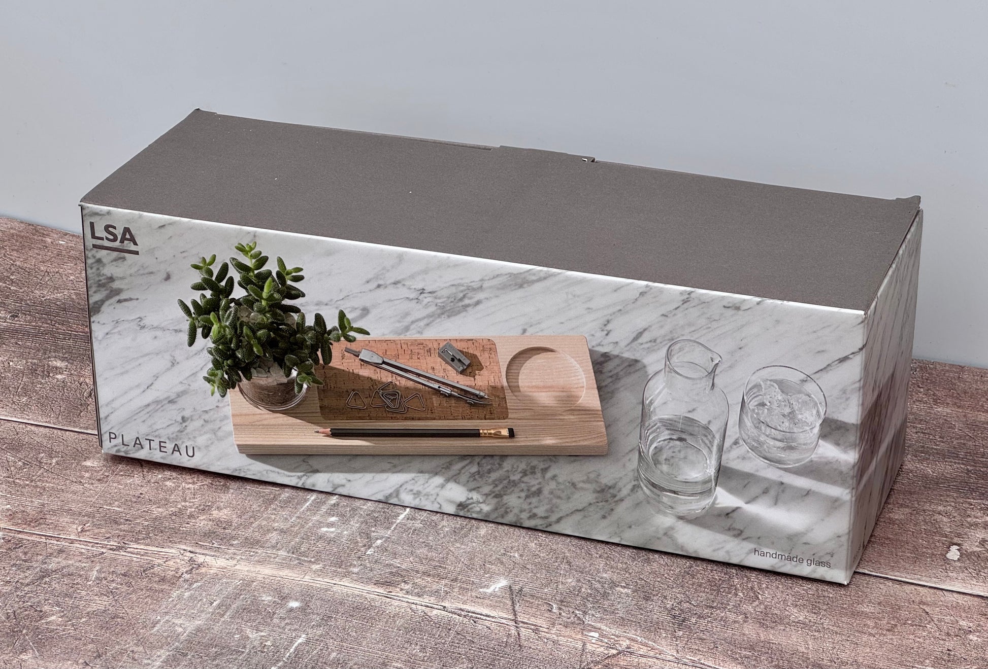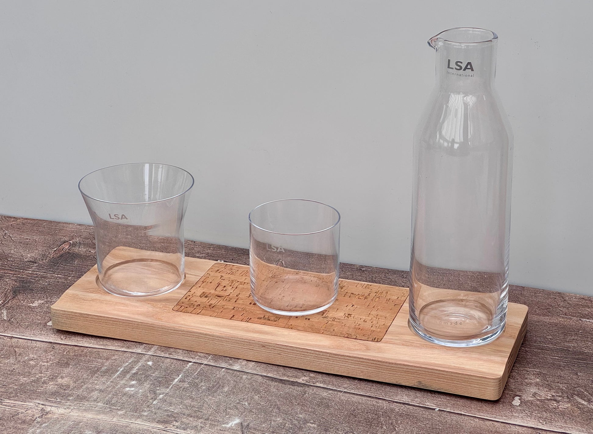 A mouth-blown glass plant pot and a carafe with a tumbler are located within the tray. The narrow groove along one edge is designed for pens and pencils. The flat cork covered plane offers space for a phone, stationary, keys or other personal effects.