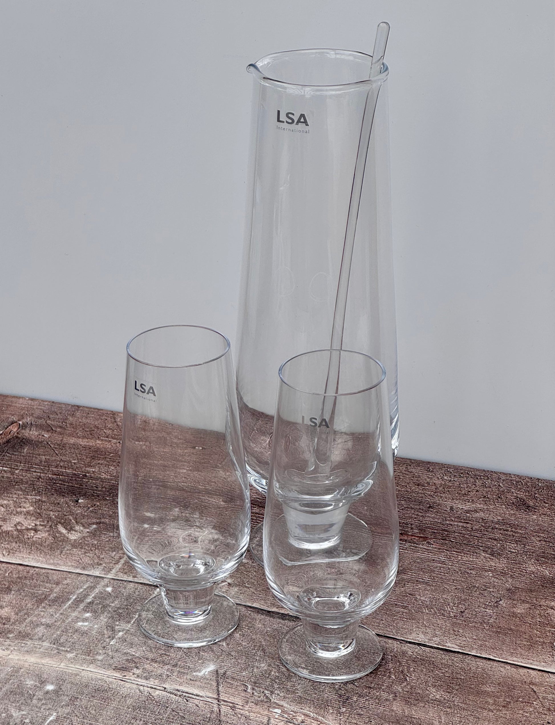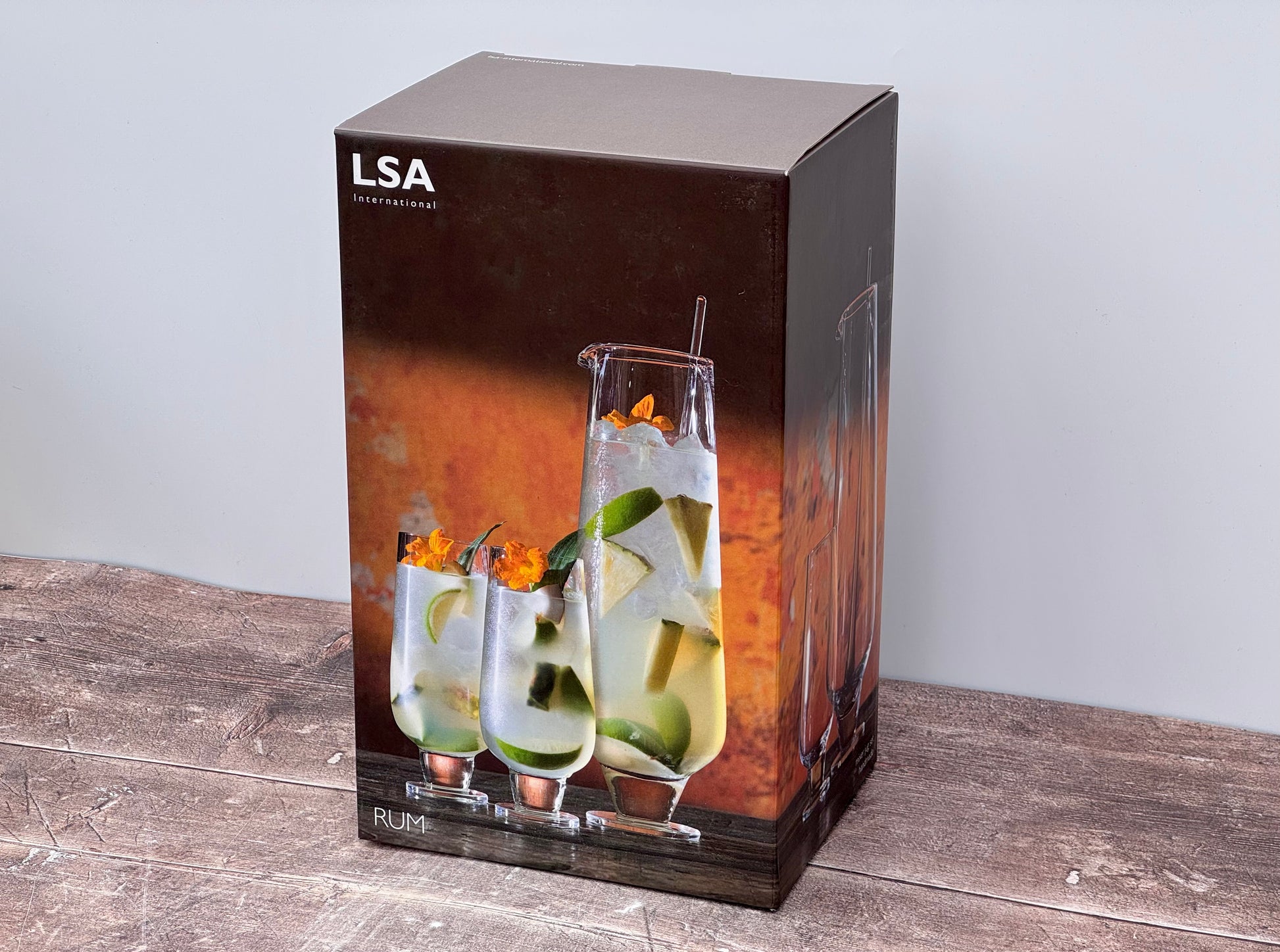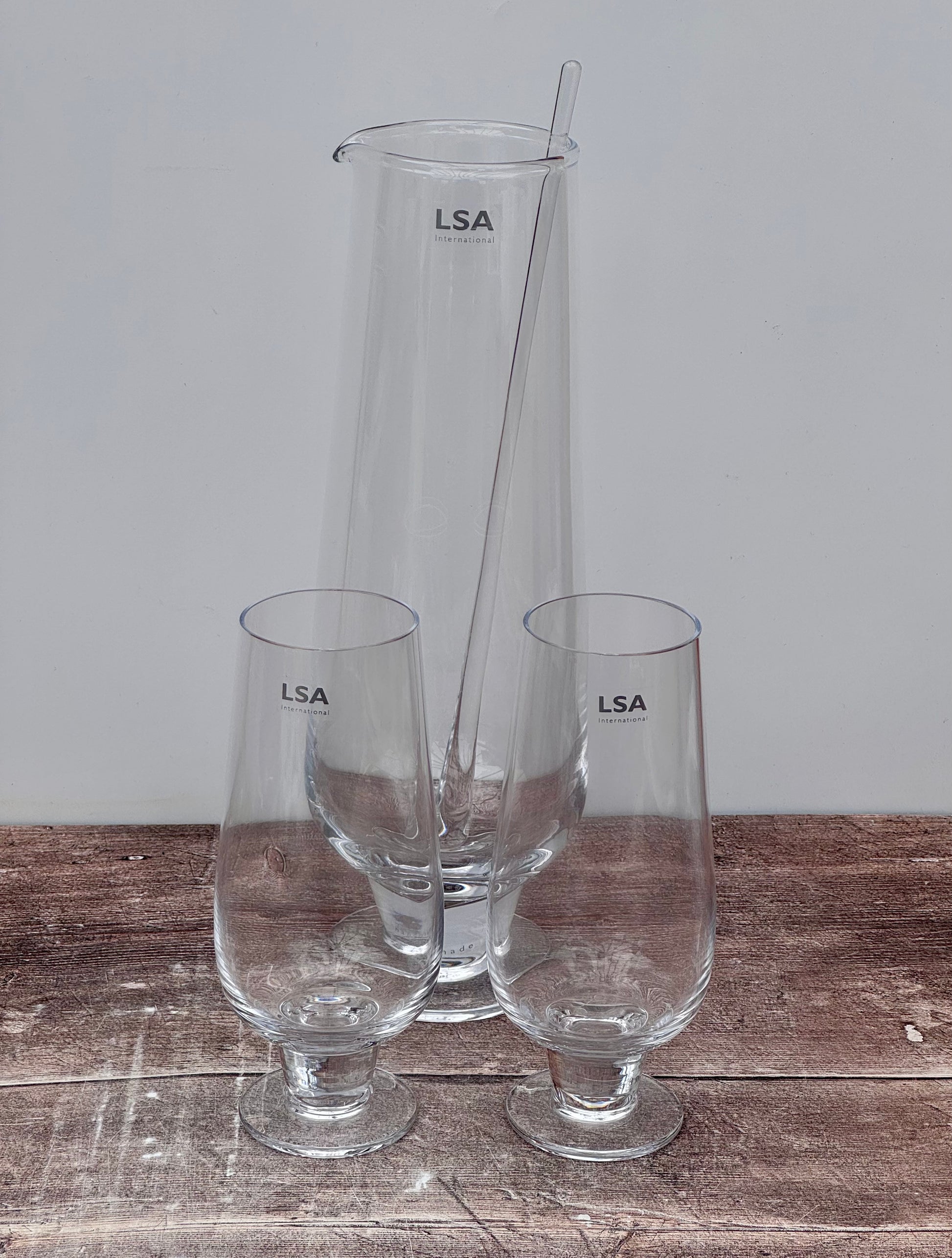 Ideal for mojitos and other tall cocktails, the highballs are generously proportioned to accommodate ice and the jug is provided with a stirrer for mixing and pouring long drinks.