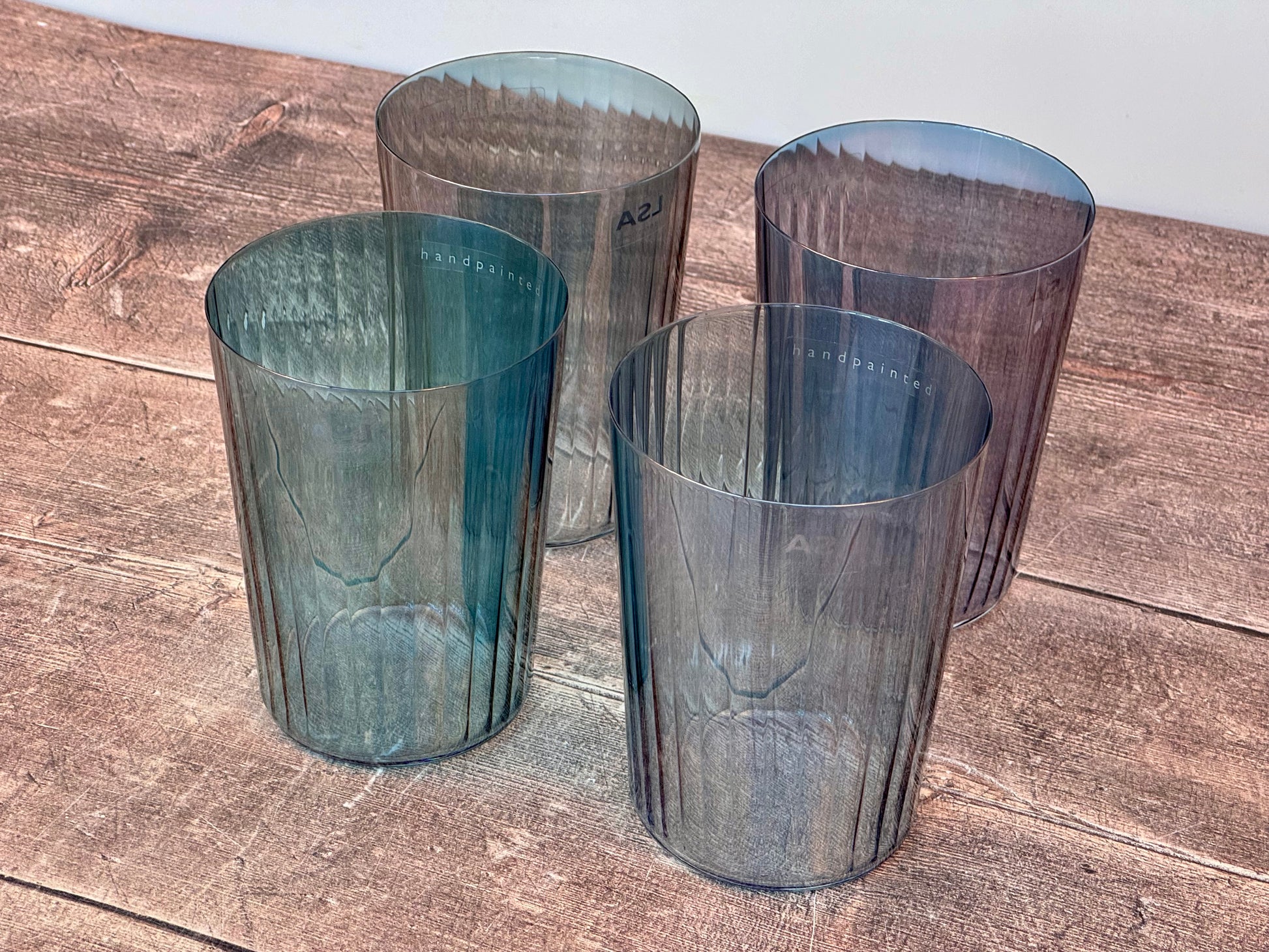 A set of 4 tumblers in a palette of tonal sapphires. The fine walls with a fluted texture are hand painted in an assortment of lustres to evoke the facets of polished gemstones.