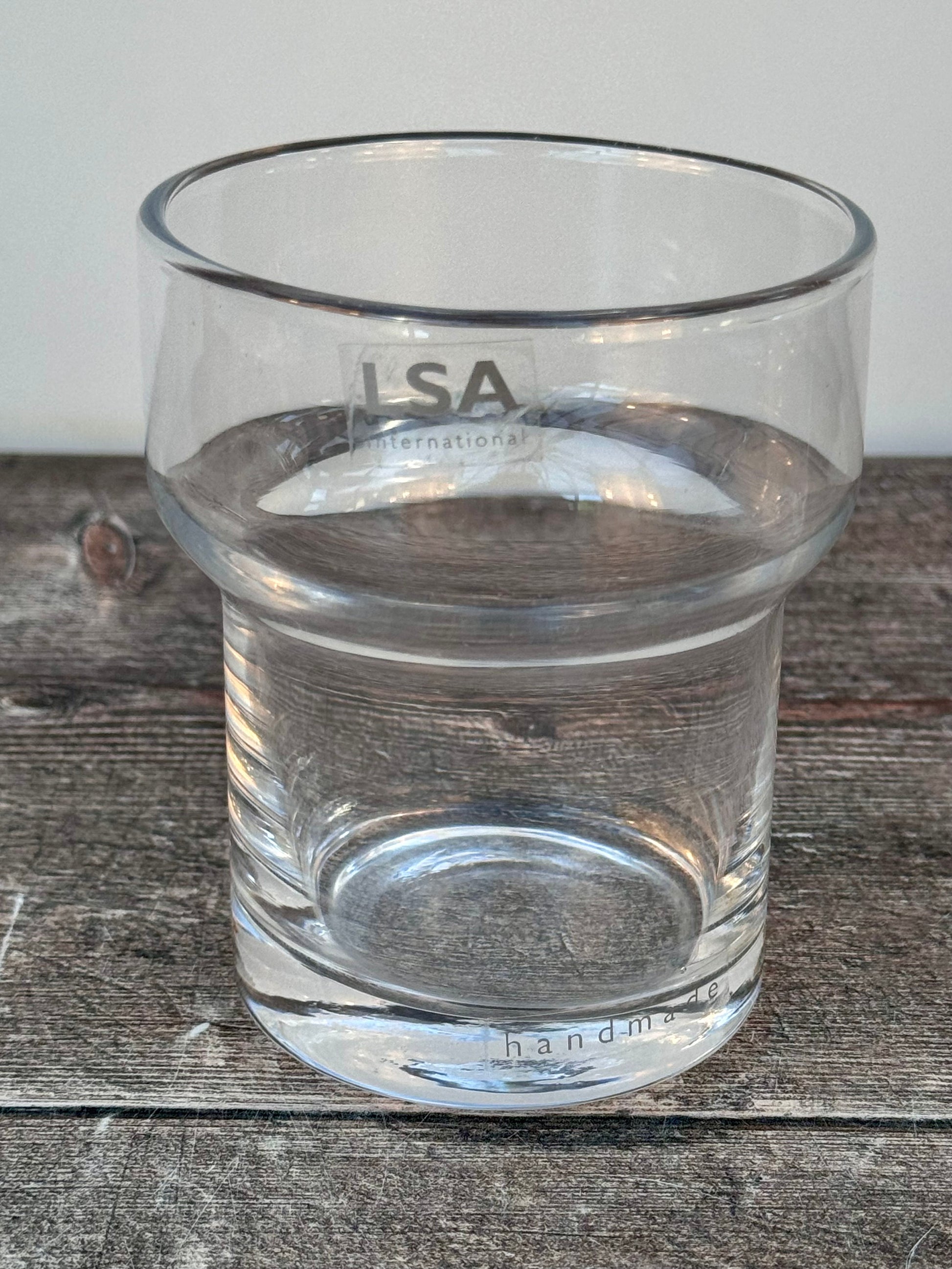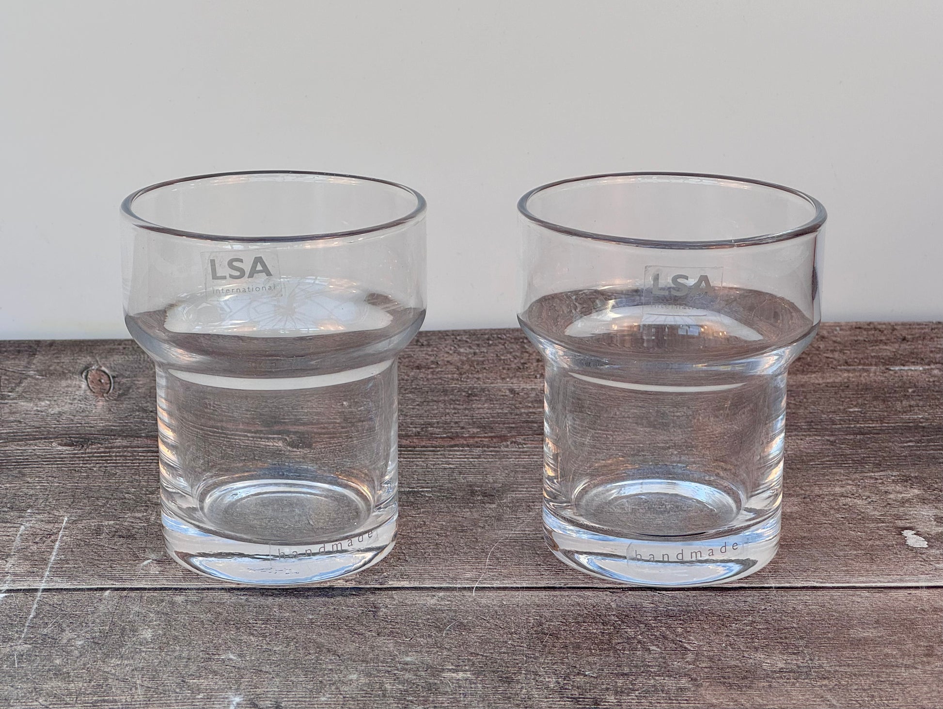 A set of two mouth-blown glass tumblers with thick, stepped walls.