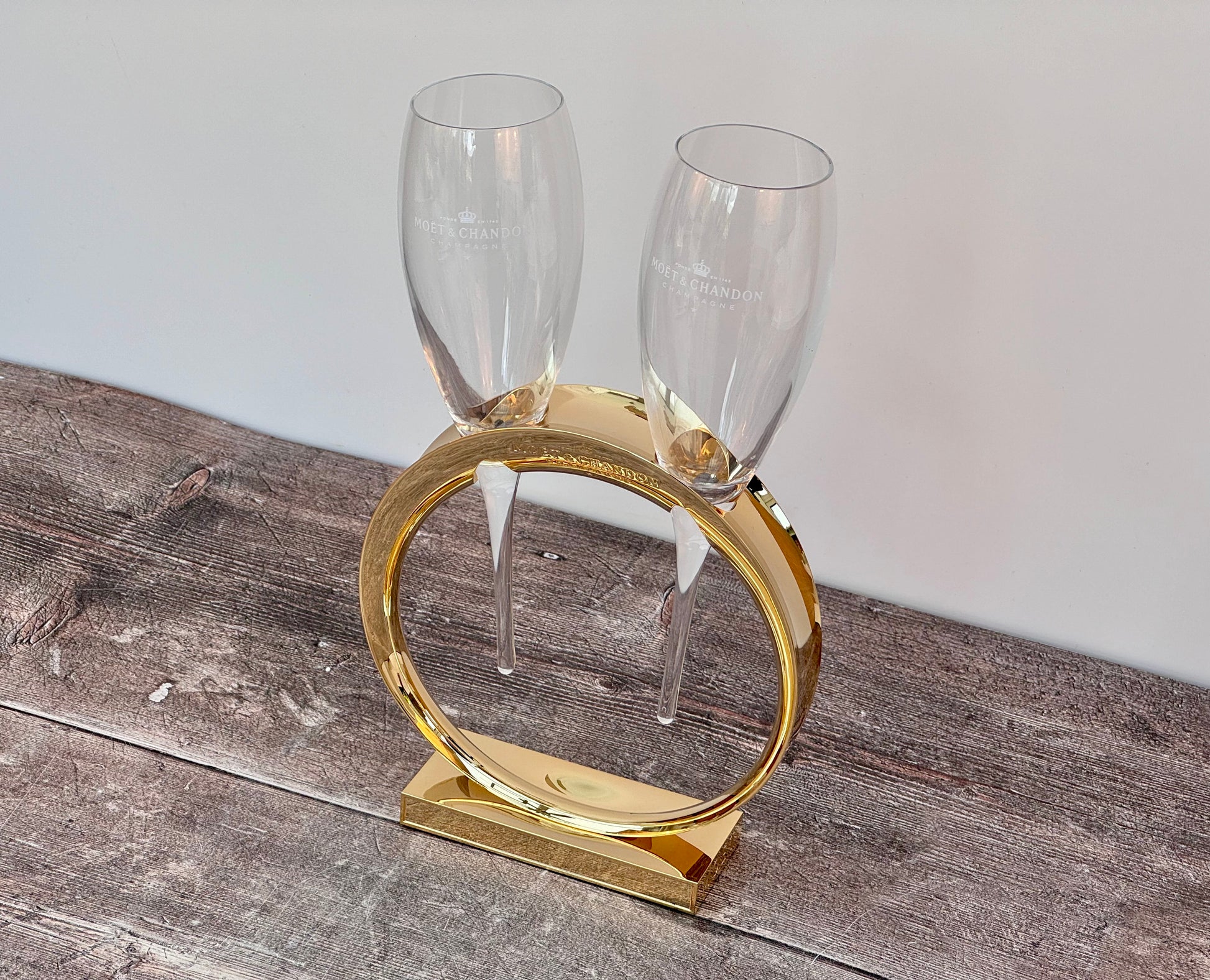 The perfect gift from Moet’s wedding collection! The band is a stunning gold tone, with the Moet & Chandon engraving. It comes with 2 crystal glasses again engraved with Moët & Chandon.