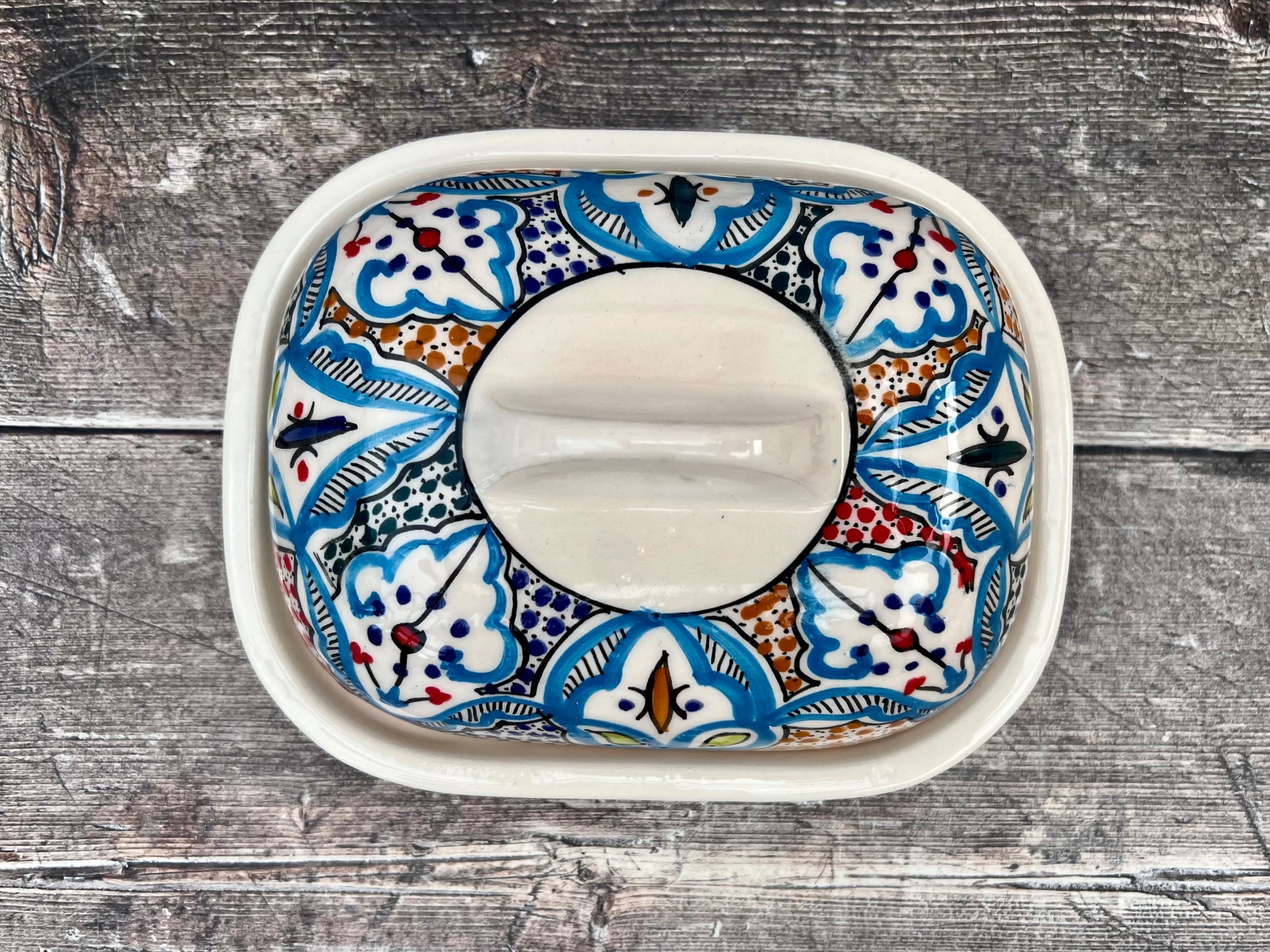 A beautiful hand-painted Tunisian butter dish with delicate patterned design will add a touch of style to any table.