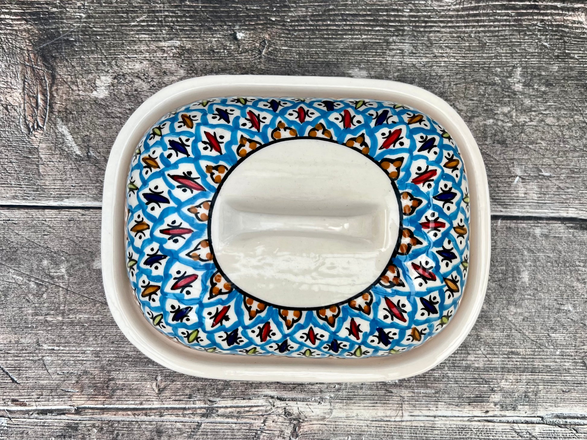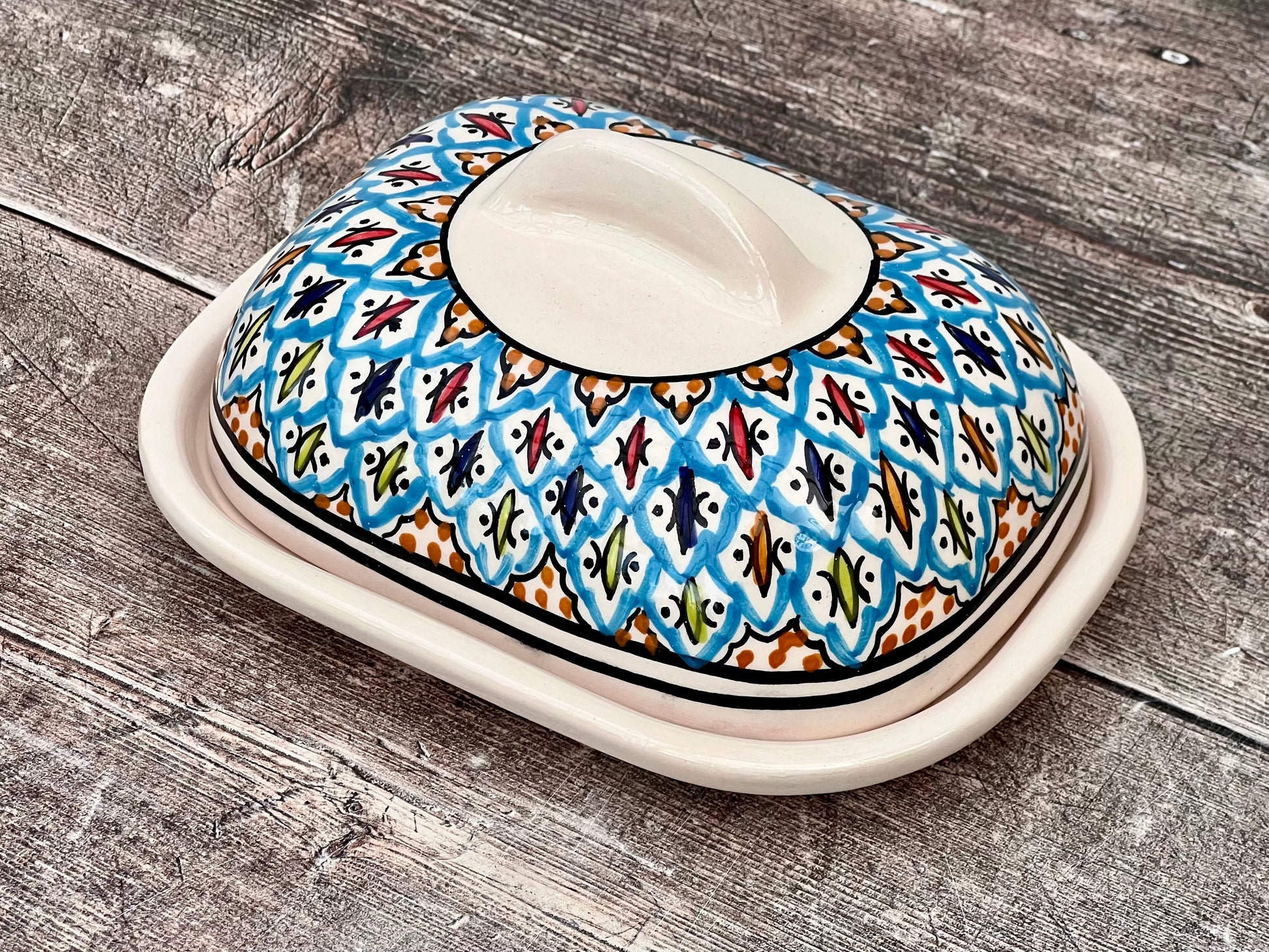 A beautiful hand-painted Tunisian butter dish with a delicate patterned design will add a touch of style to any table.
