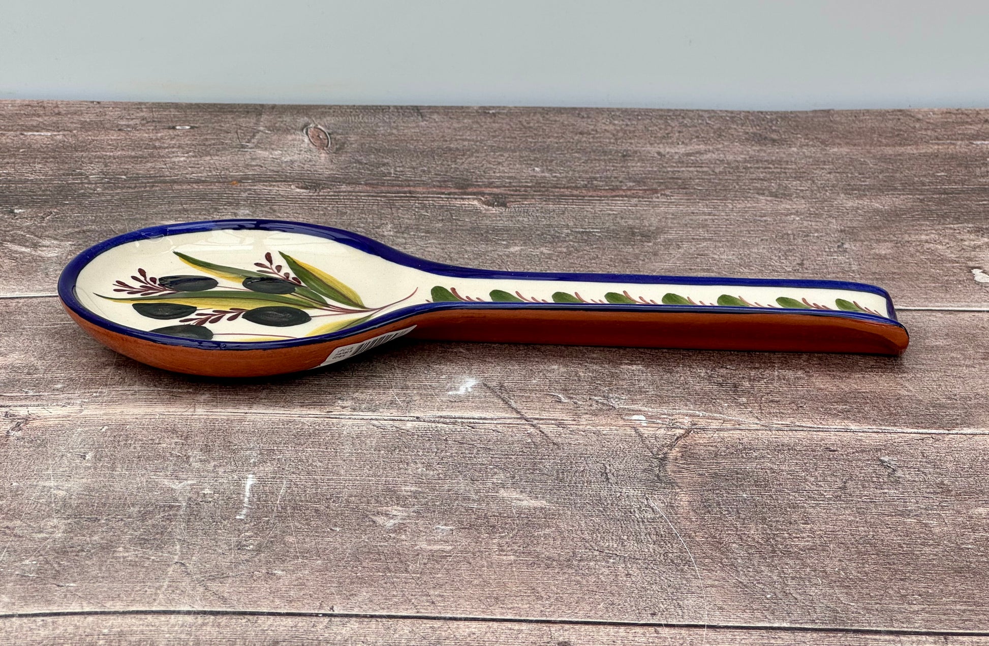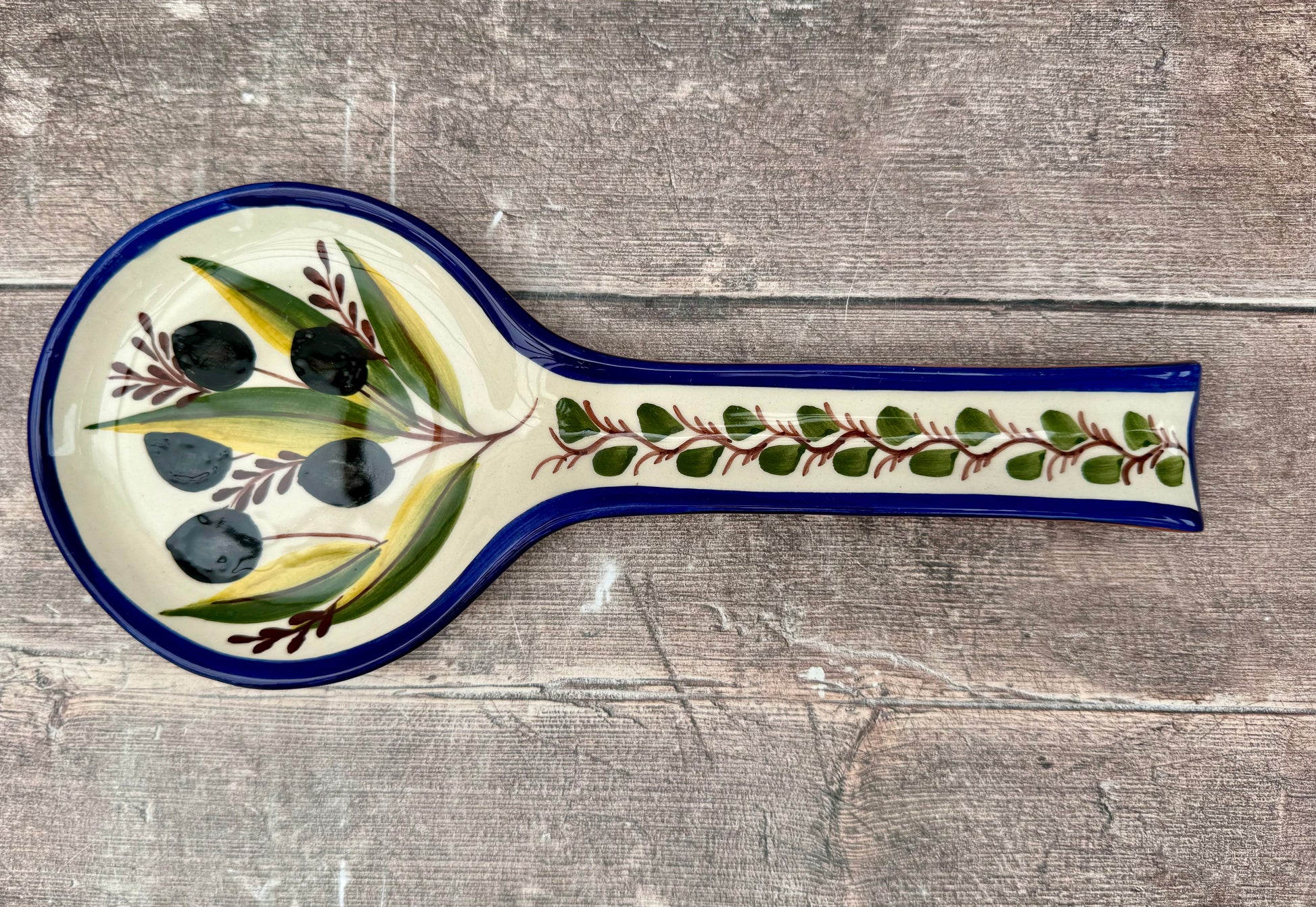 This spoon rest has an olive pattern. Add a touch of style to your kitchen with this spoon rest.