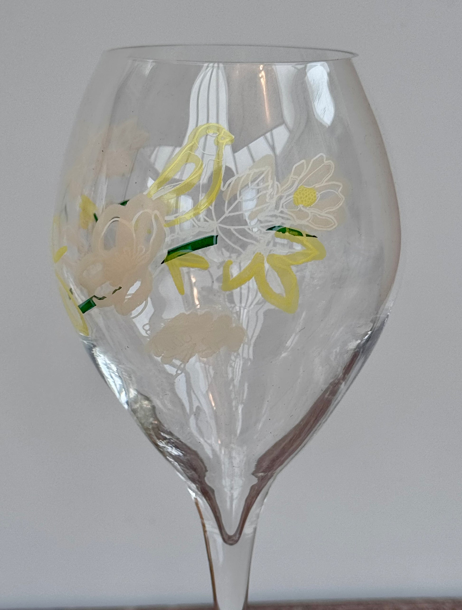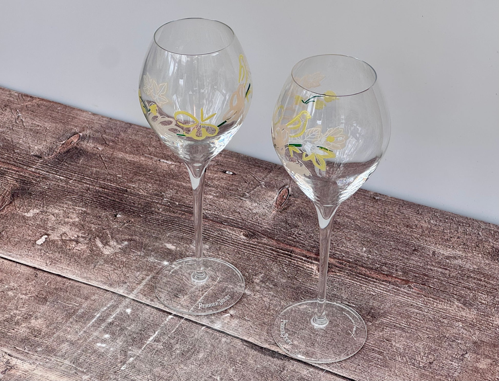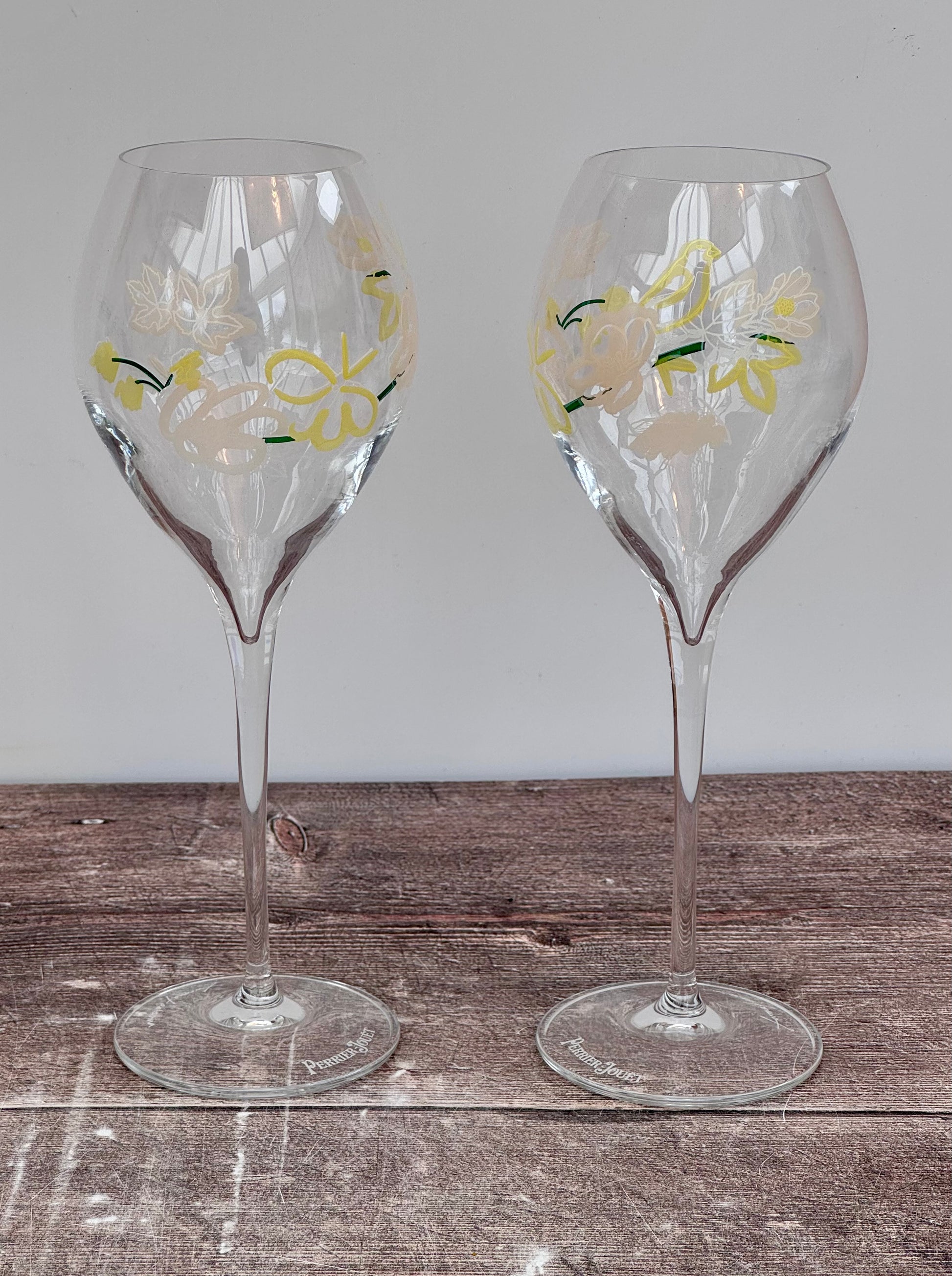 Stunning Perrier Jouet Formafantasma champagne glasses with butterfly and flower details.