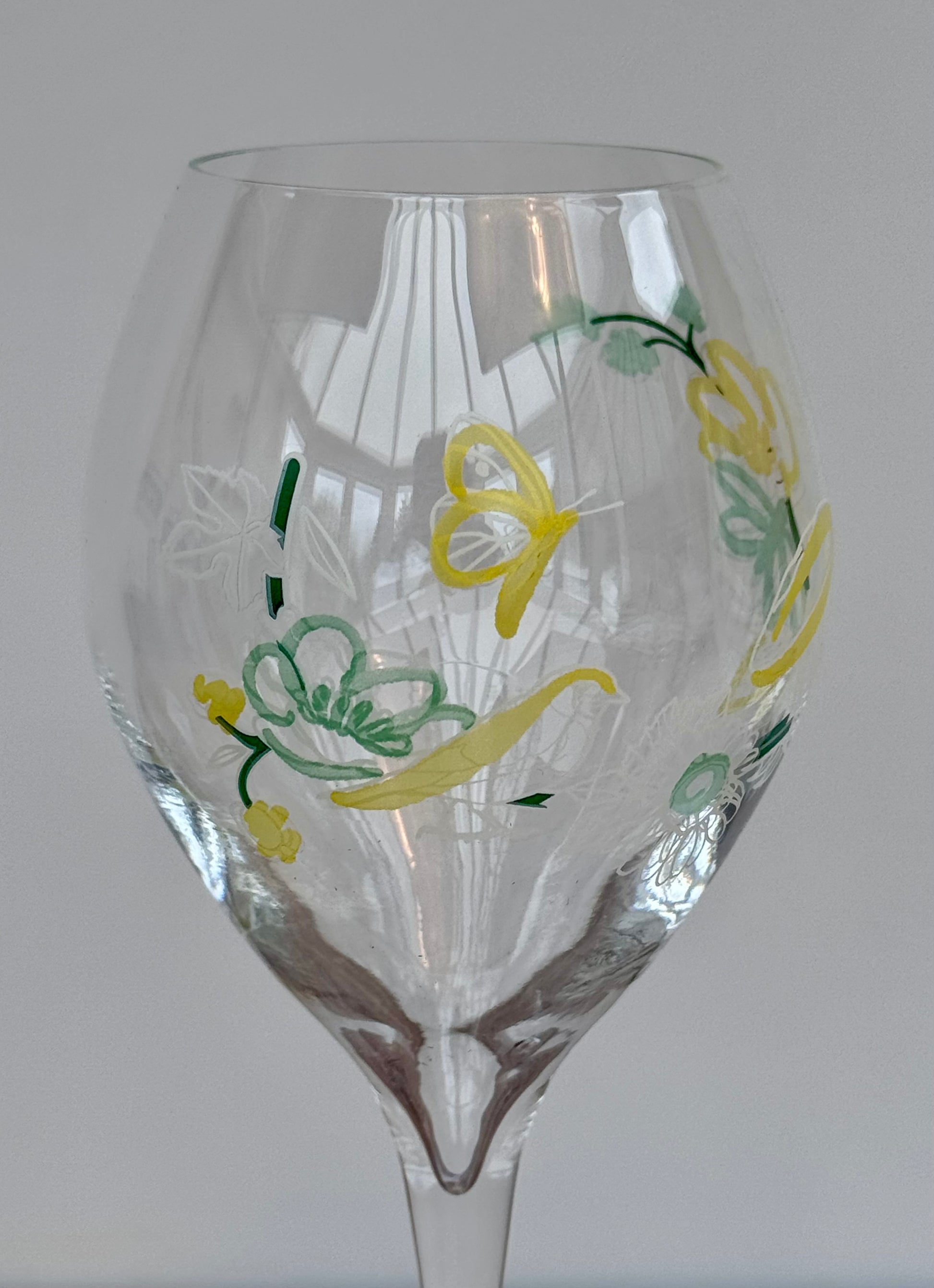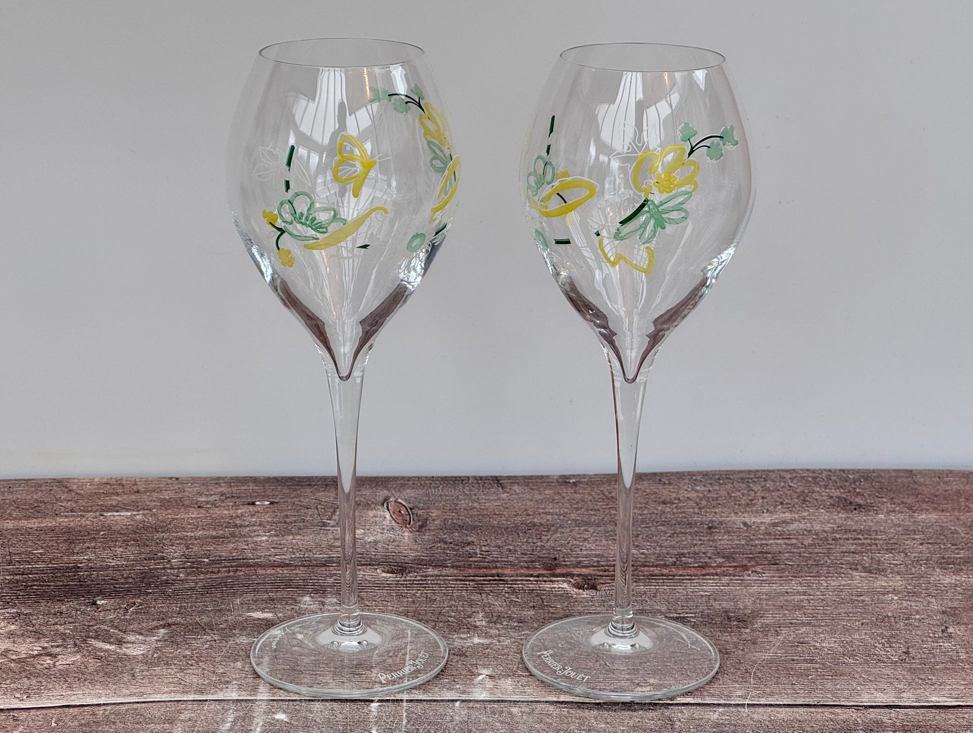 Stunning Perrier Jouet Formafantasma champagne glasses with butterfly and flower details.