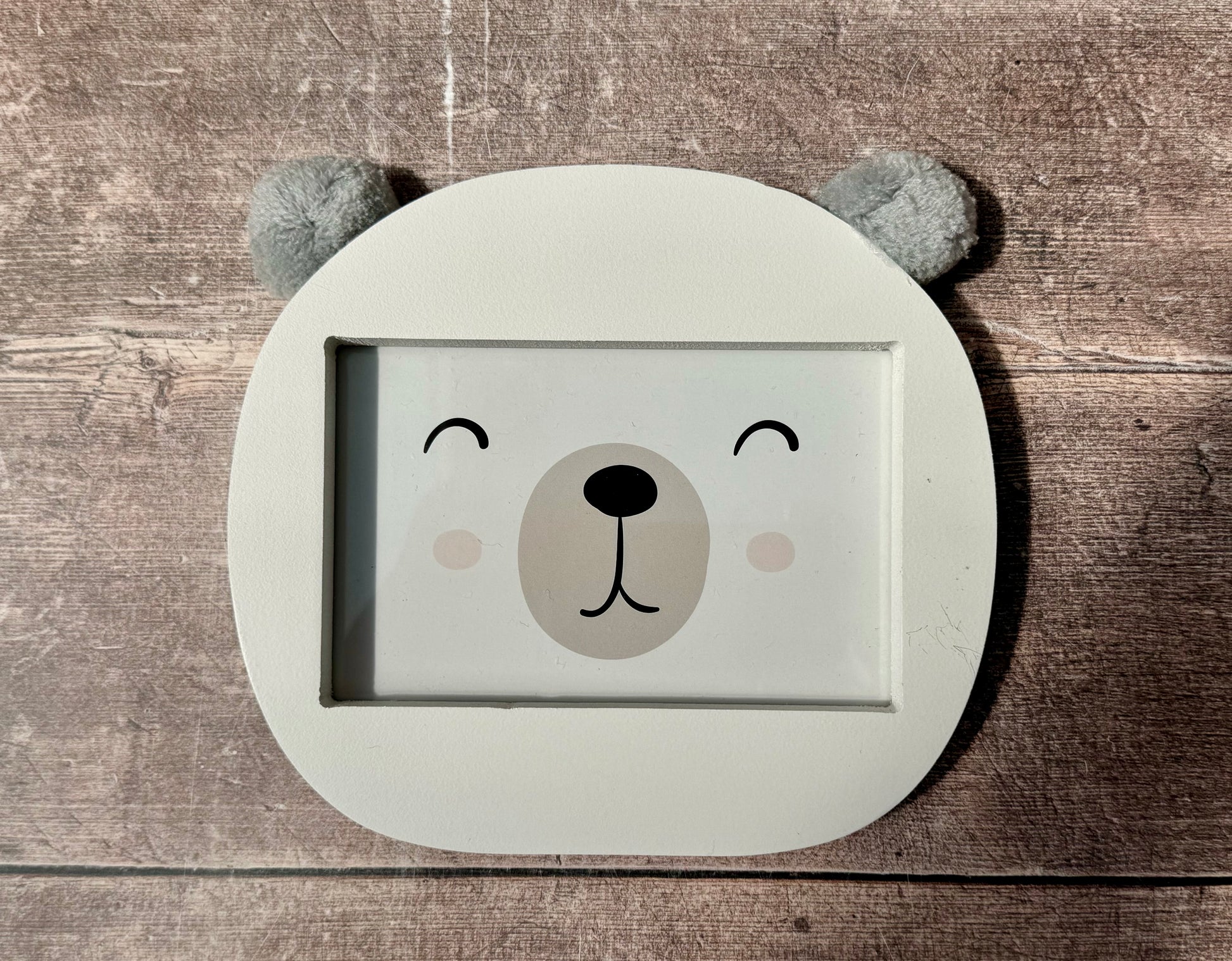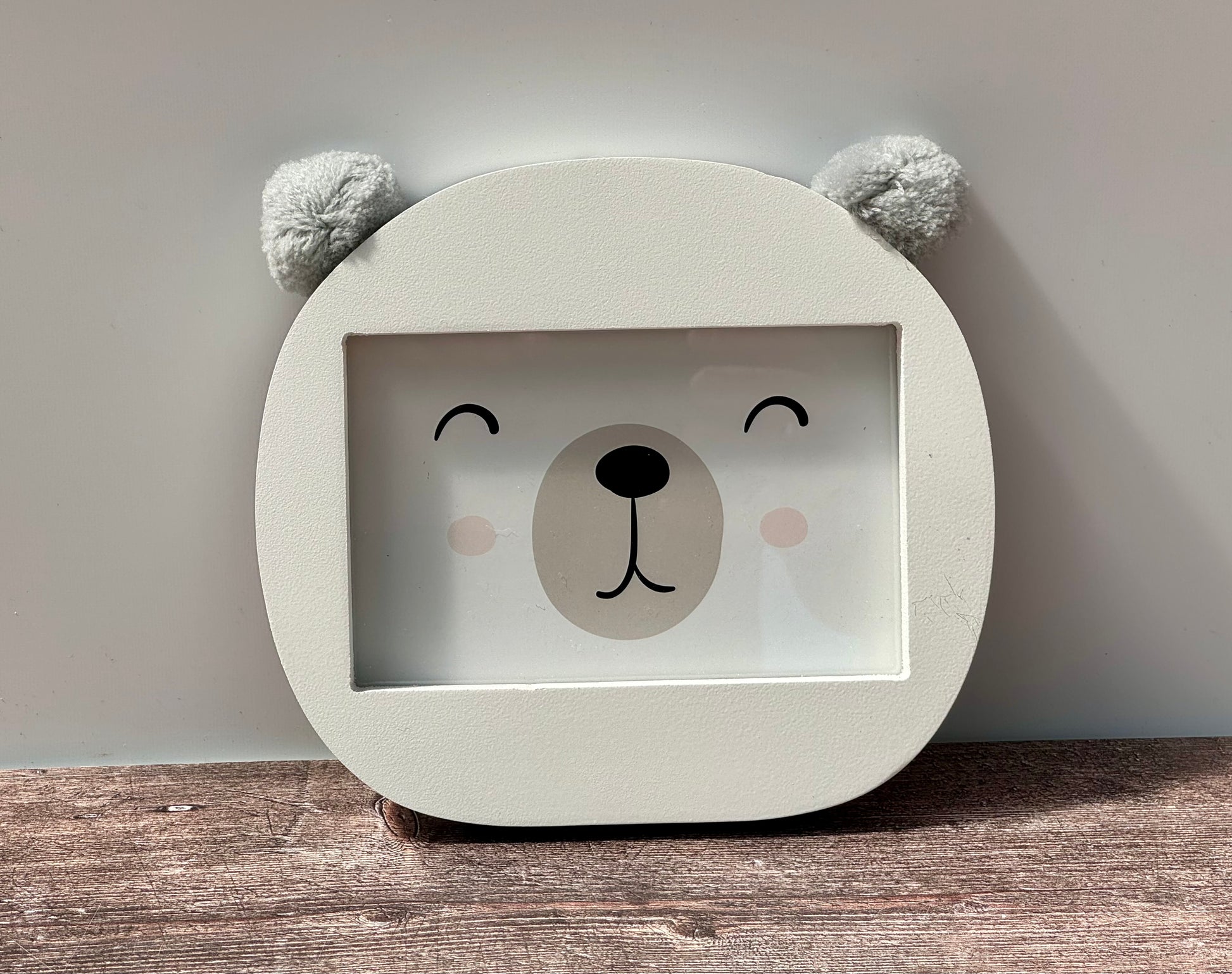 A cute wooden bear shaped photo frame with 2 grey pom poms for ears. Fits a 4’ x 6’ photo.