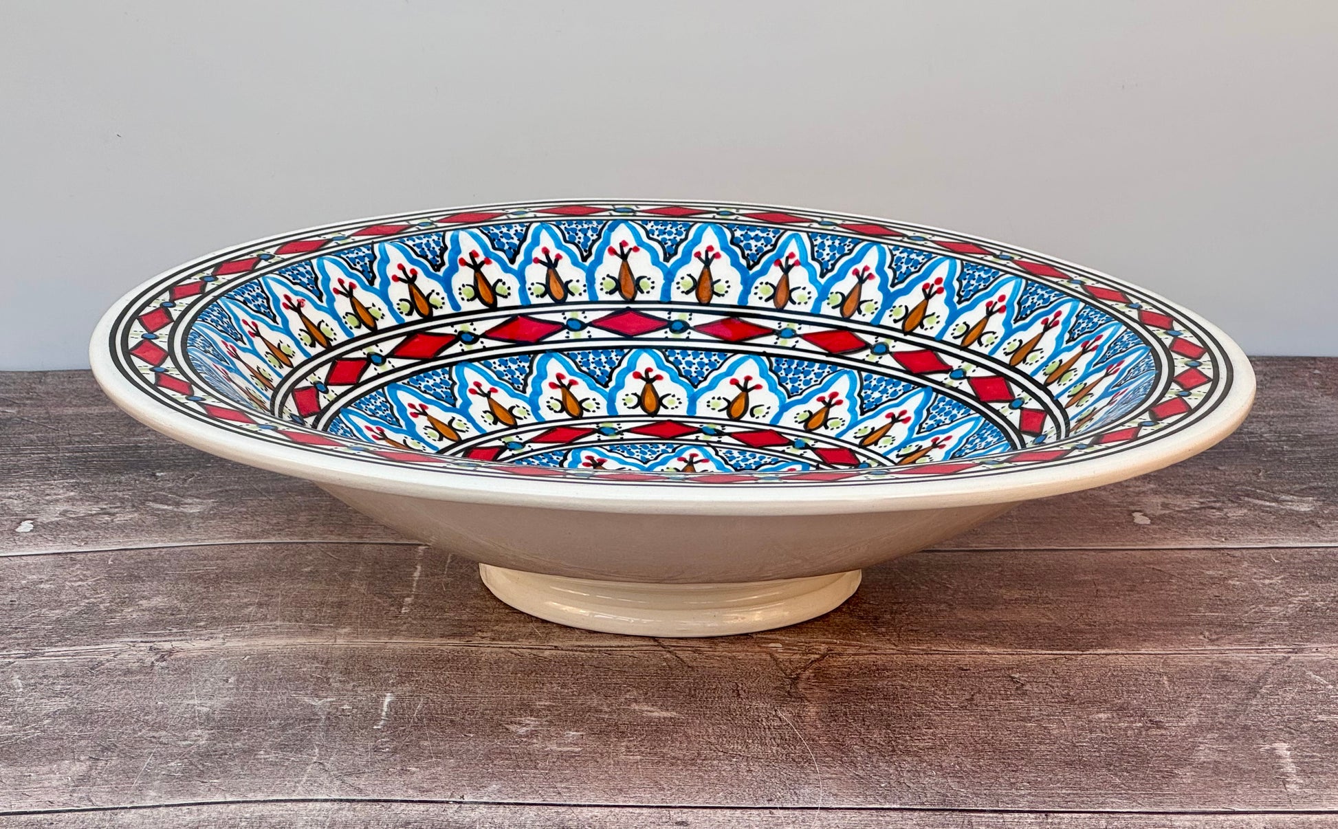 A striking hand painted bowl. The flat rim of the dish makes it perfect for serving food.