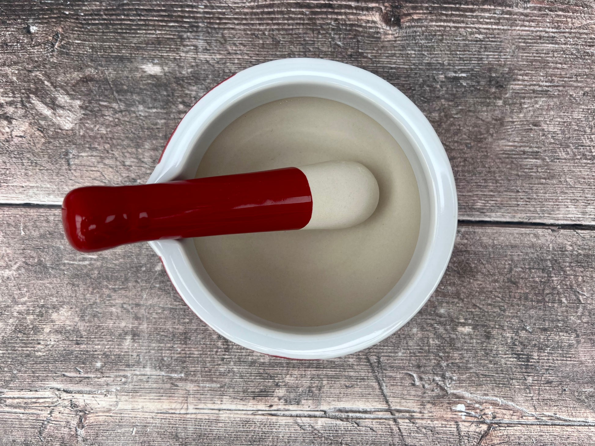 Made from stoneware, this red pestle and mortar has a gloss outer edge for a modern finish.