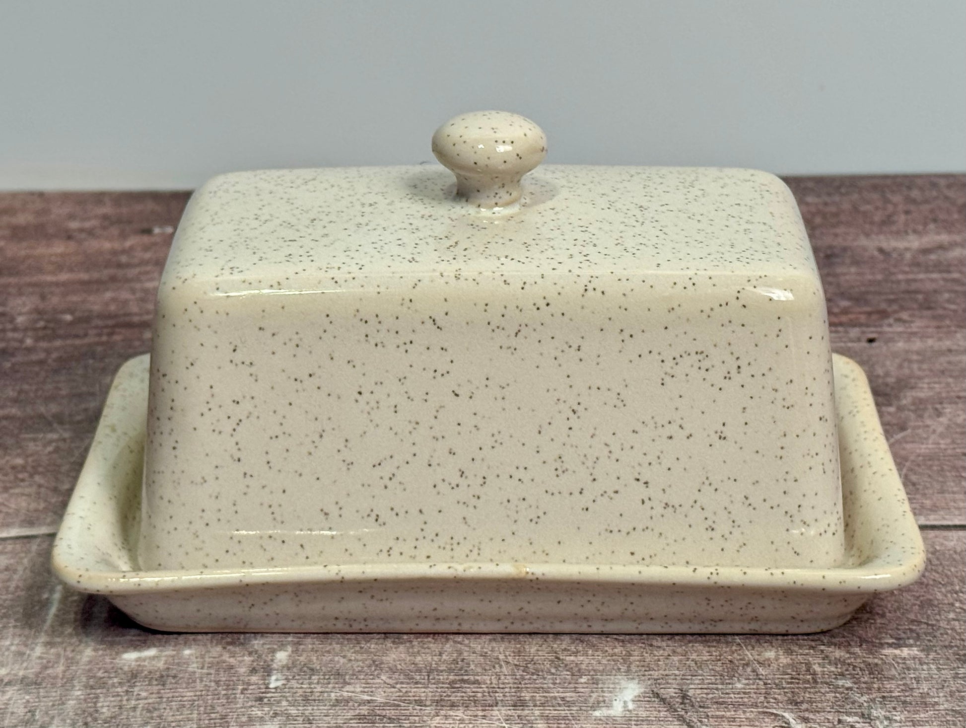 A cream ceramic butter dish that brings a homely touch to the kitchen.