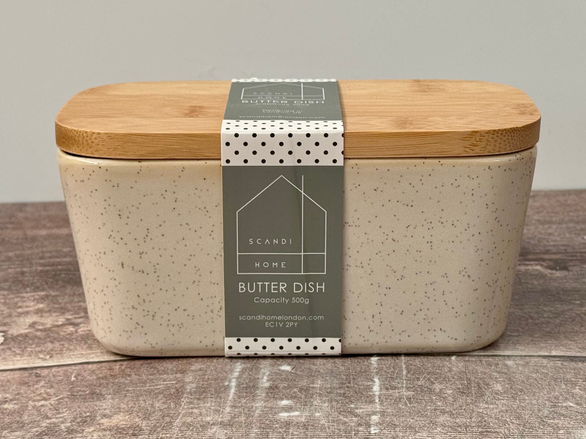 A cream butter dish with a wooden lid that brings a homely touch to the kitchen.