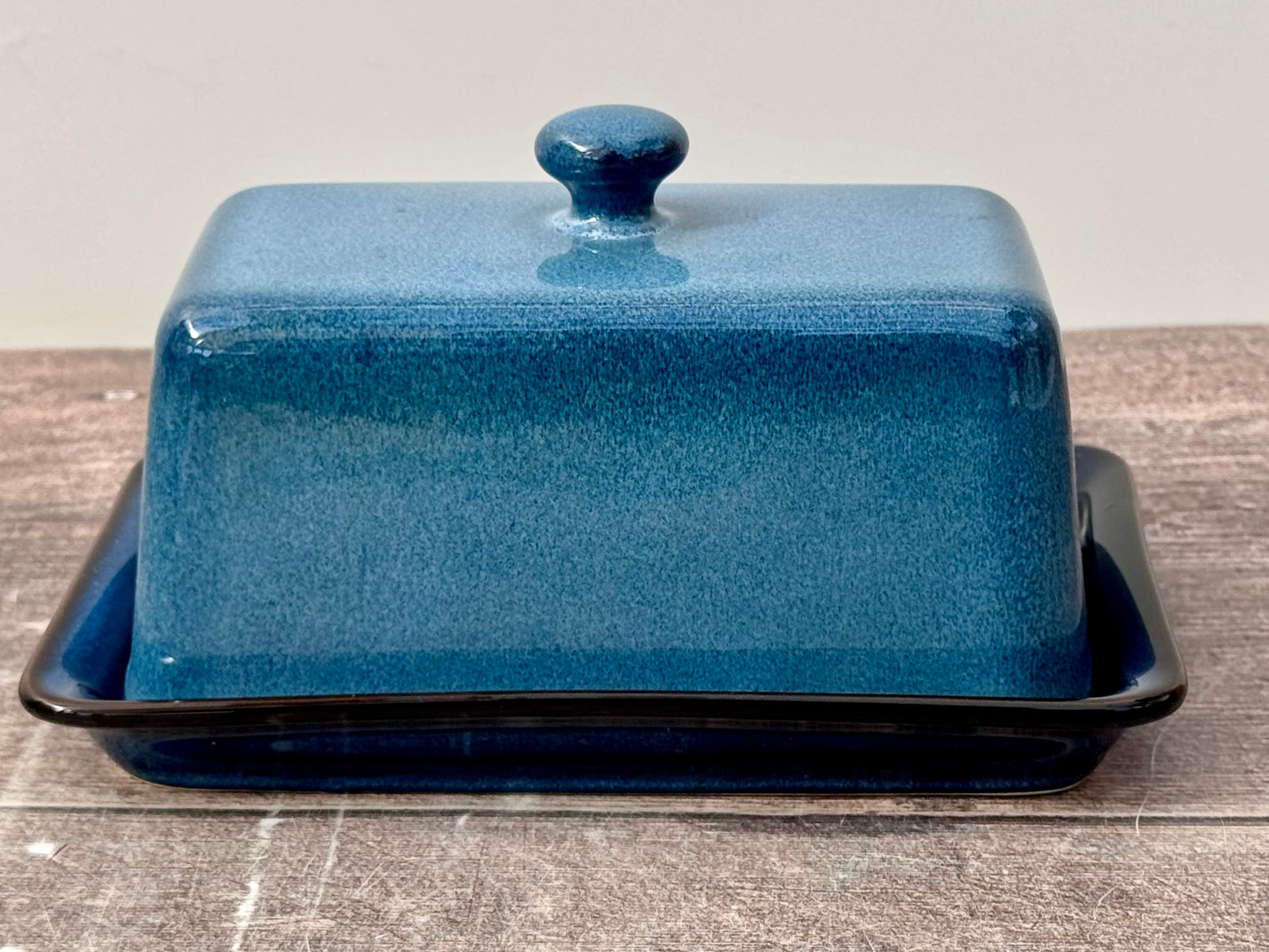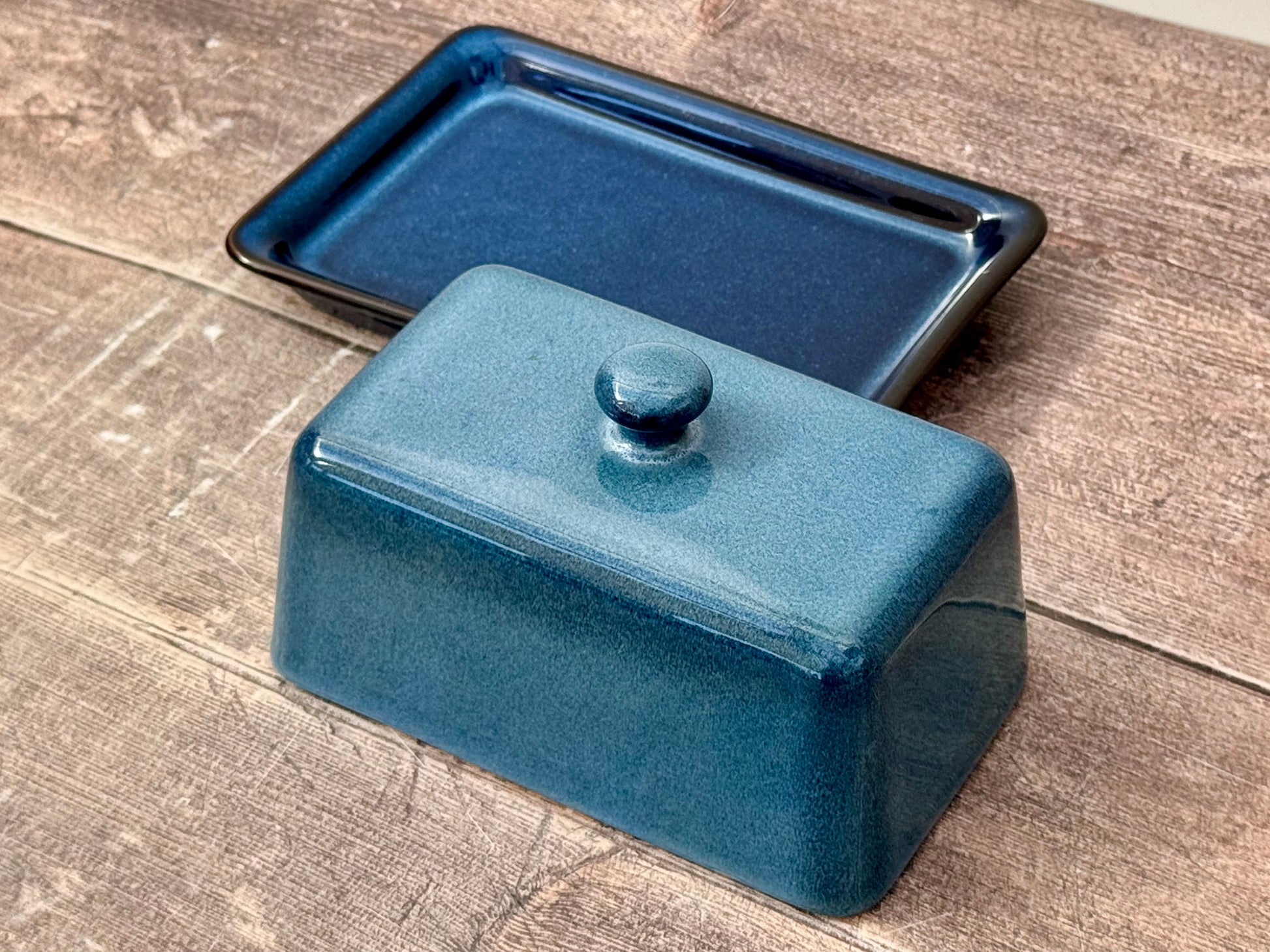 A pale blue ceramic butter dish that brings a homely touch to the kitchen.
