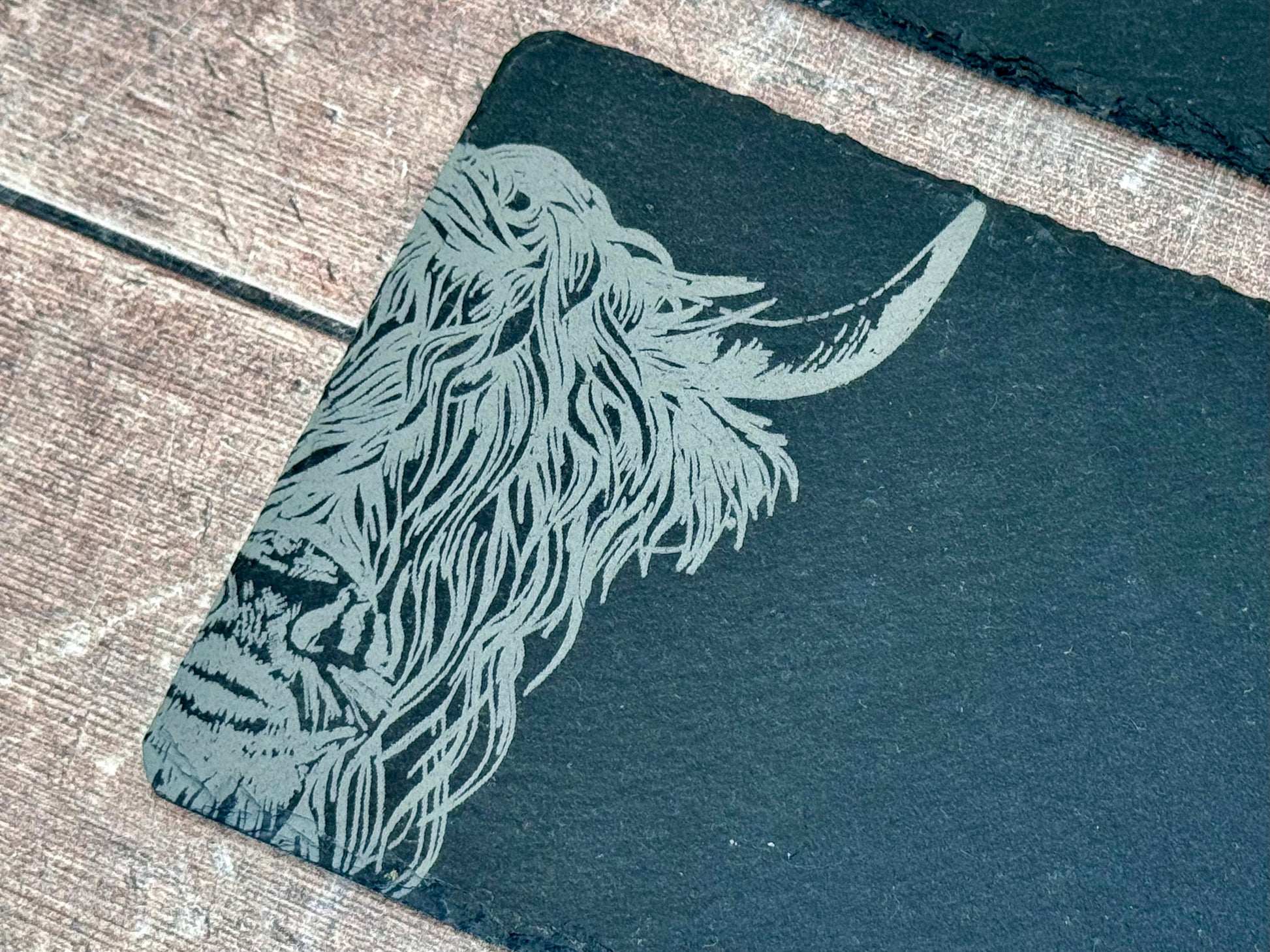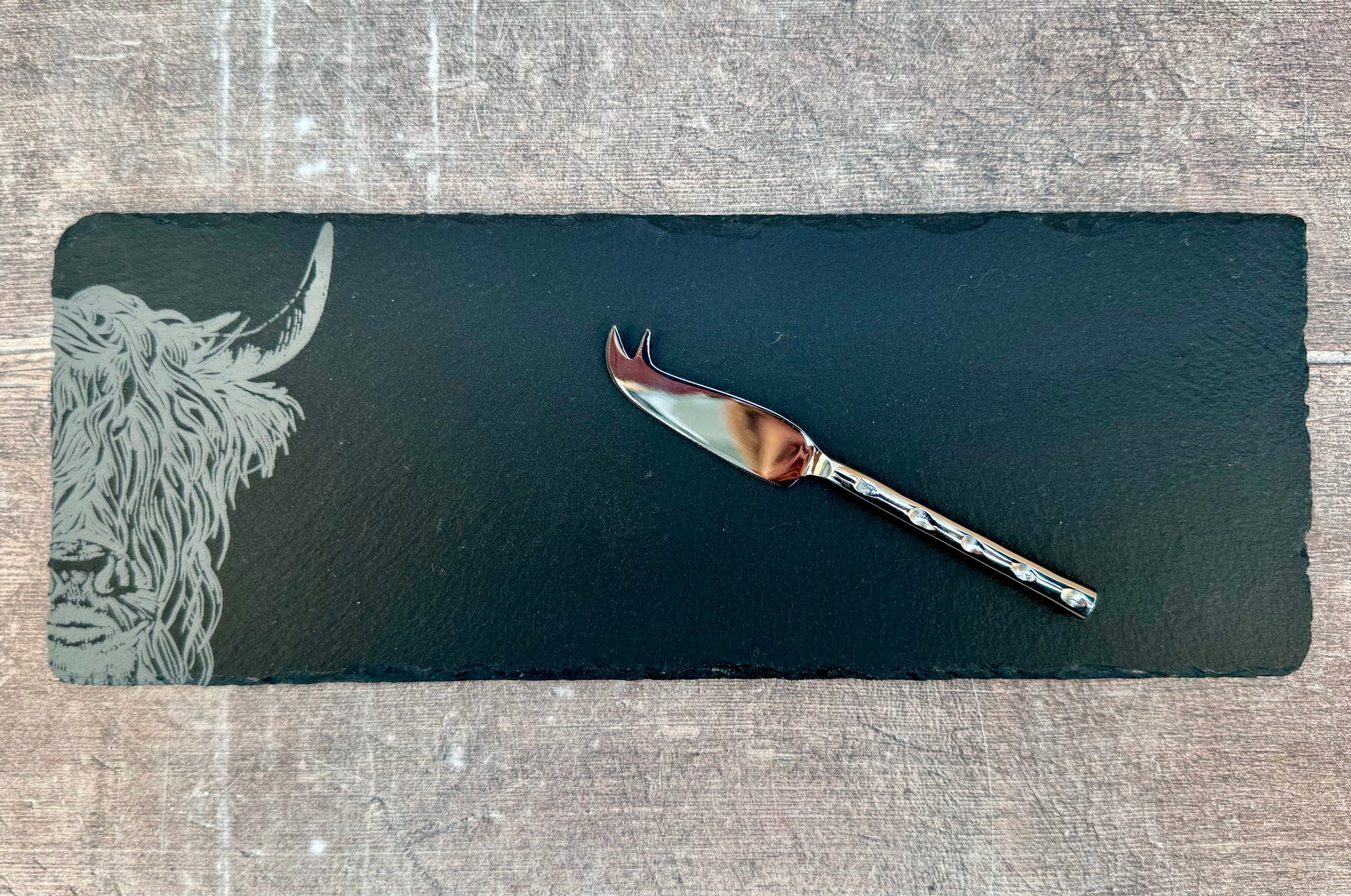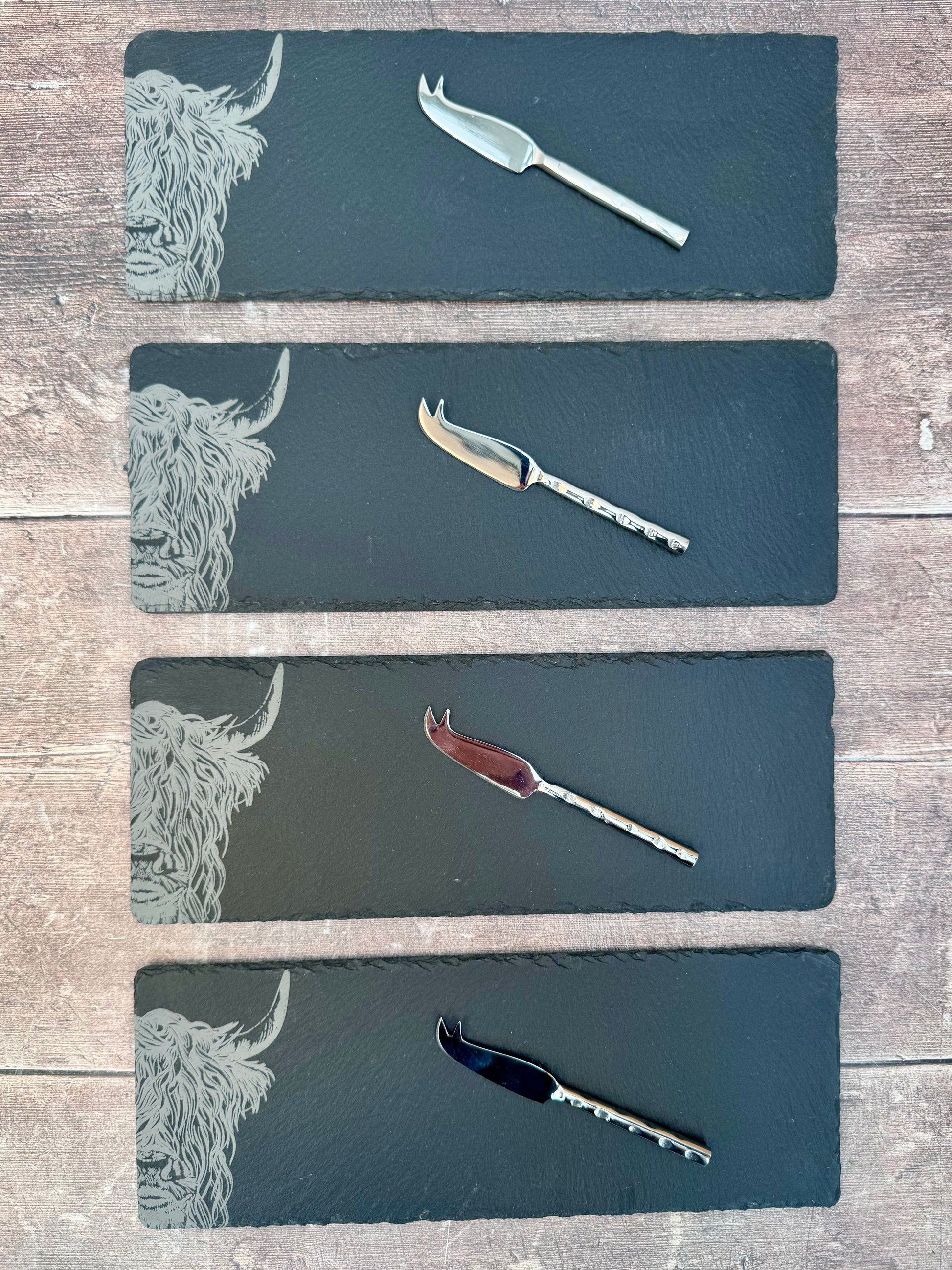 A set of 4 slate boards with a Highland Cow design and 4 mini cheese knives.