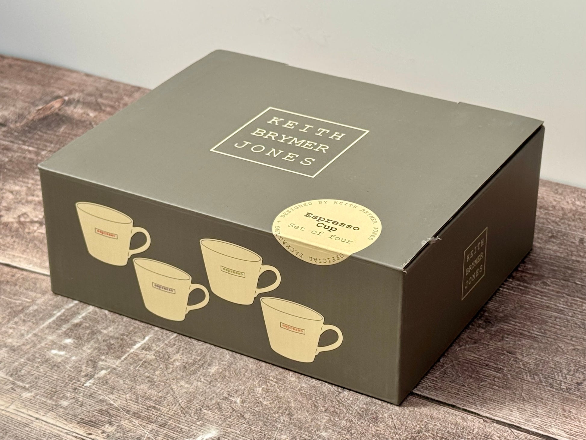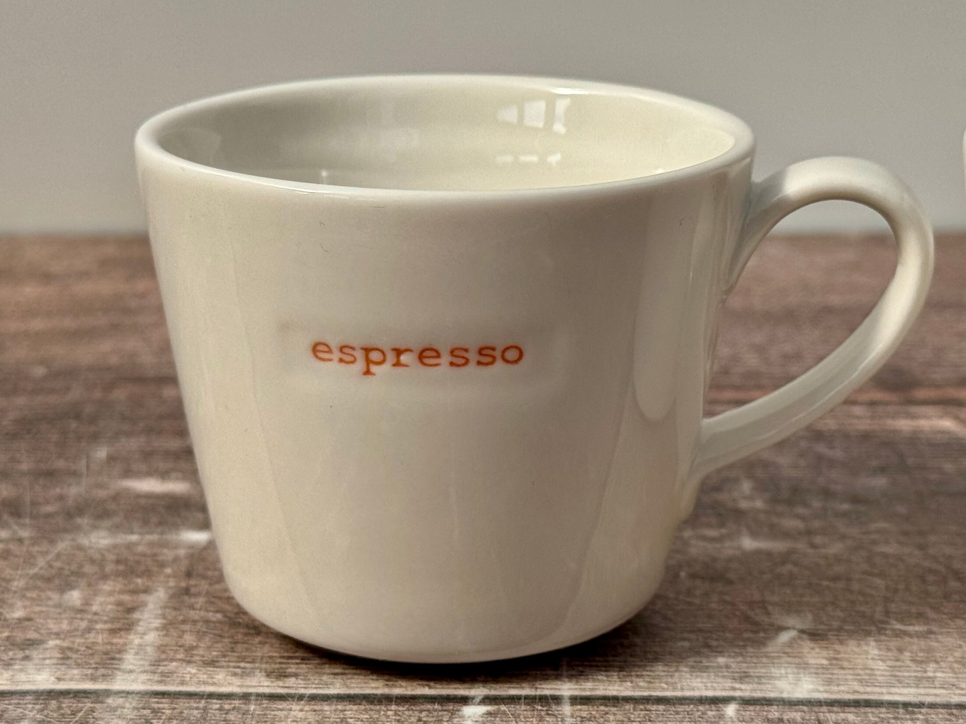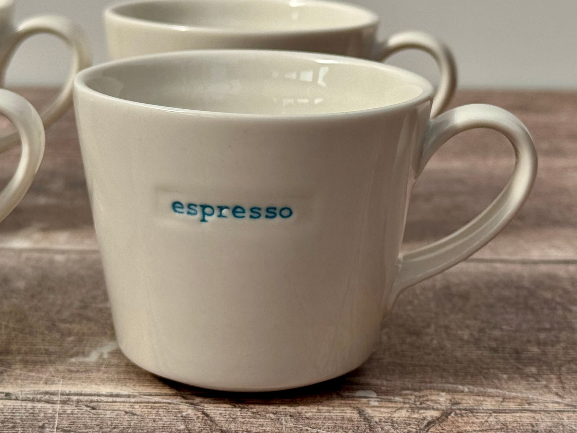 A white espresso mug with ‘espresso’ written on one side. Comes as a set of 4, including blue, green, orange and red writing.