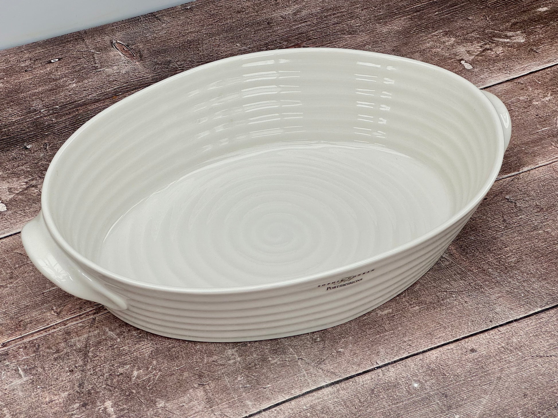 From Sophie Conran, this faint ribbed white oval oven dish is great to go from oven to table.