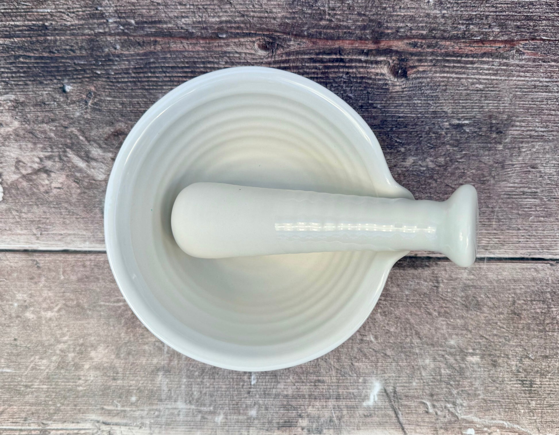 A stylish ribbed white ceramic pestle perfect for grinding food and spices.