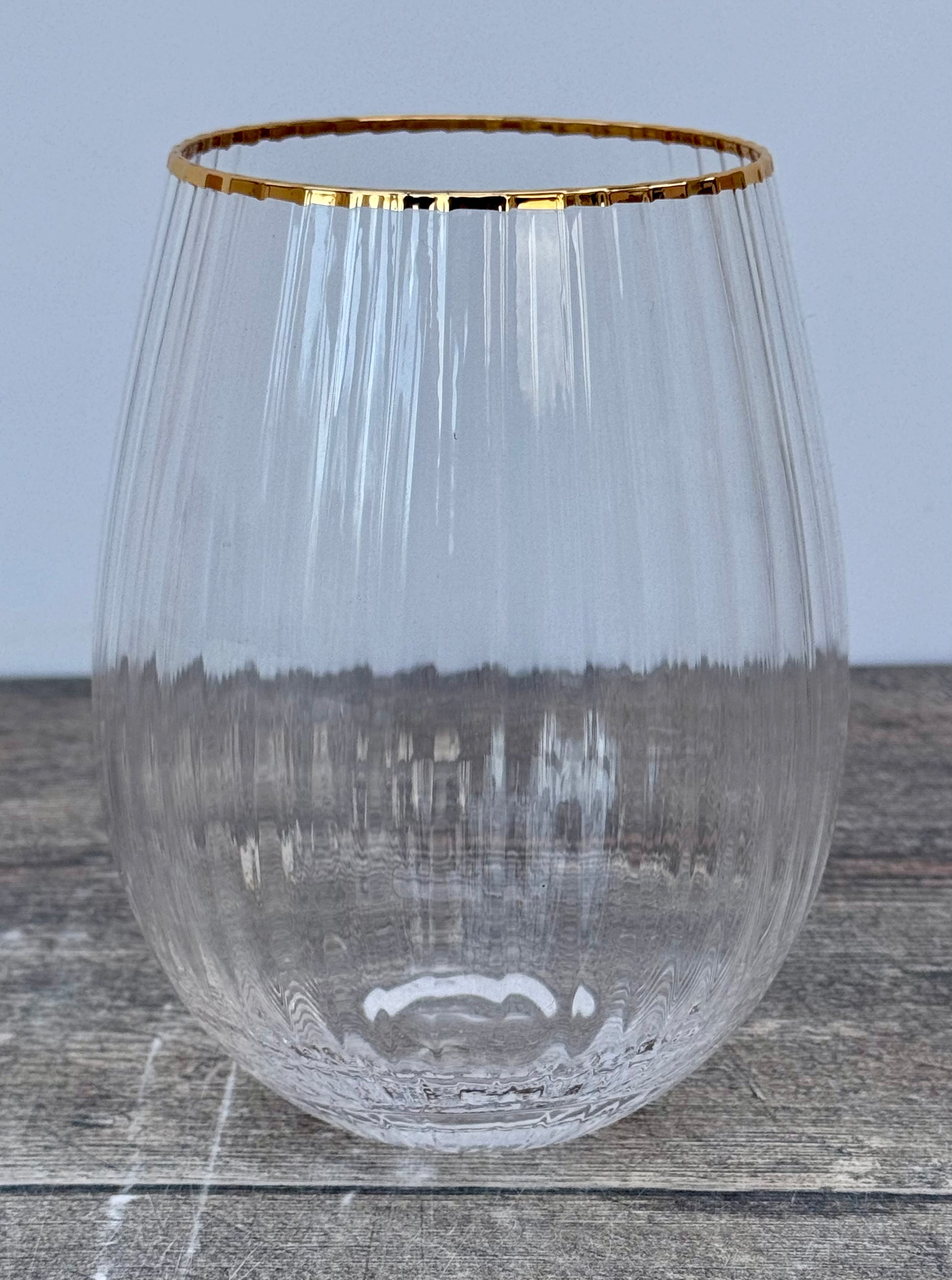 These stemless wine glasses feature a ribbed/linear design on the clear glass and have a gold rim.