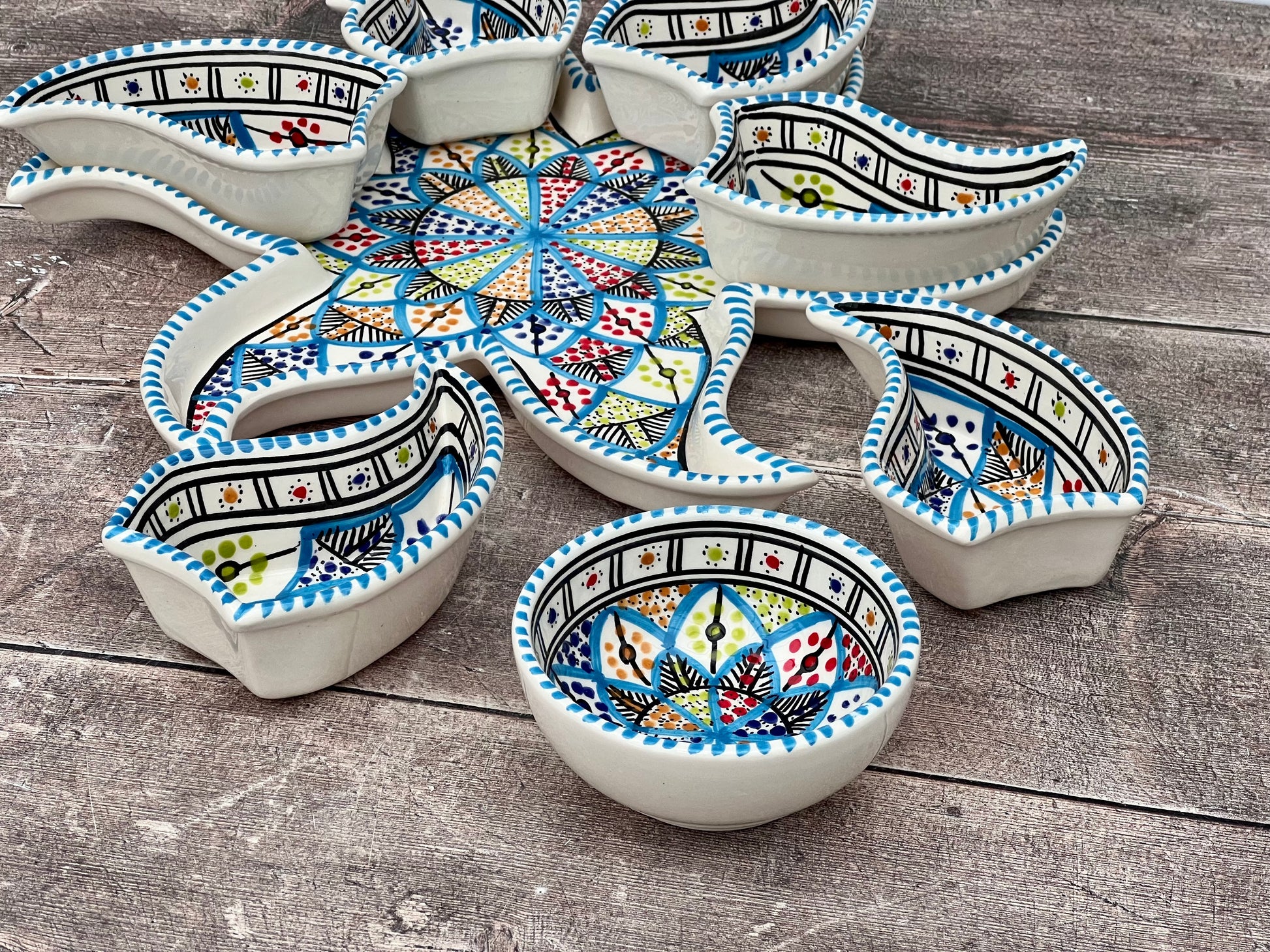 With a beautiful blue pattern design, this set of 7 serving dishes is perfect for serving snacks and dips.