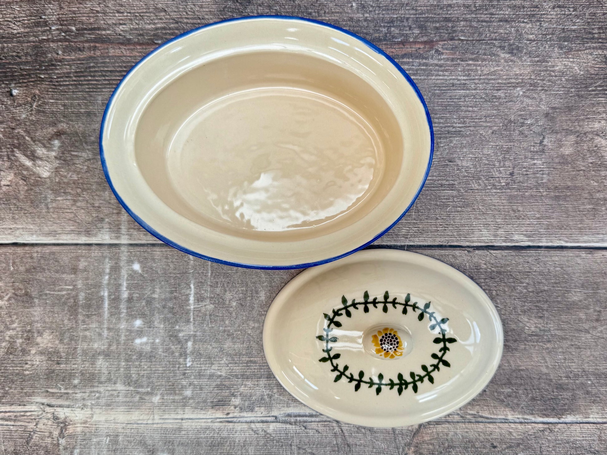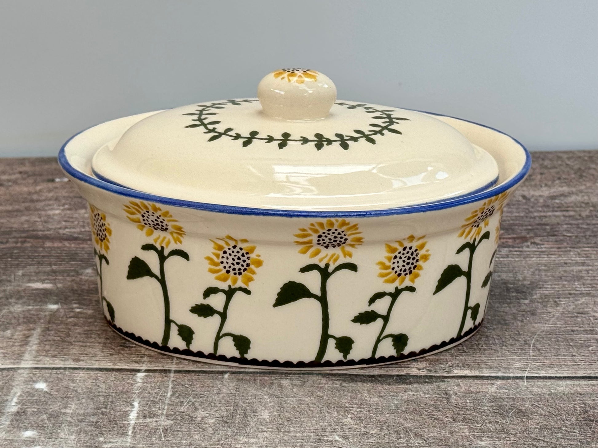 This oval shaped butter dish with delicate sunflower design will add a touch of style to any table.