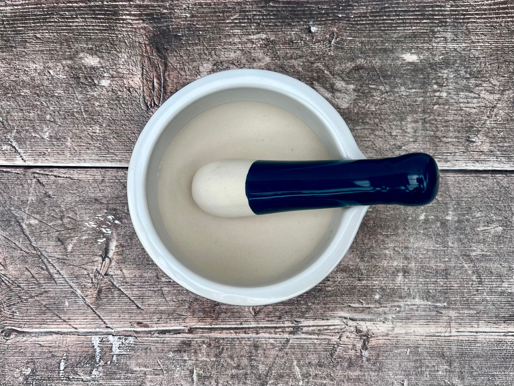 Made from stoneware, this teal pestle and mortar has a gloss outer edge for a modern finish.