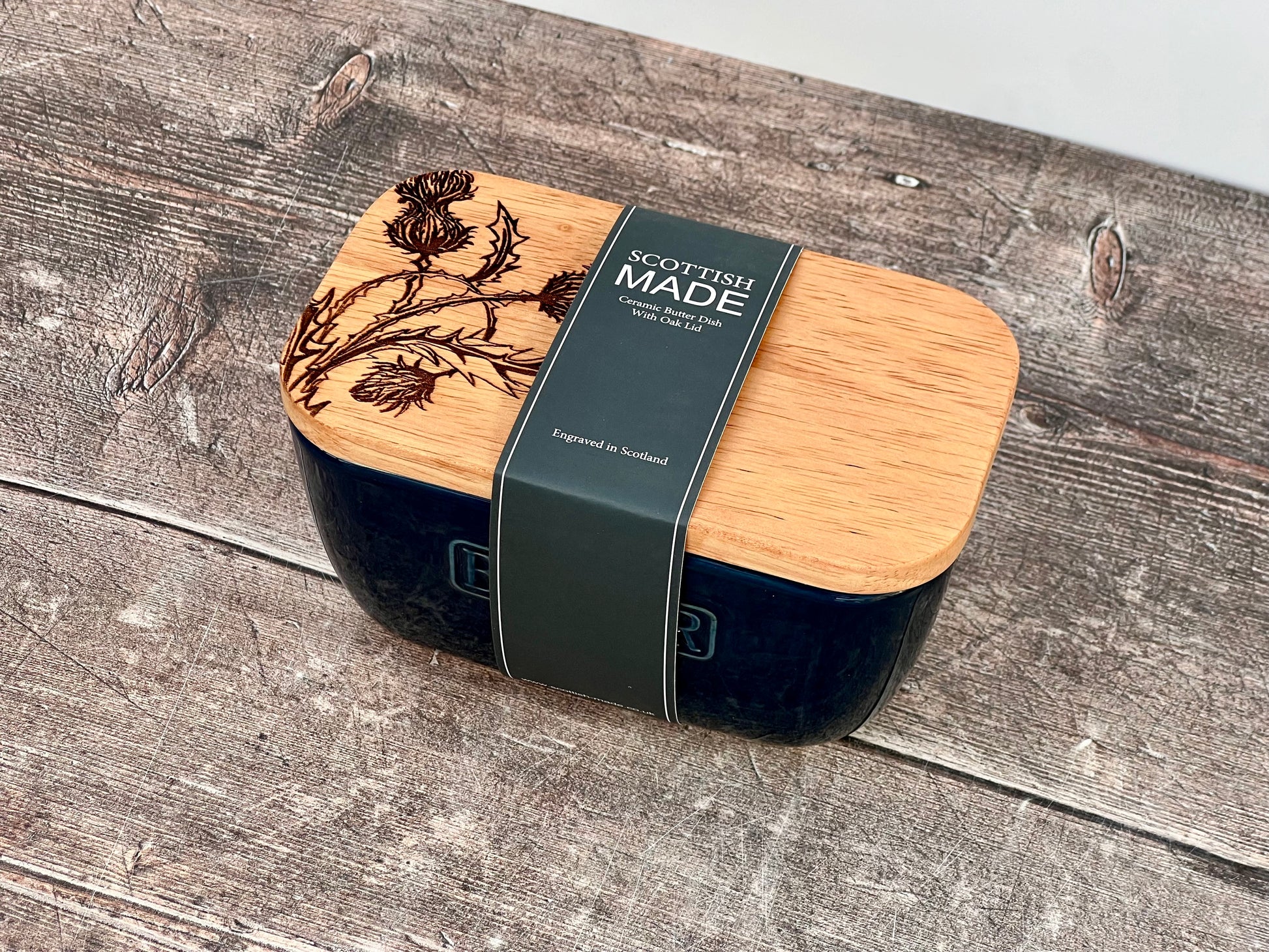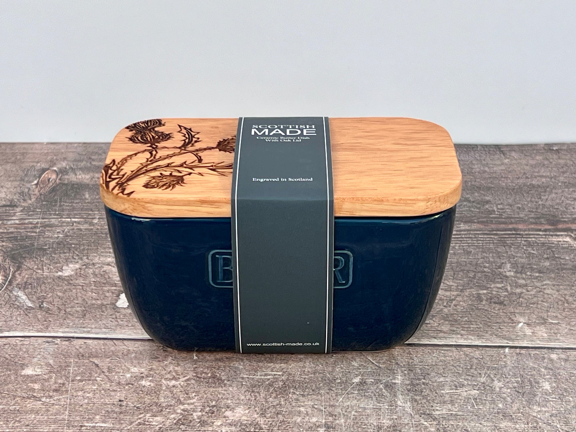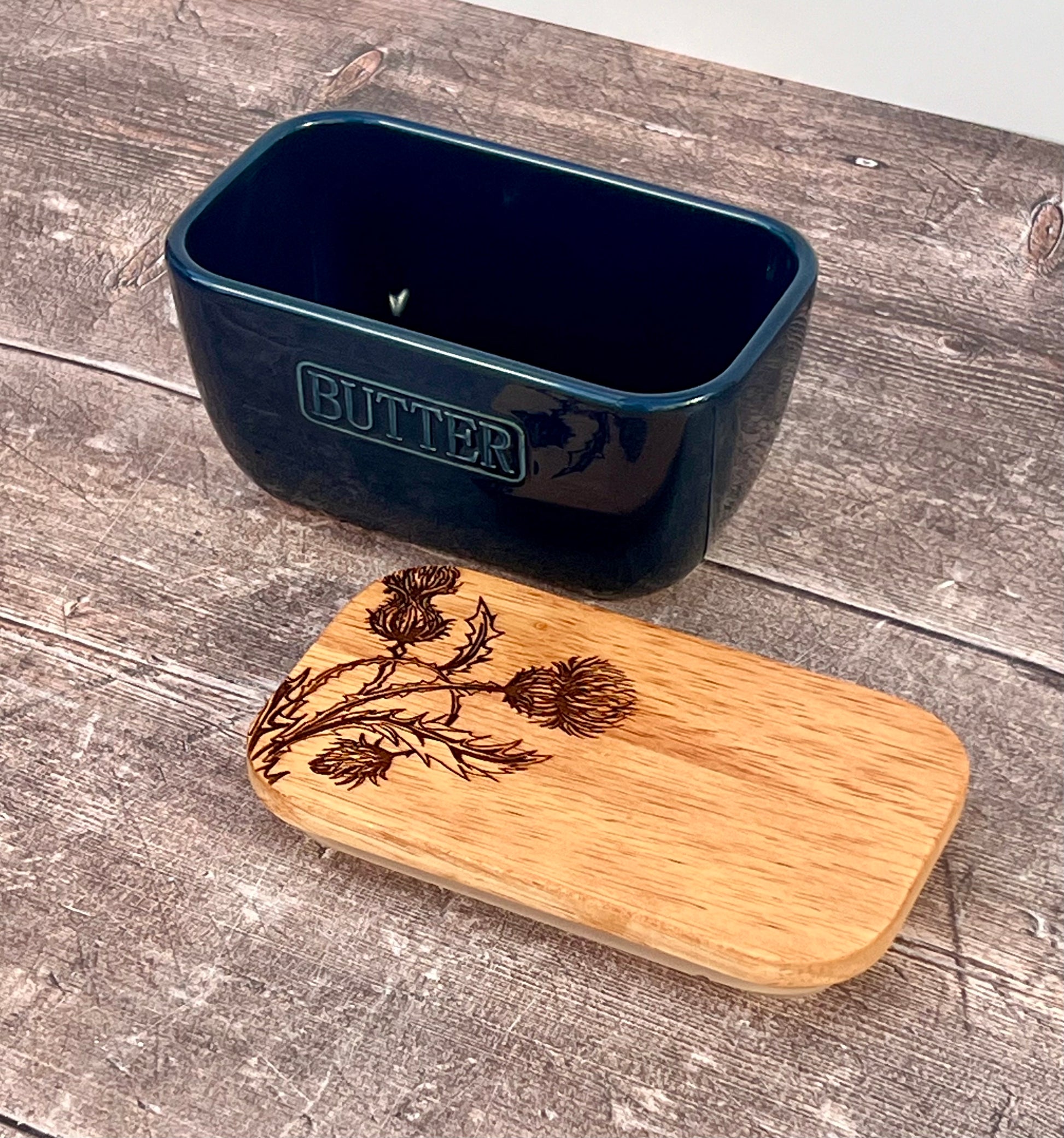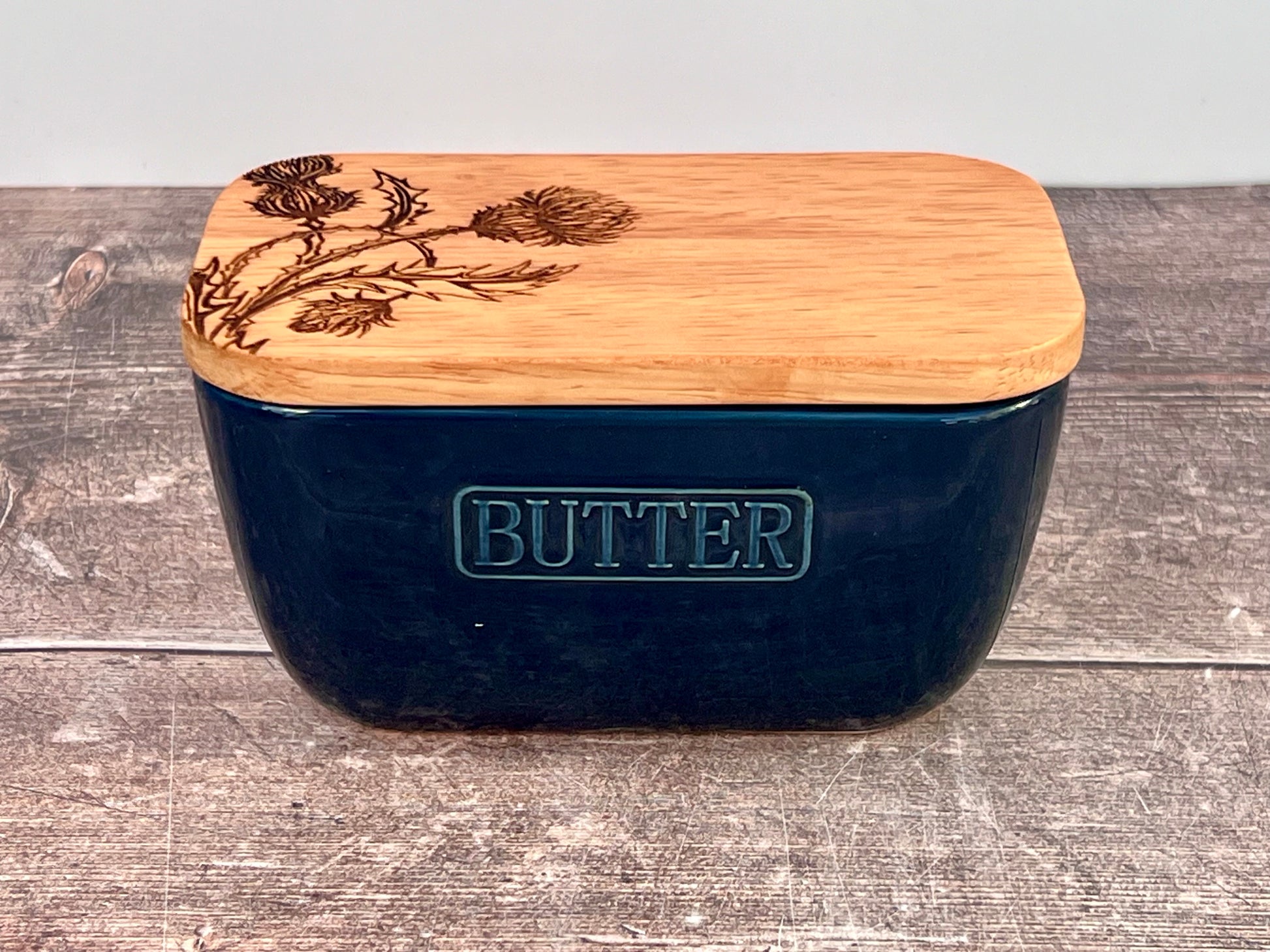 Engraved with a thistle design, this blue butter dish brings a homely touch to the kitchen.
