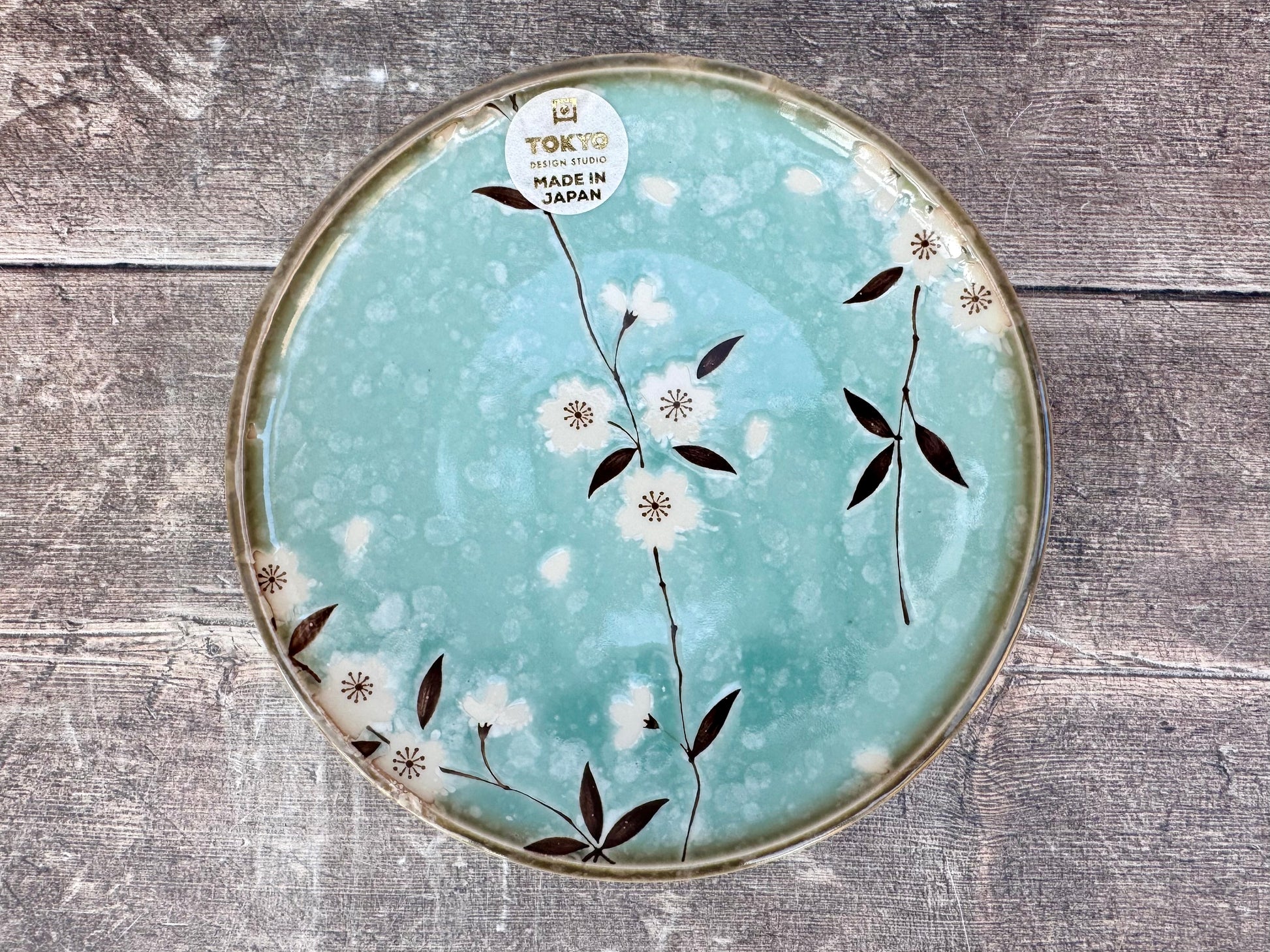 Made in Japan, these plates have a glossy turquoise finish, with an beautiful white sakura/cherry blossom flower pattern. They make a stunning addition to any table.